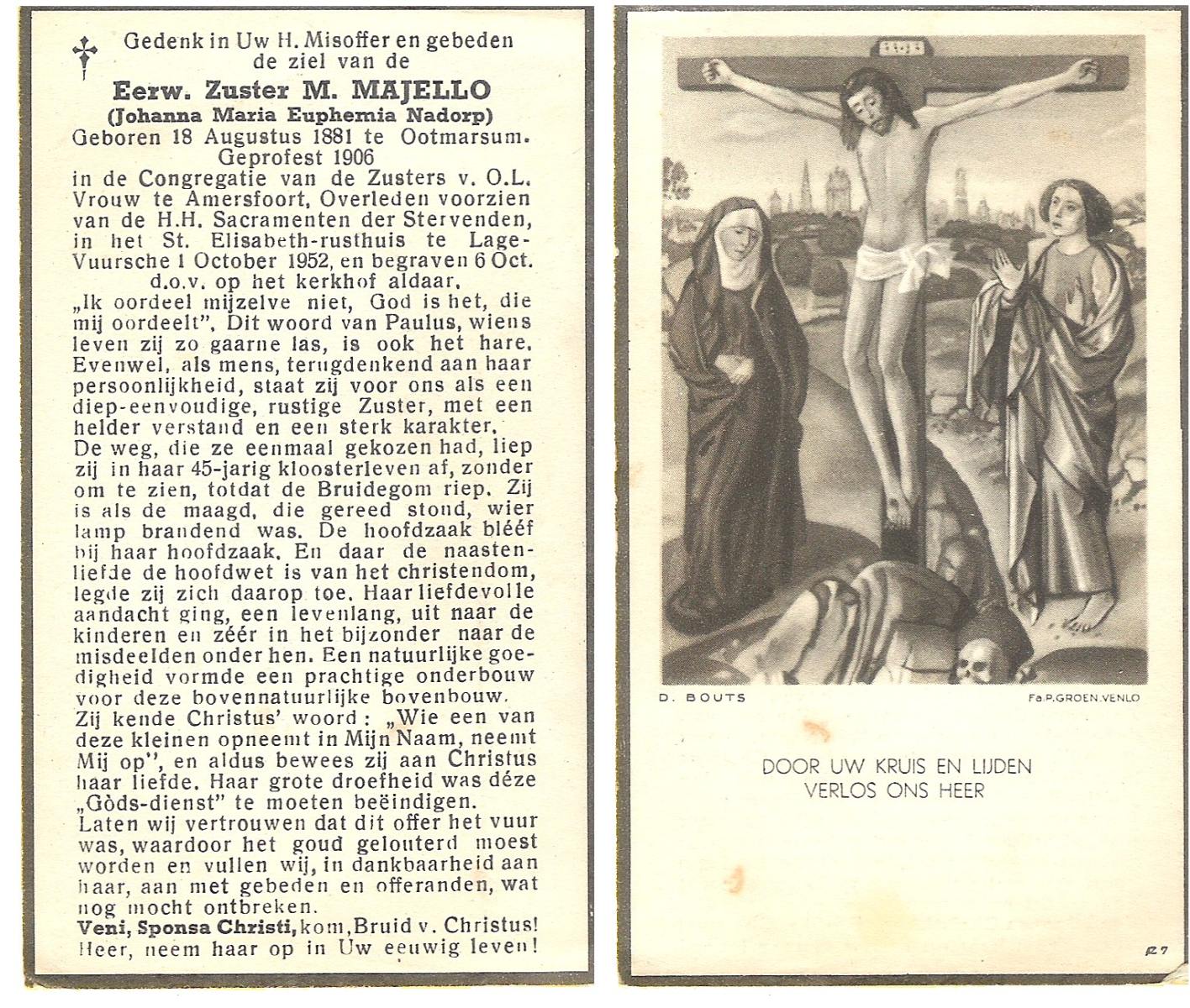 NADORP, Johanna Maria Euphemia, geboren op 18-08-1881 te Ootmarsum, overleden op 1-10-1952 te Lage Vuursche op 71-jarige leeftijd, begraven op 6-10-1952 te Lage Vuursche.