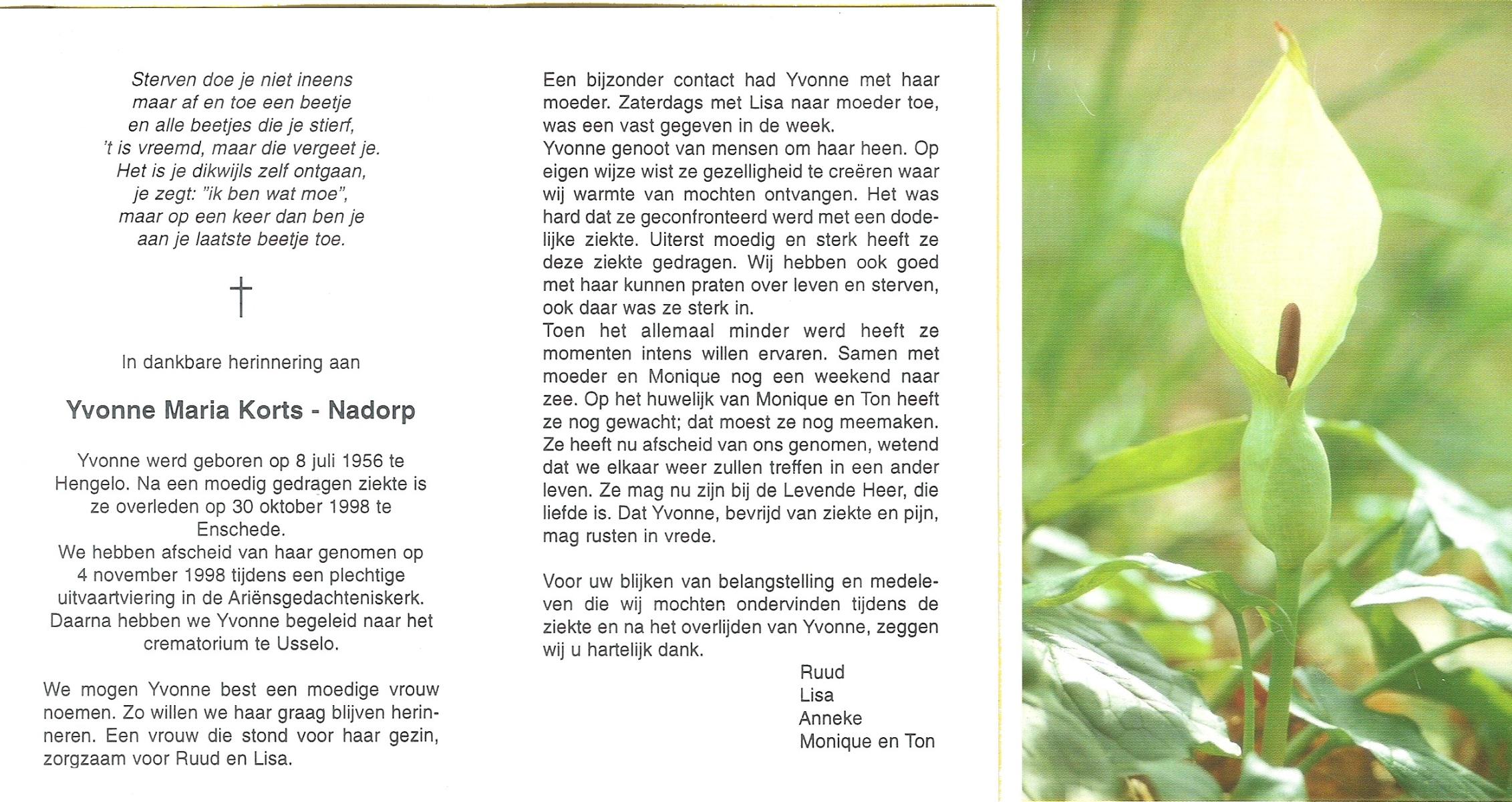 NADORP, Yvonne Maria, geboren op 8-7-1956 te Hengelo (O), overleden op 30-10-1998 te Enschede op 42-jarige leeftijd, gecremeerd op 4-11-1998 te Usselo.