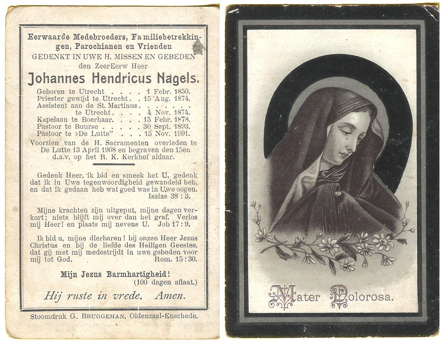 NAGELS, Johannes Hendricus, geboren op 01-02-1850 te Utrecht, overleden op 13-4-1908 te De Lutte op 58-jarige leeftijd, begraven op 15-4-1908 te De Lutte.