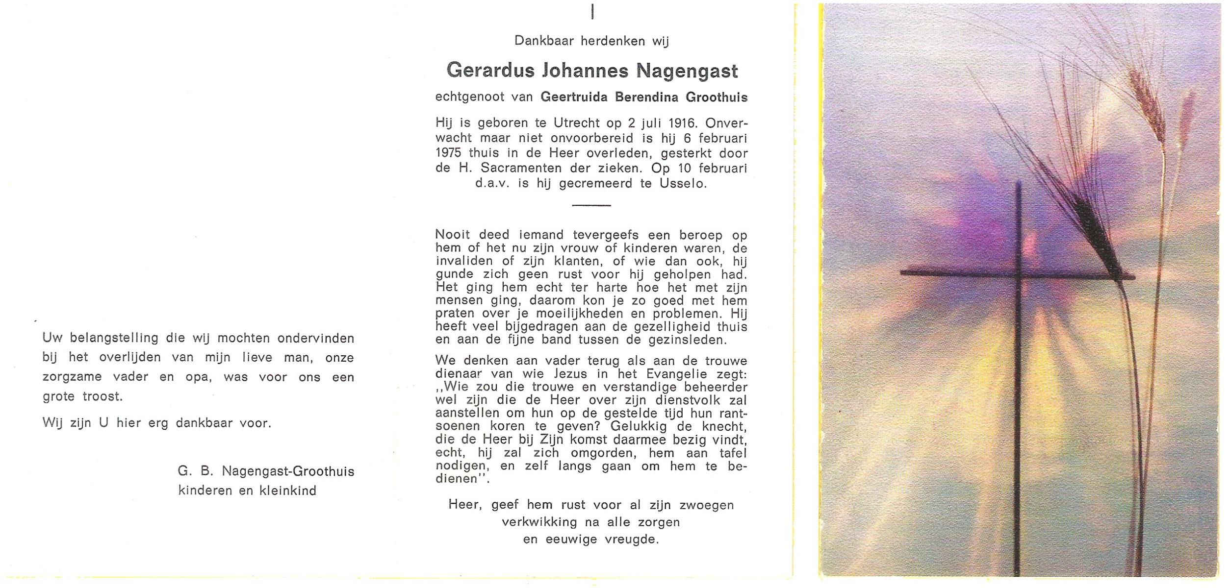 NAGENGAST, Gerardus Johannes, geboren op 2-7-1916 te Utrecht, overleden op 6-2-1975 op 58-jarige leeftijd, gecremeerd op 10-2-1975 te Usselo.