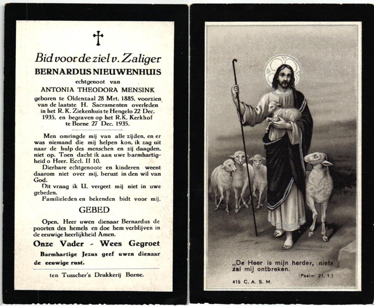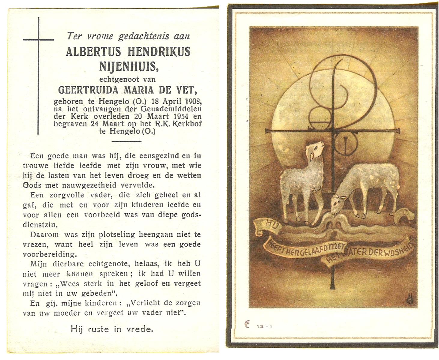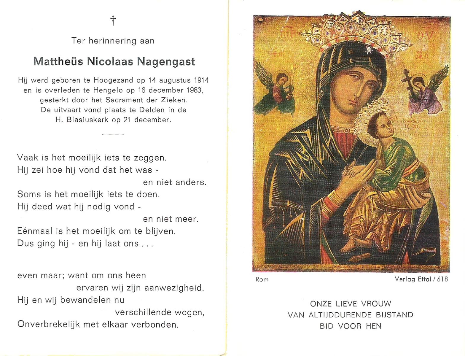 NAGENGAST, Mattheus Nicolaas, geboren op 14-8-1914 te Hoogezand, overleden op 16-12-1983 te Hengelo (Ov.) op 69-jarige leeftijd, begraven op 21-12-1983 te Delden.
