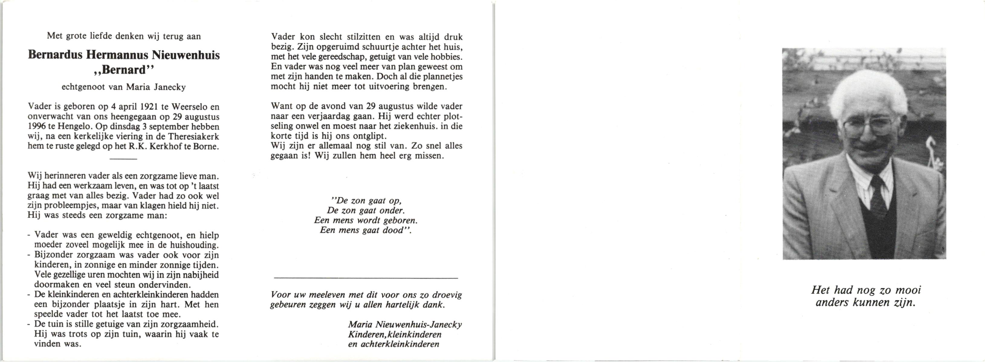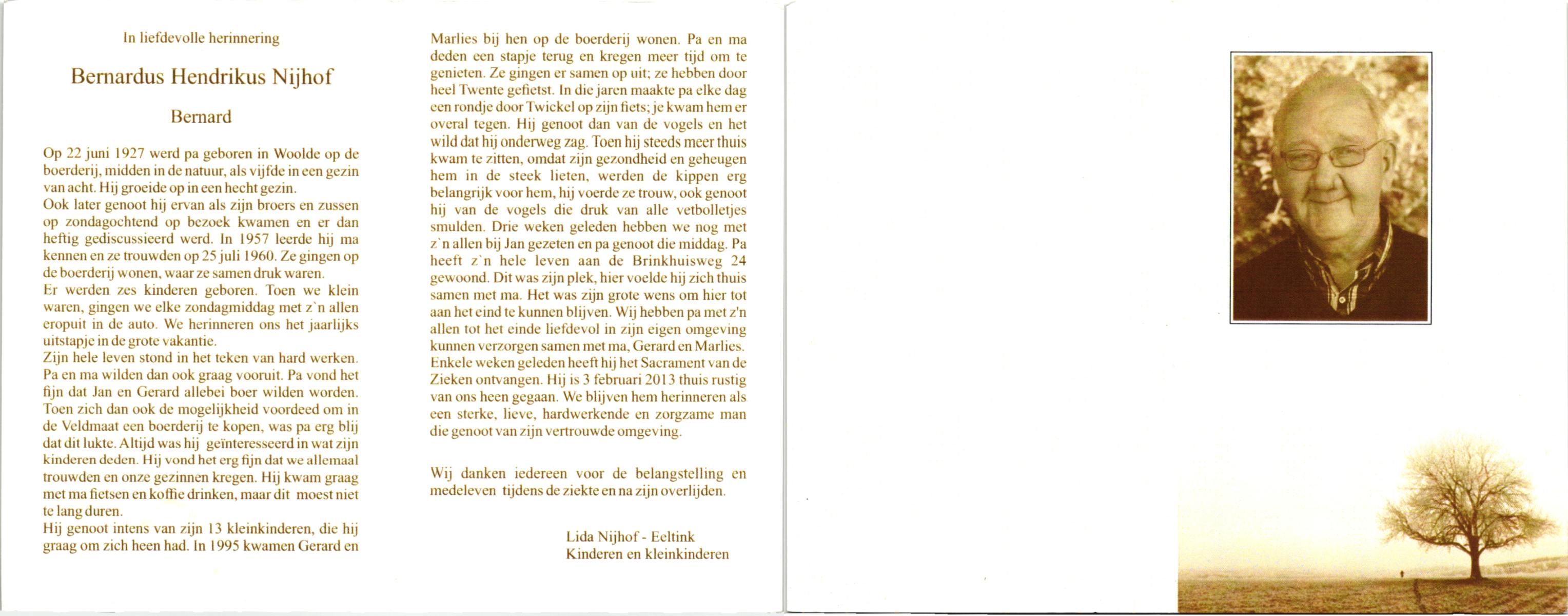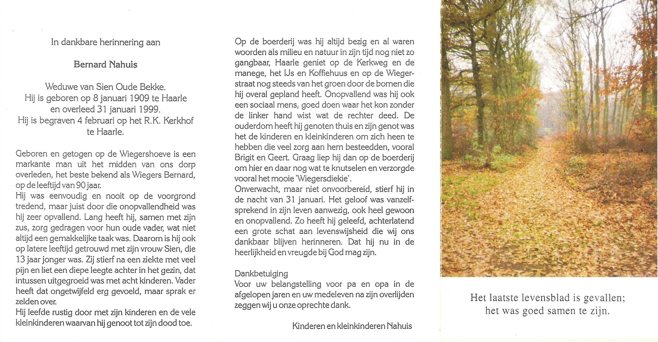 NAHUIS, Bernard, geboren op 8-1-1909 te Haarle, overleden op 31-1-1999 te Haarle op 90-jarige leeftijd, begraven op 4-2-1999 te Hellendoorn, Haarle.
