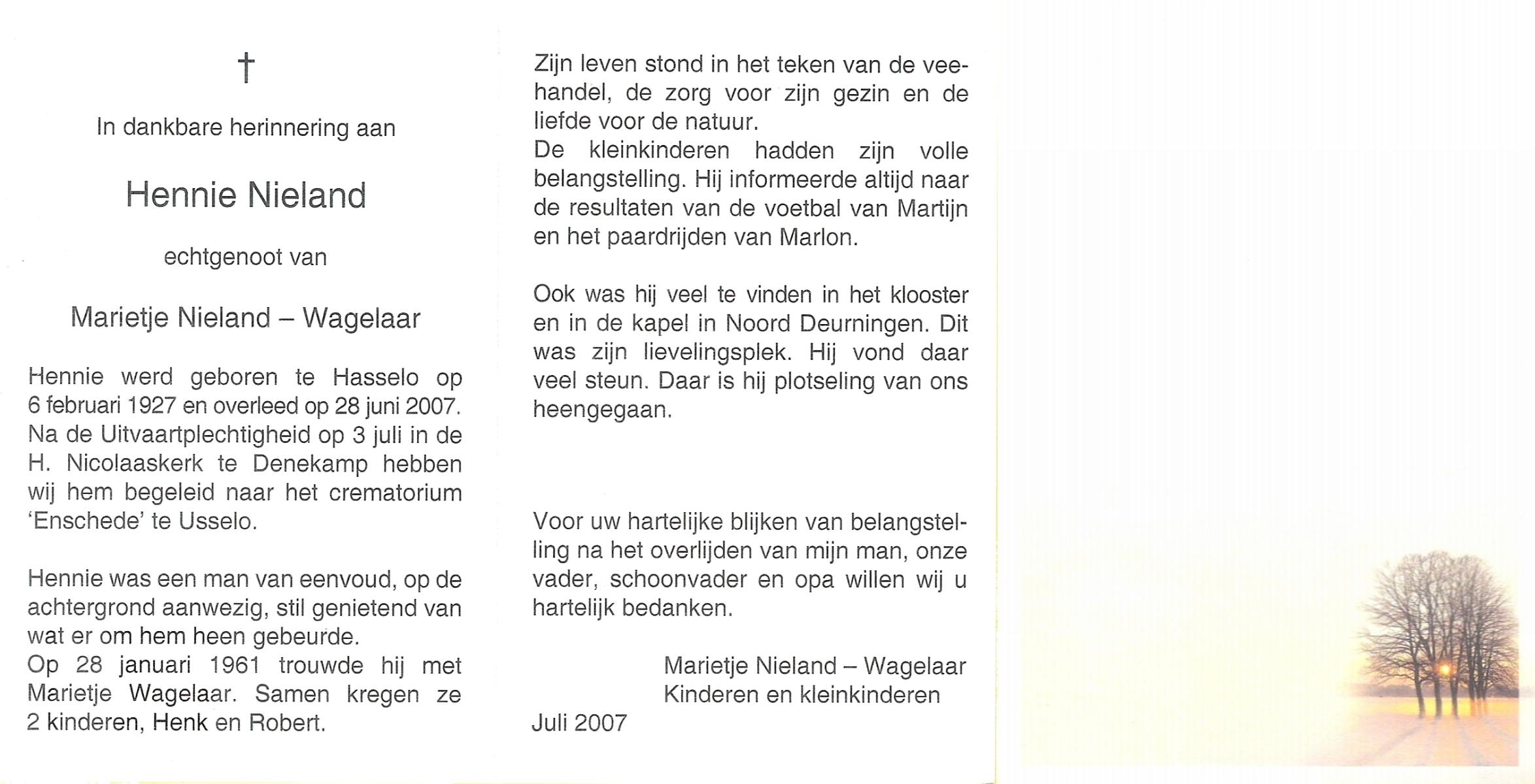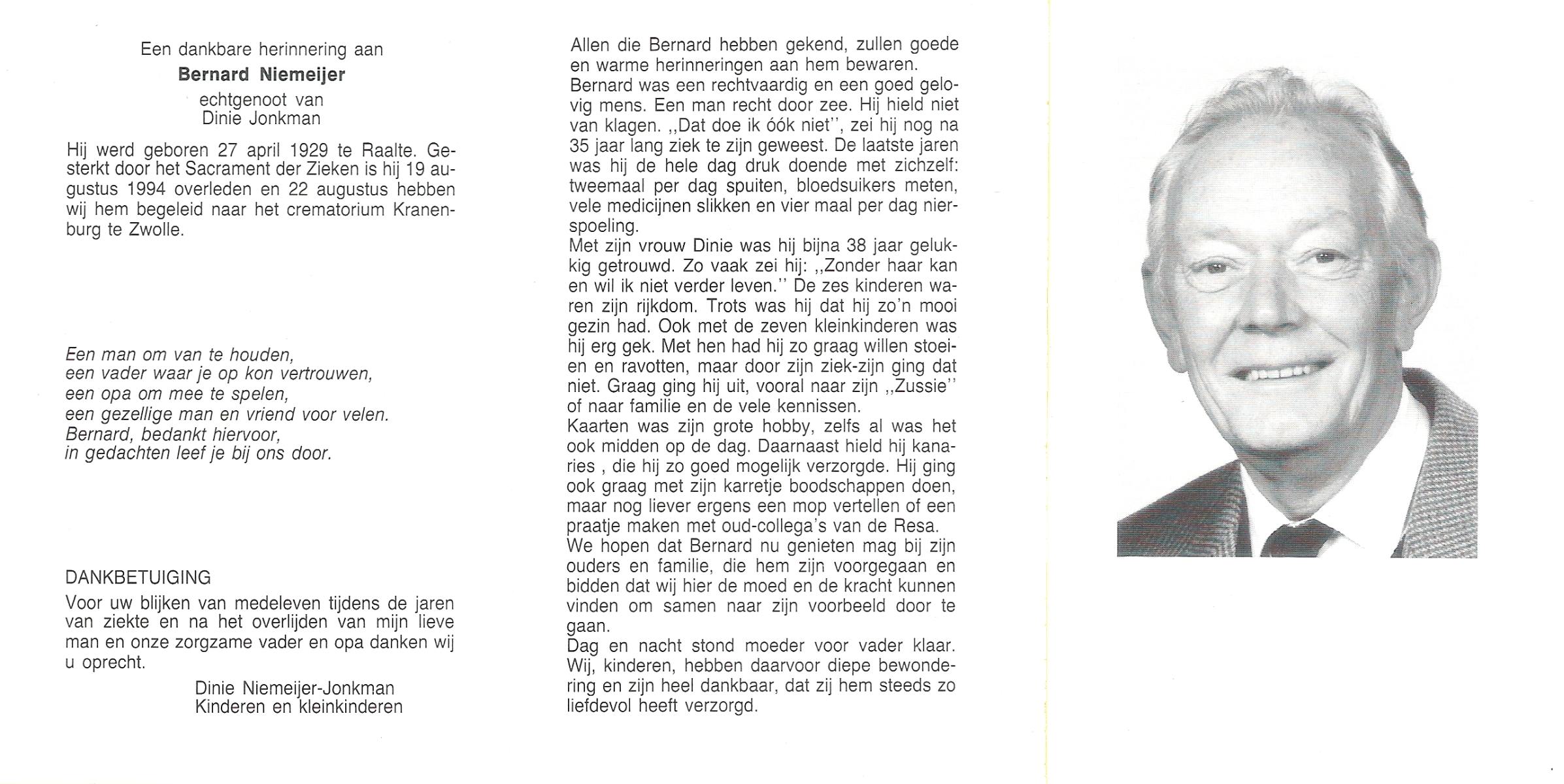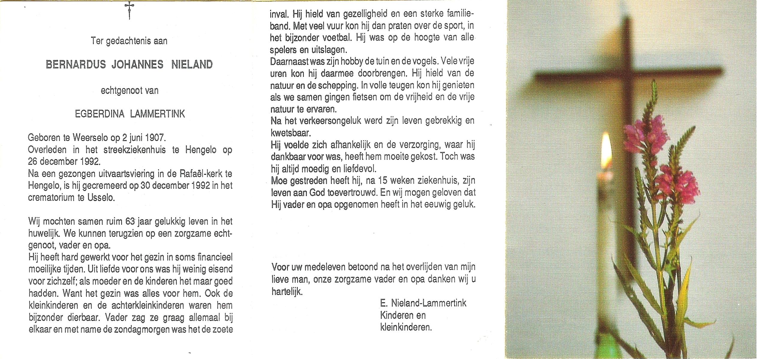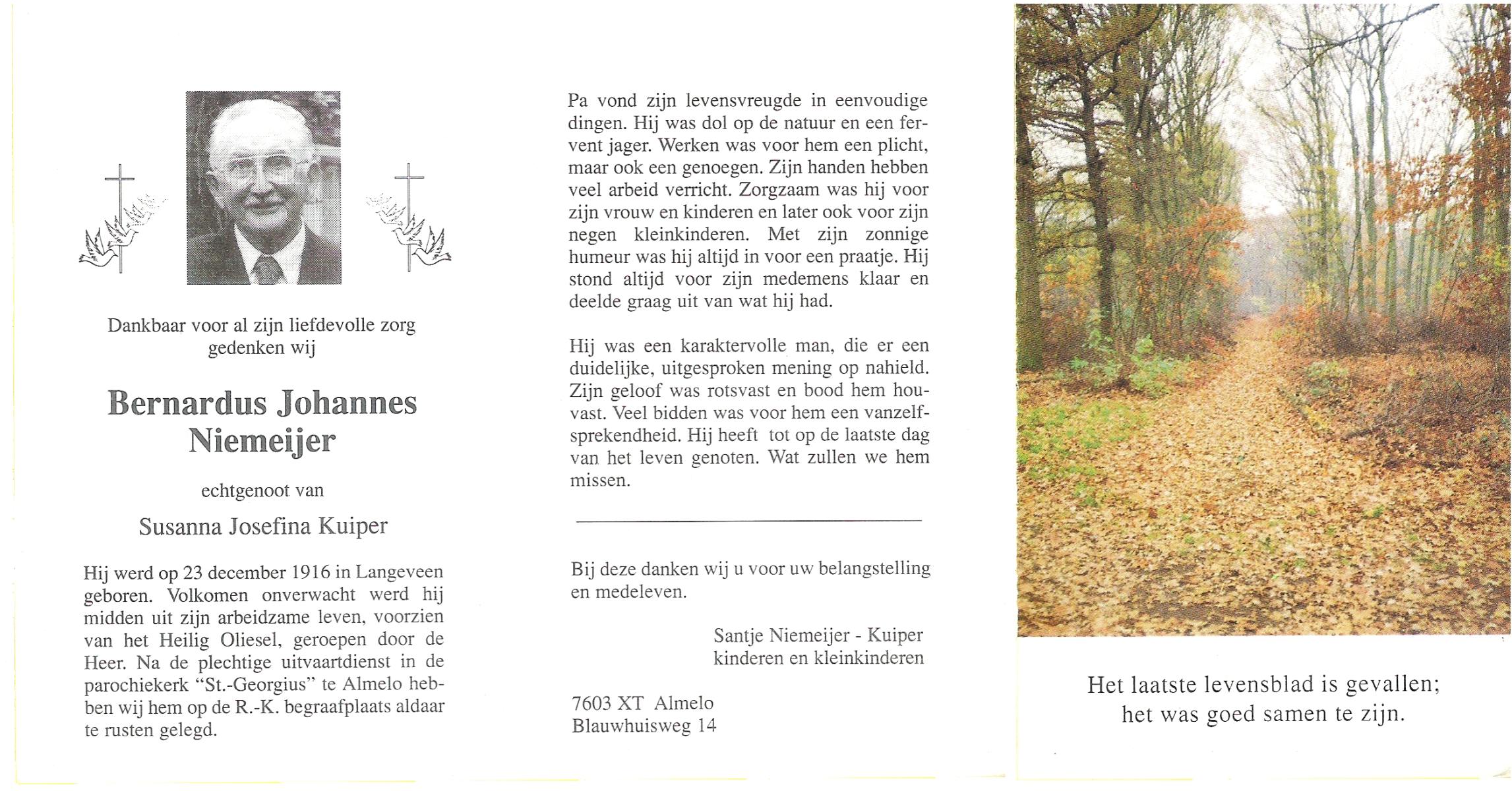 NAHUIS, Bernard, geboren op 8-1-1909 te Haarle, overleden op 31-1-1999 te Haarle op 90-jarige leeftijd, begraven op 4-2-1999 te Hellendoorn, Haarle.
