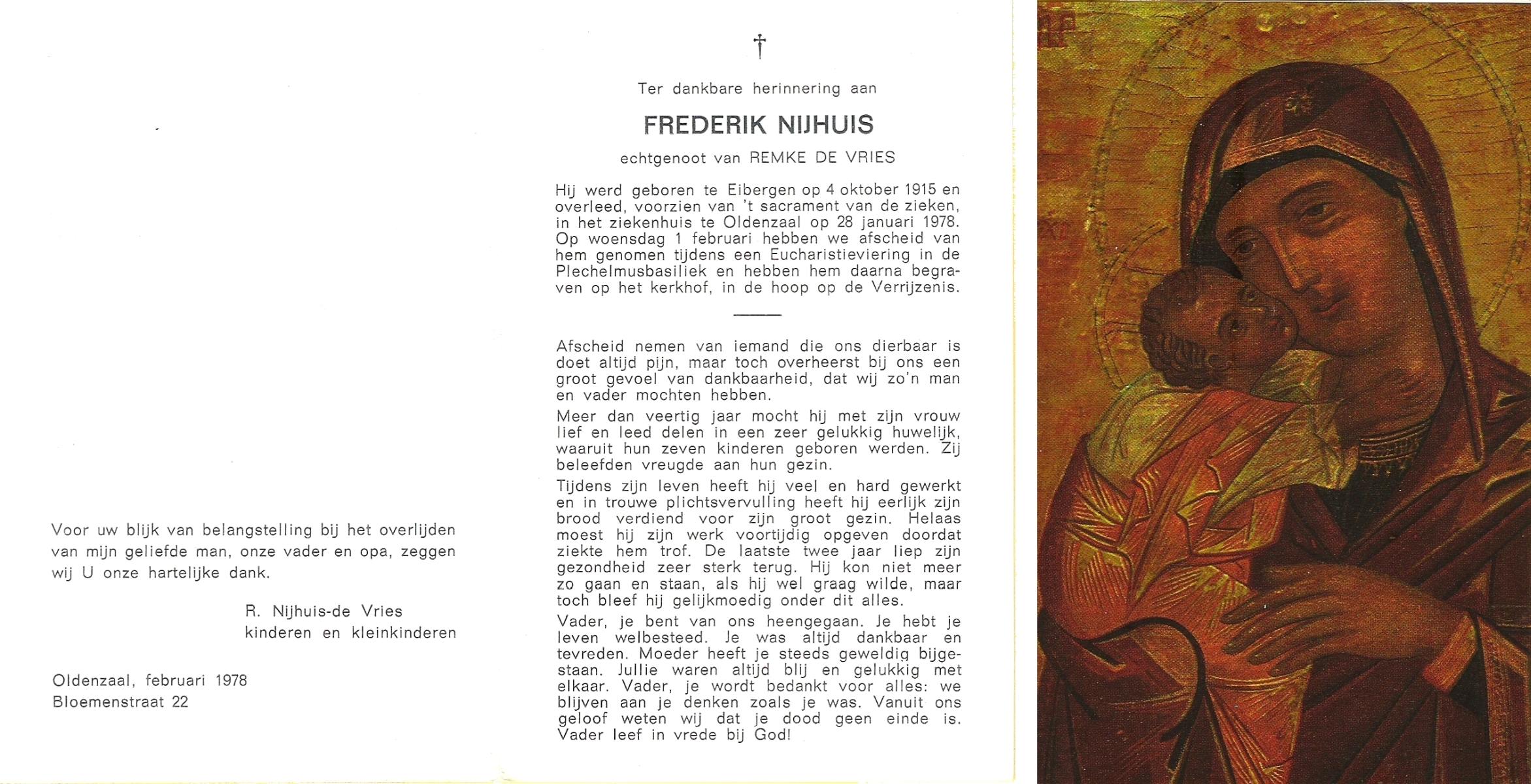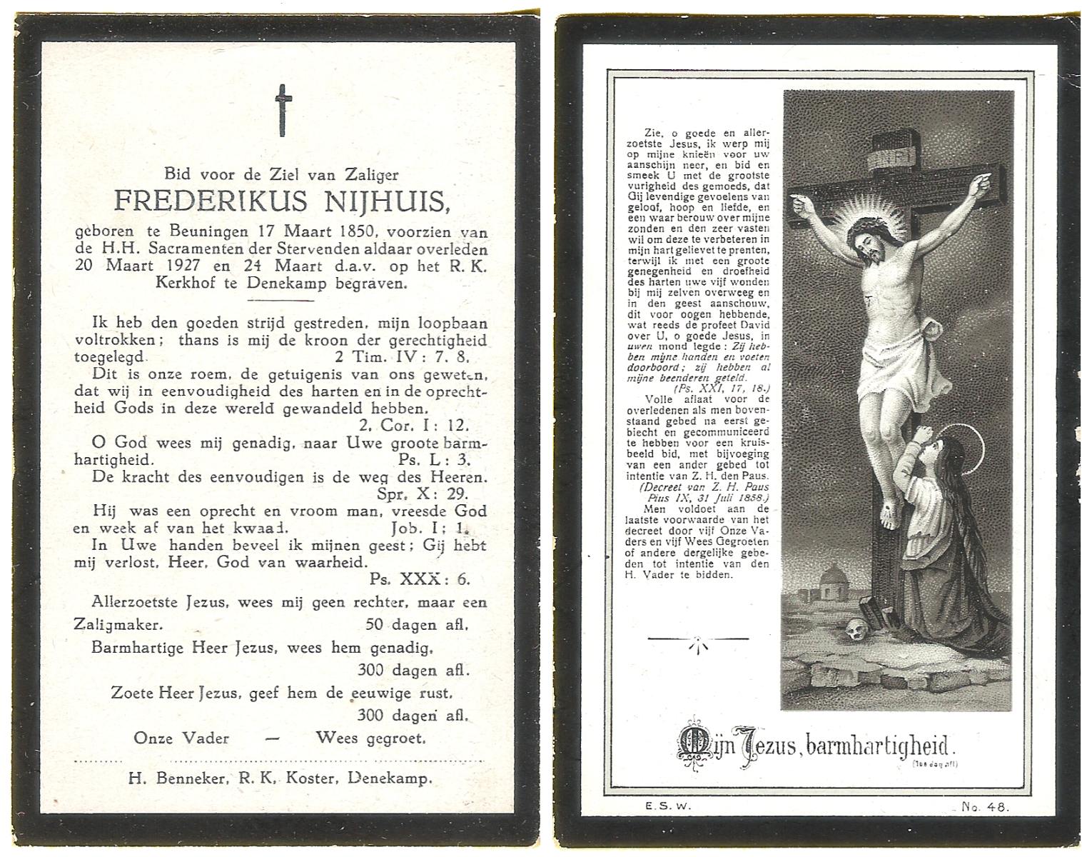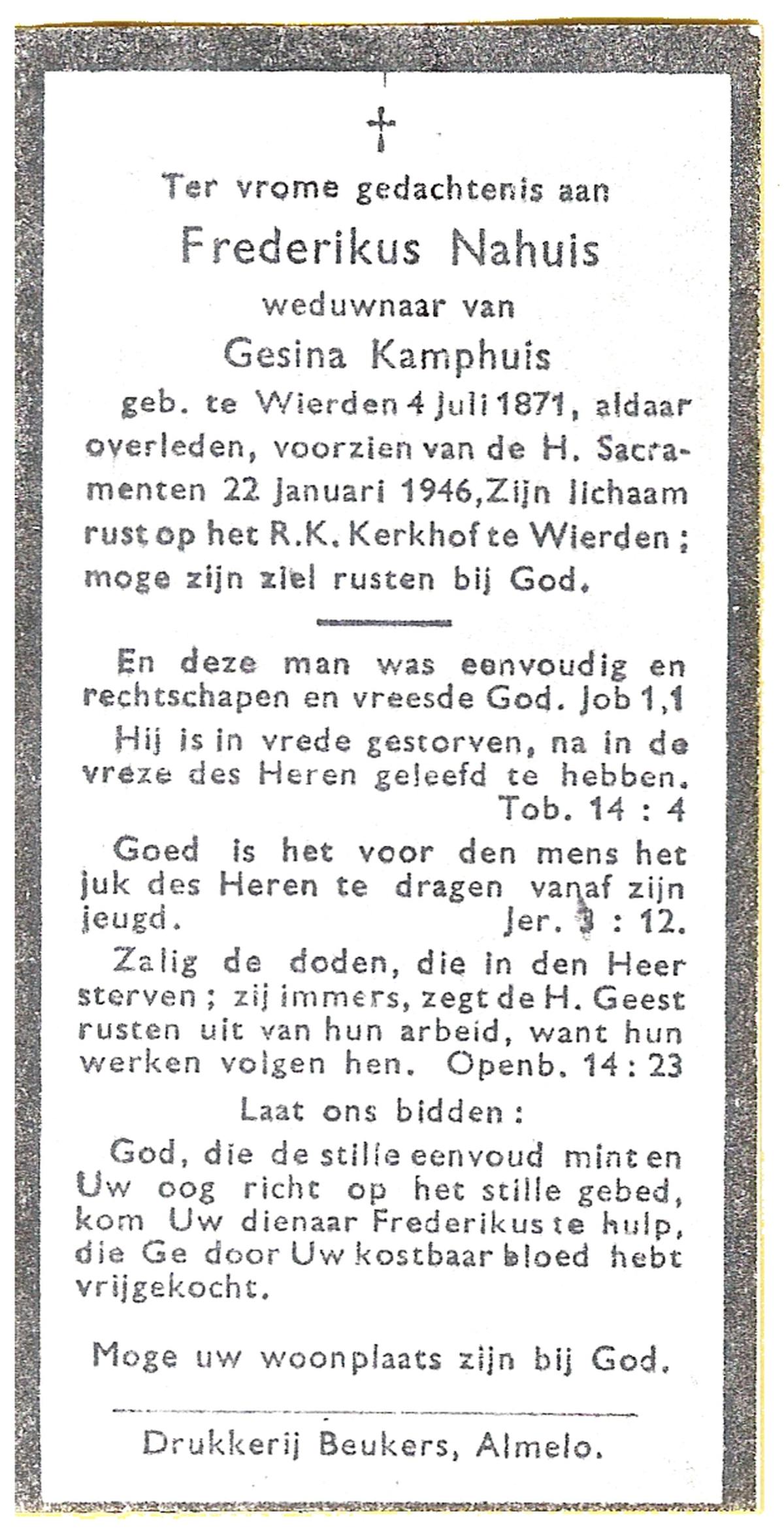NAHUIS, Frederikus, geboren op 04-07-1871 te Wierden, overleden op 22-1-1946 te Wierden op 74-jarige leeftijd, begraven te Wierden.