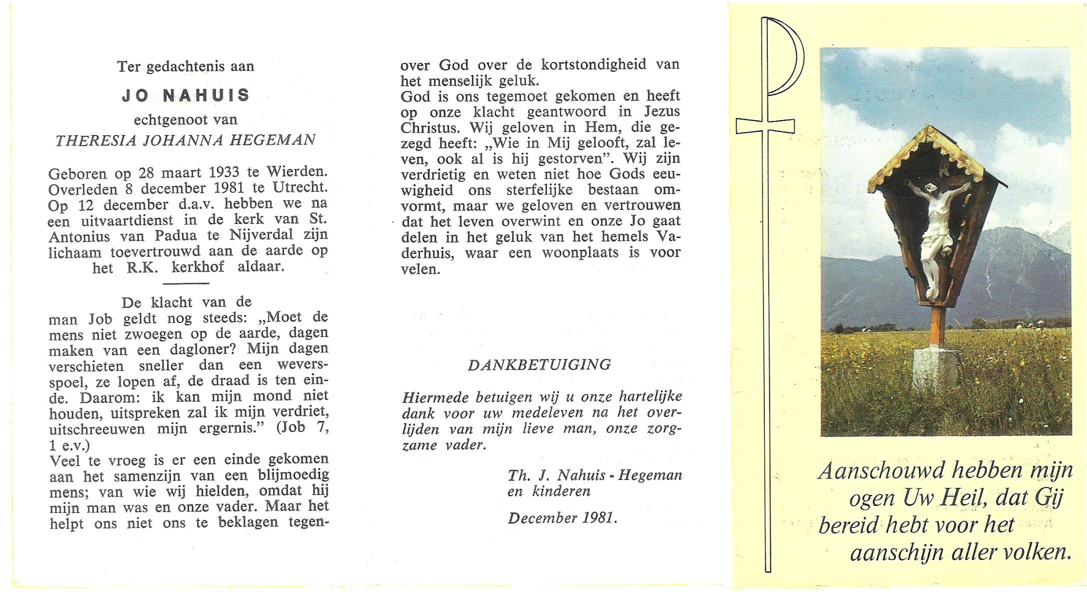 NAHUIS, Jo, geboren op 28-3-1933 te Wierden, overleden op 8-12-1981 te Utrecht op 48-jarige leeftijd, begraven op 12-12-1981 te Hellendoorn, Nijverdal.