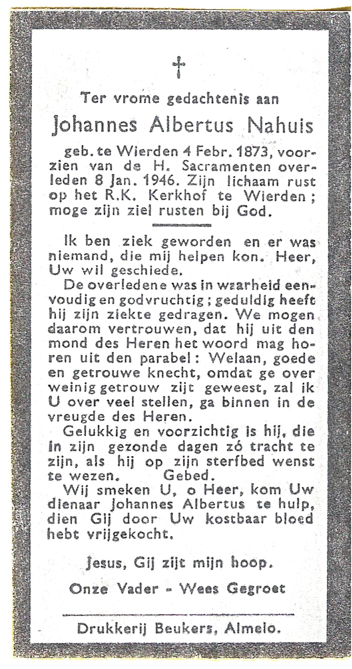 NAHUIS, Johannes Albertus, geboren op 04-02-1873 te Wierden, overleden op 8-1-1946 te Wierden op 72-jarige leeftijd, begraven te Wierden.