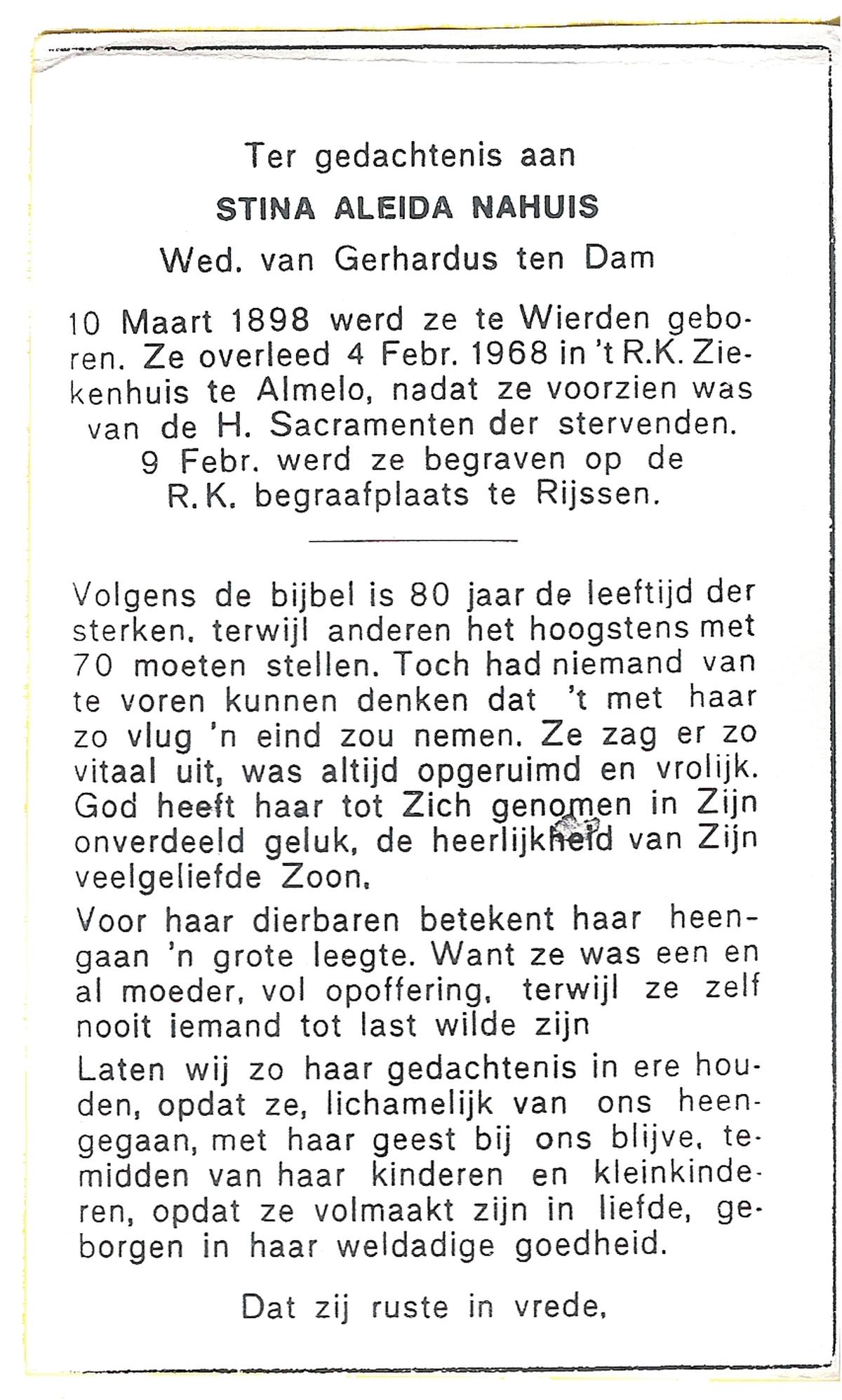 NAHUIS, Stina Aleida, geboren op 10-03-1898 te Wierden, overleden op 4-2-1968 te Almelo op 69-jarige leeftijd, begraven op 9-2-1968 te Rijssen.