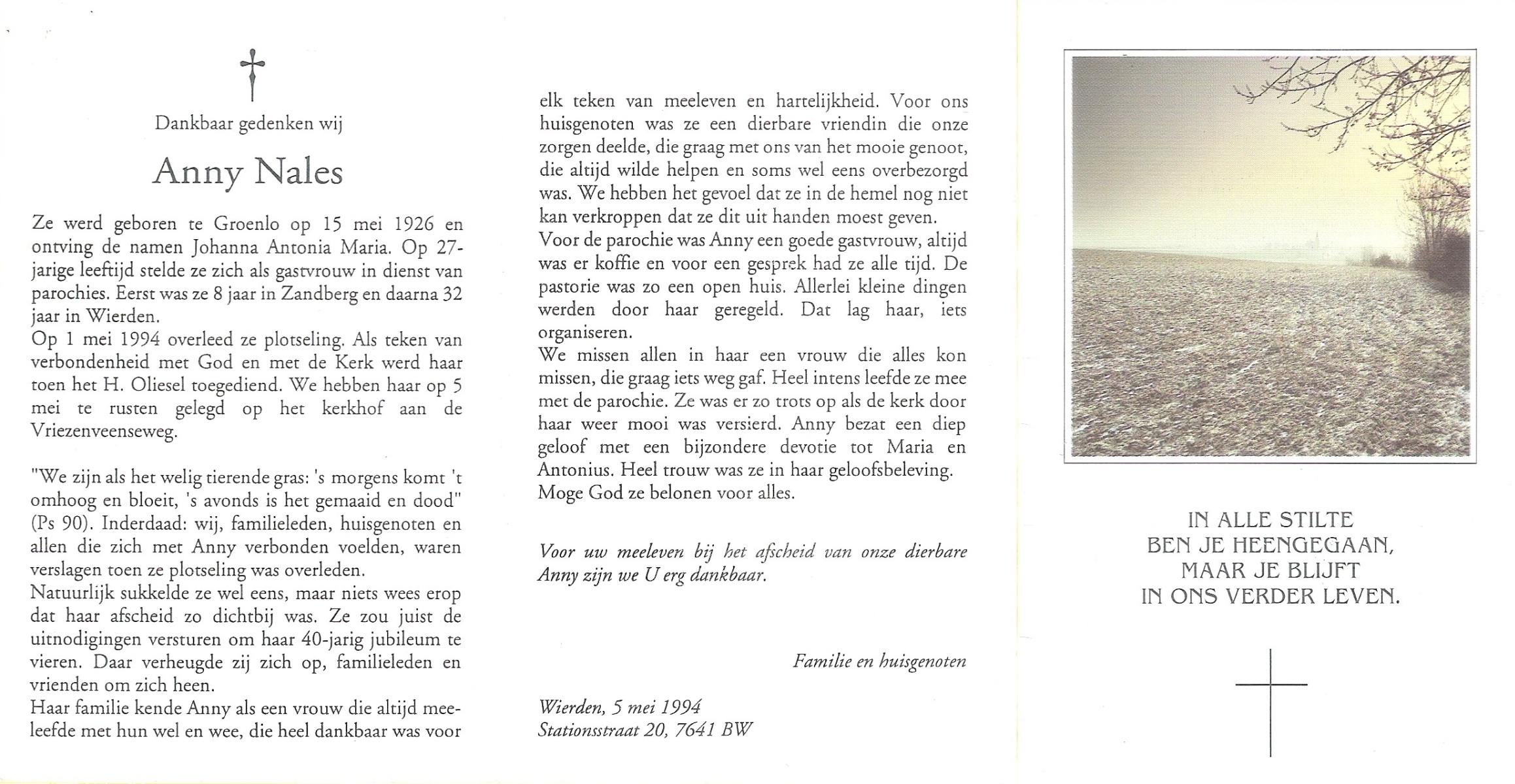 NALES, Anny (Johanna Antonia Maria), geboren op 15-5-1926 te Groenlo, overleden op 1-5-1994 op 67-jarige leeftijd, begraven op 5-5-1994 te Wierden.