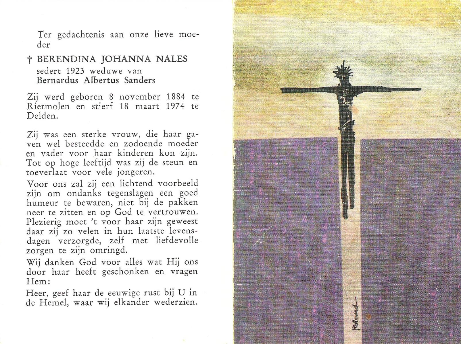 NALES, Berendina Johanna, geboren op 08-11-1884 te Rietmolen, overleden op 18-3-1974 te Delden op 89-jarige leeftijd.