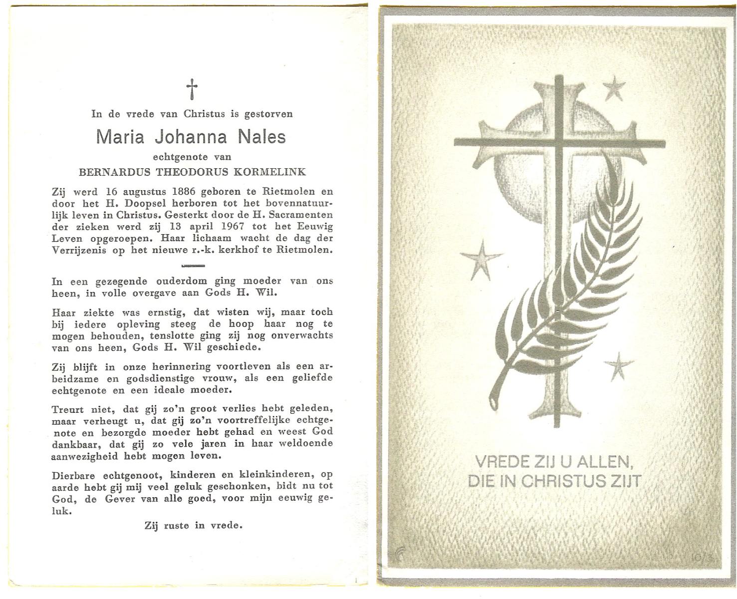 NALES, Maria Johanna, geboren op 16-08-1886 te Rietmolen, overleden op 13-4-1967 op 80-jarige leeftijd, begraven te Rietmolen.