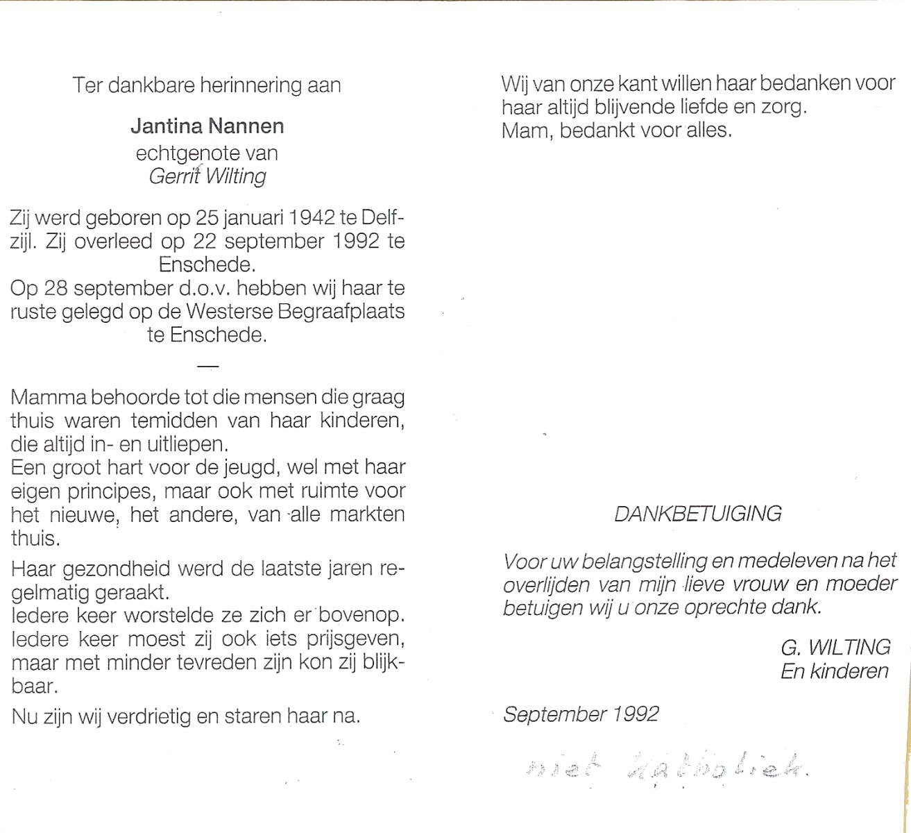 NANNEN, Jantina, geboren op 25-1-1942 te Delfzijl, overleden op 22-9-1992 te Enschede op 50-jarige leeftijd, begraven op 28-9-1992 te Enschede.