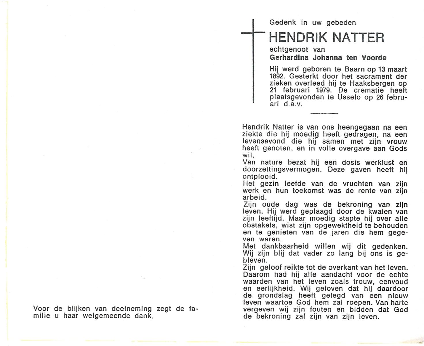 NATTER, Hendrik, geboren op 13-03-1892 te Baarn, overleden op 21-2-1979 te Haaksbergen op 86-jarige leeftijd, gecremeerd op 26-2-1979 te Usselo.