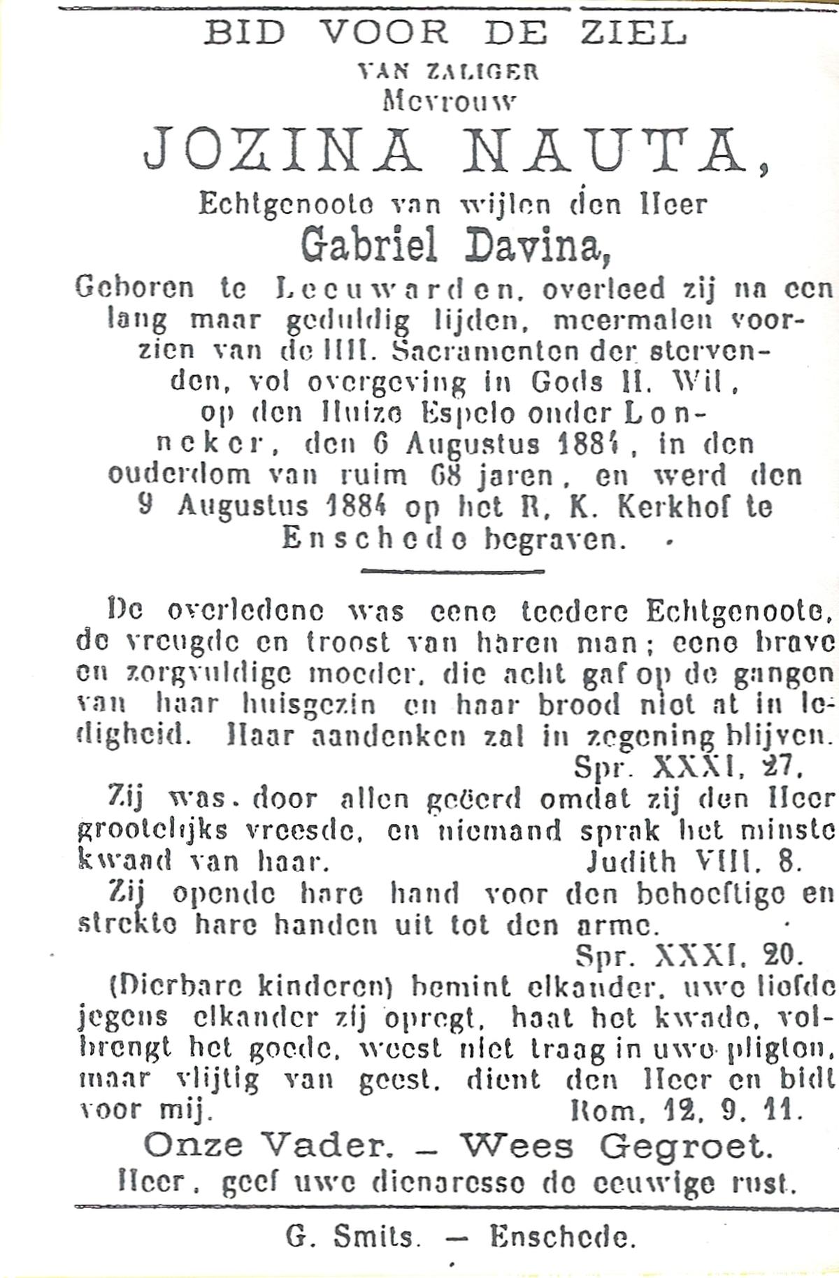 NAUTA, Jozina, geboren te Leeuwarden, overleden op 06-08-1884 te Espelo op 68-jarige leeftijd, begraven op 09-08-1884 te Enschede.