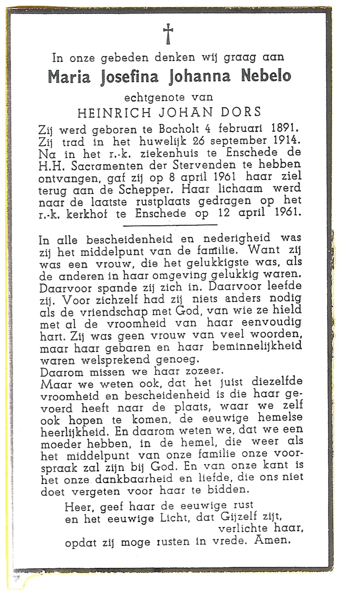 NEBELO, Maria Josefina Johanna, geboren op 04-02-1891 te Bocholt (Dld), overleden op 8-4-1961 te Enschede op 70-jarige leeftijd, begraven op 12-4-1961 te Enschede.