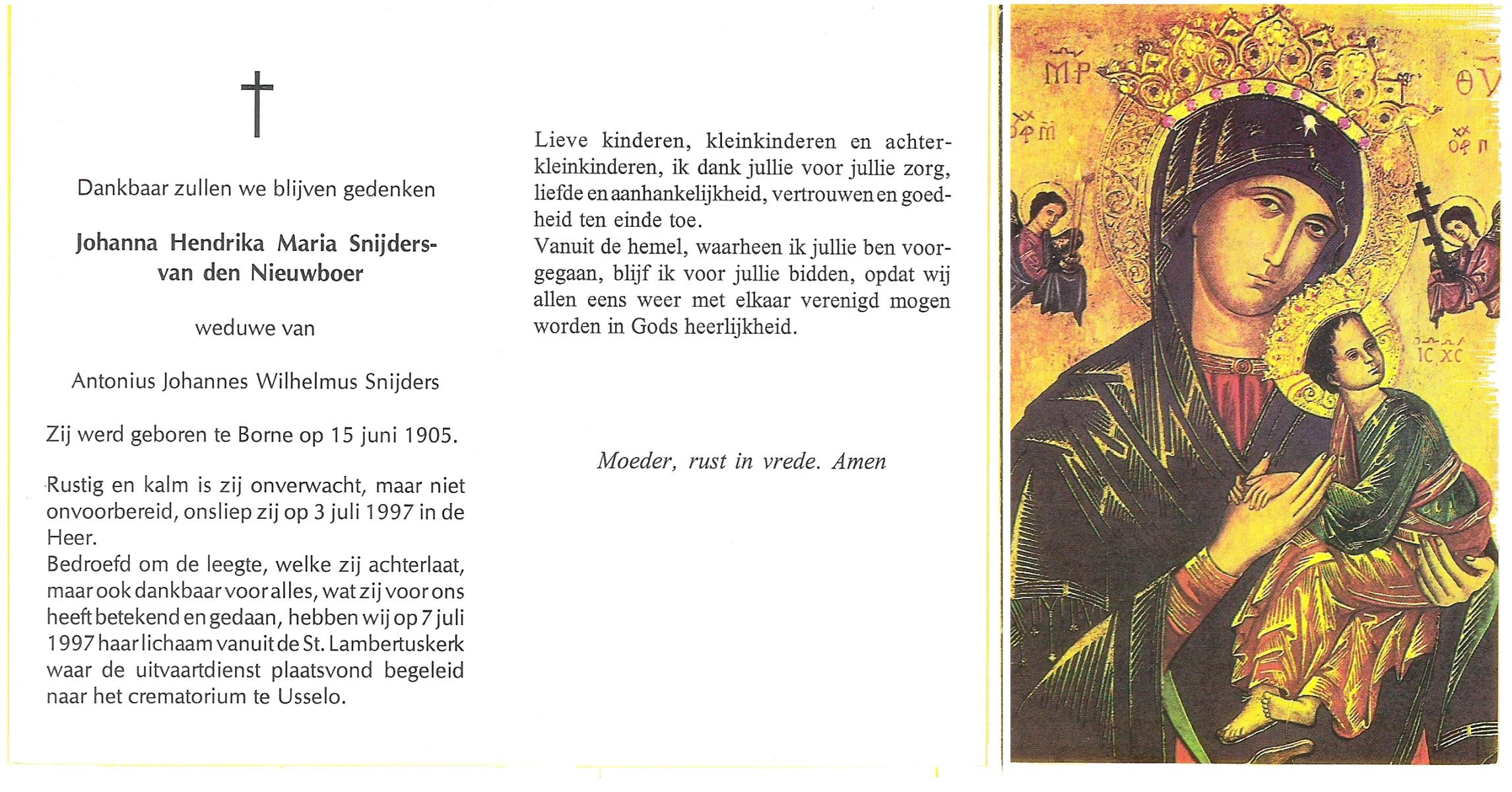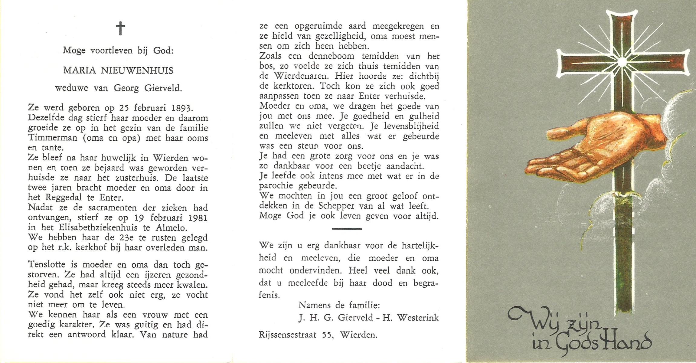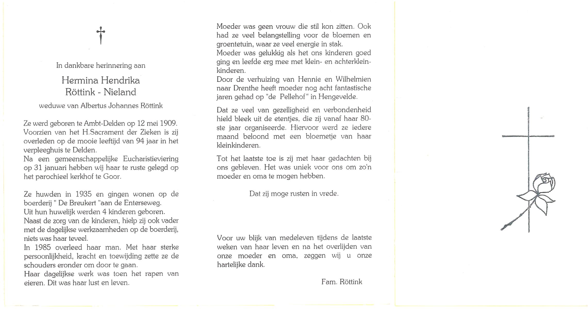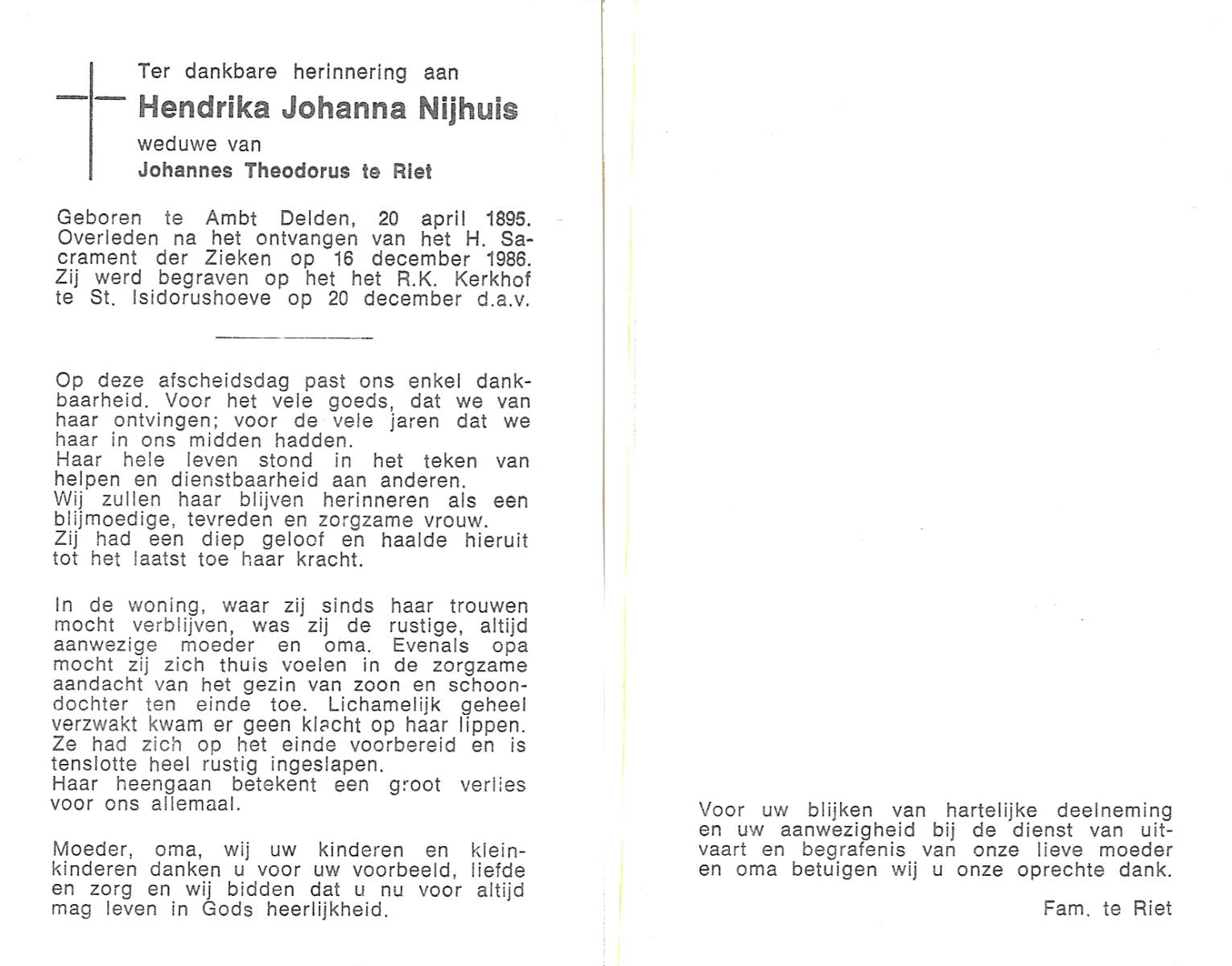 NAHUIS, Henrica Maria, geboren op 13-11-1906 te Hellendoorn, Haarle, overleden op 21-2-1996 te Hellendoorn op 89-jarige leeftijd, begraven op 26-2-1996 te Hellendoorn.