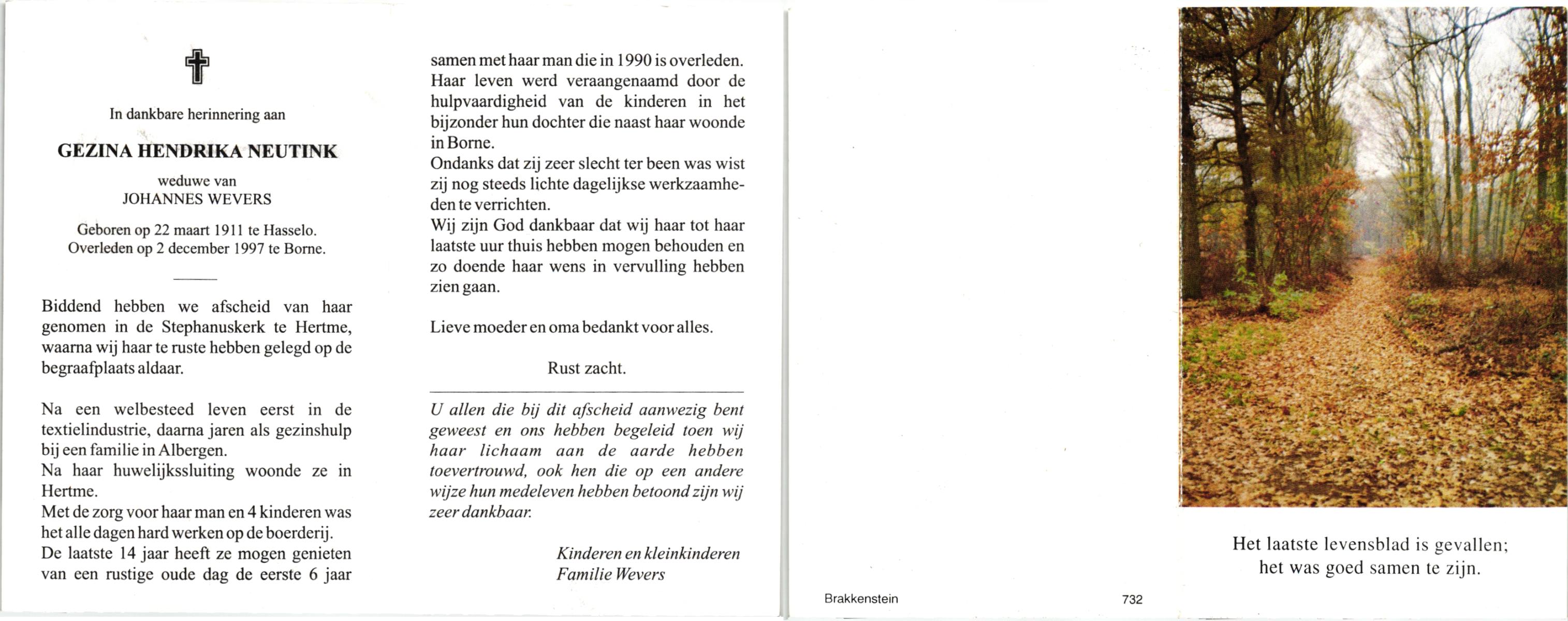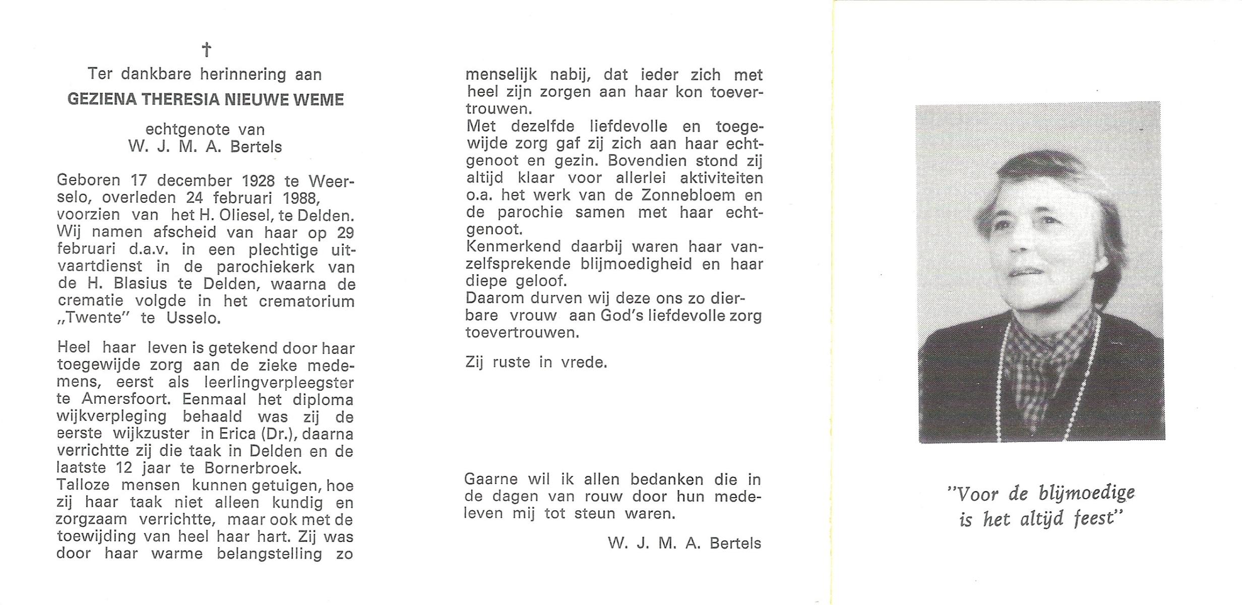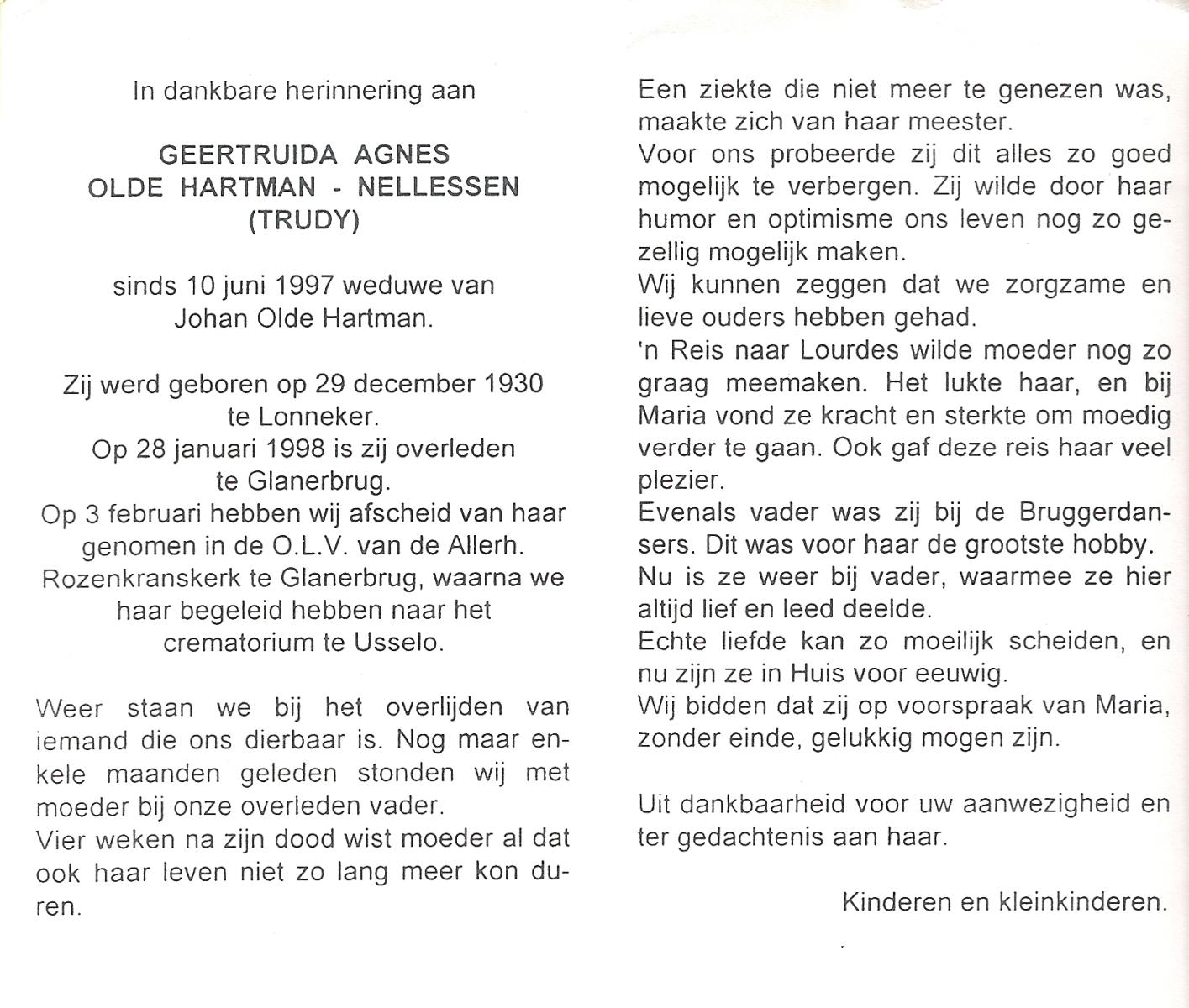 NELLESSEN, Geertruida Agnes, geboren op 29-12-1930 te Lonneker, overleden op 28-1-1998 te Glanerbrug op 67-jarige leeftijd, gecremeerd op 3-2-1998 te Usselo.