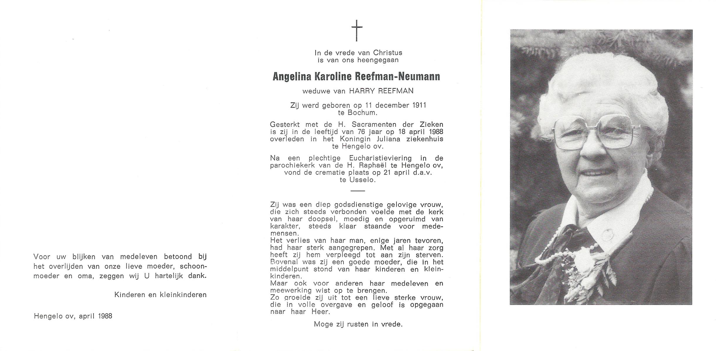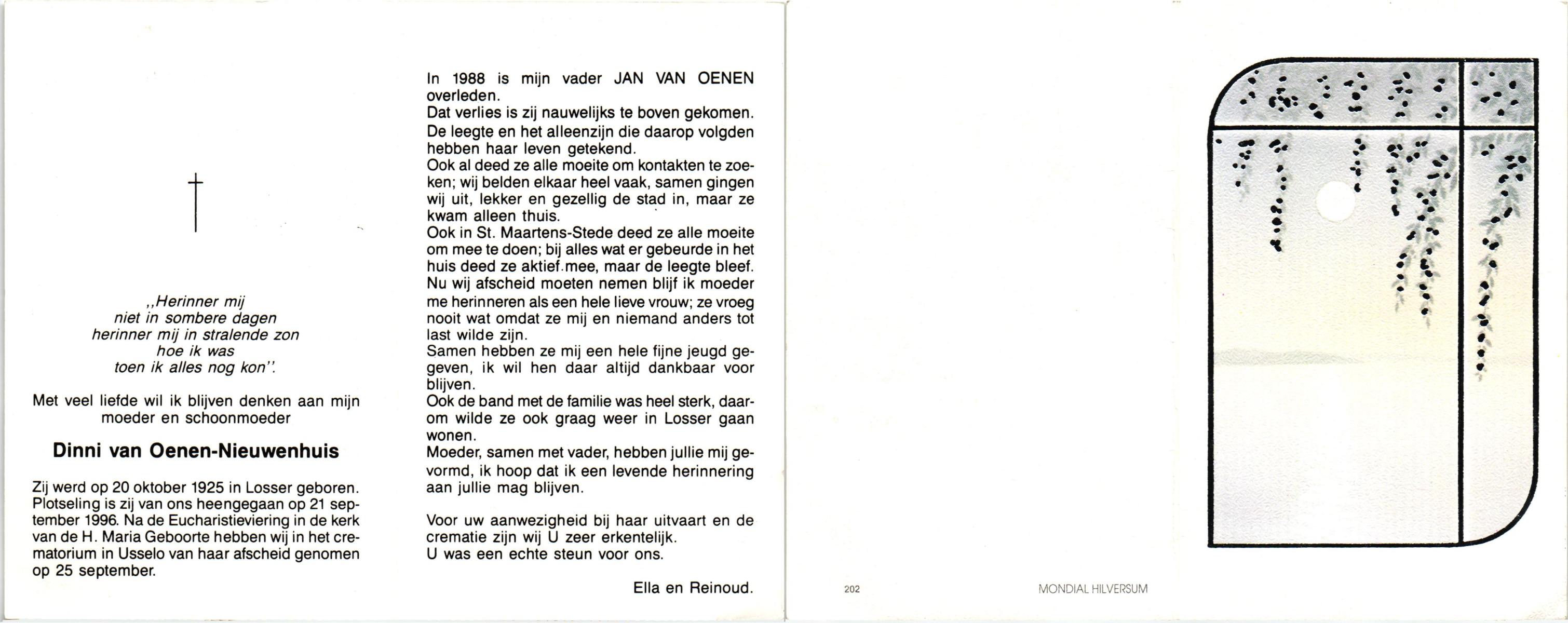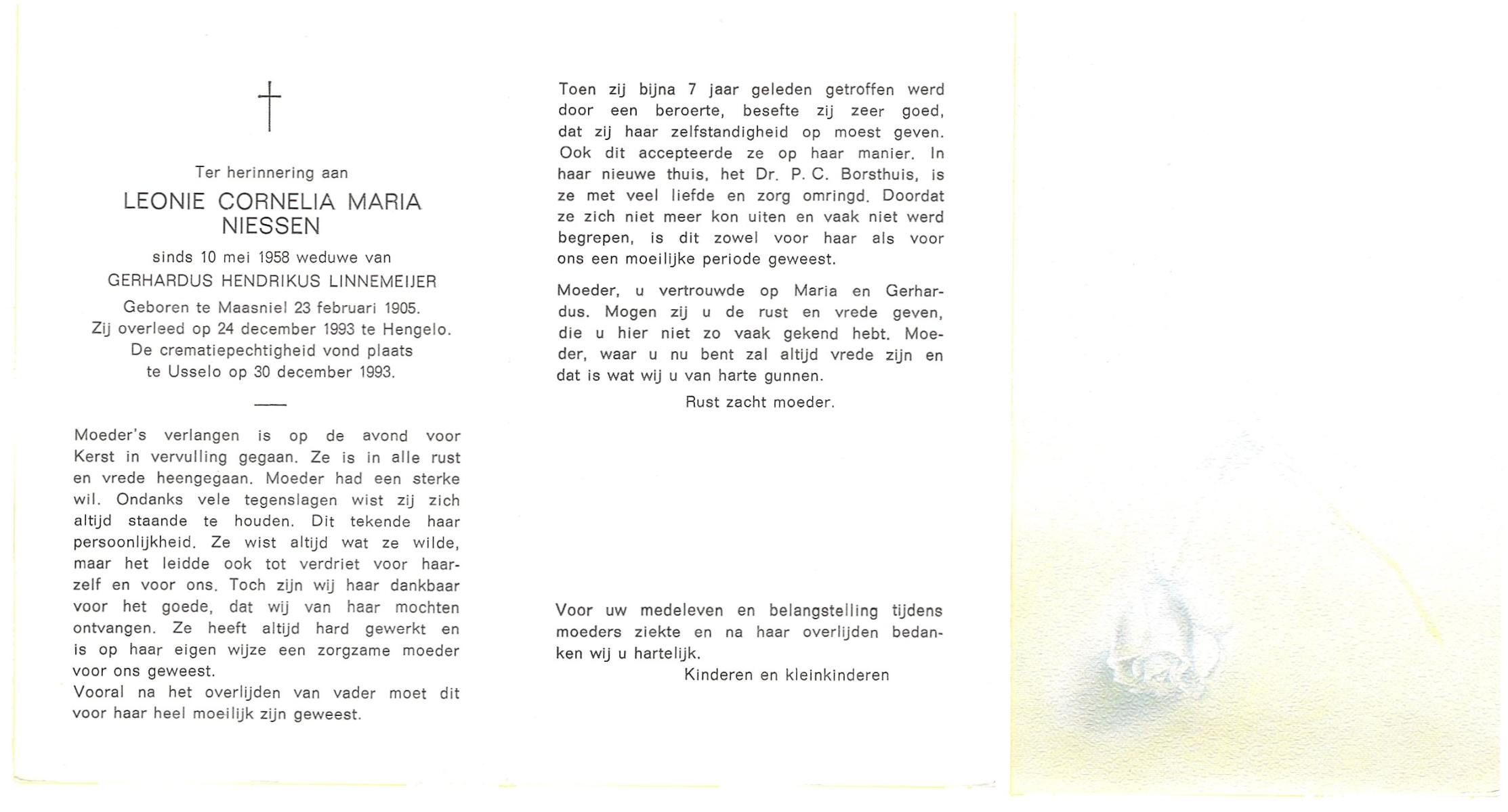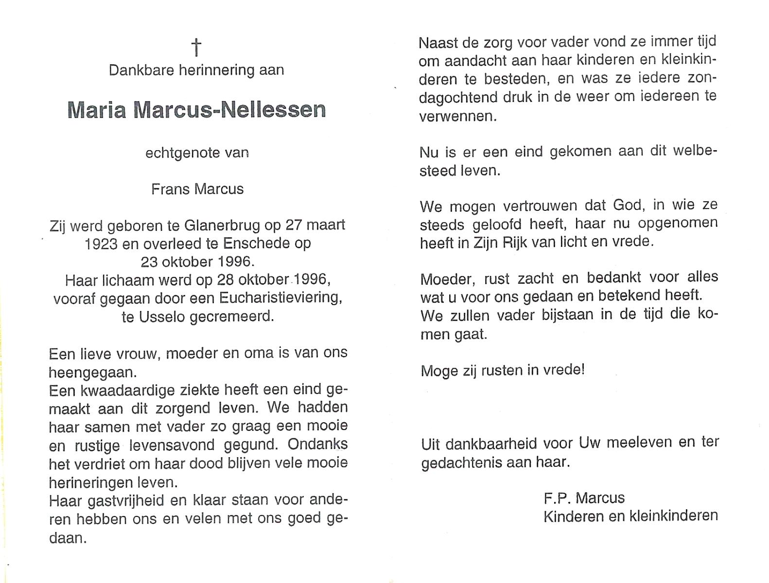 NELLESSEN, Maria, geboren op 27-3-1923 te Glanerburg, overleden op 23-10-1996 te Enschede op 73-jarige leeftijd, gecremeerd op 28-10-1996 te Usselo.