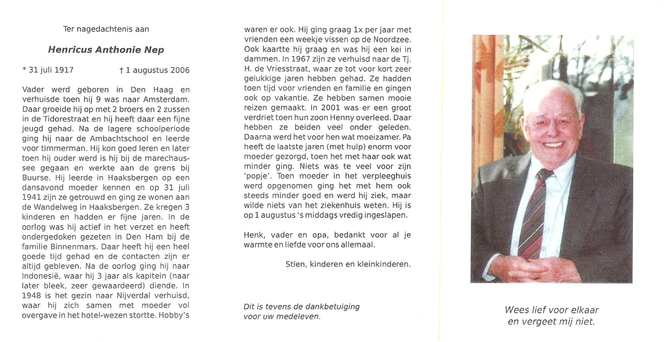 NEP, Henricus Antonie, geboren op 31-7-1917, overleden op 1-8-2006 te Hellendoorn, Nijverdal op 89-jarige leeftijd.
