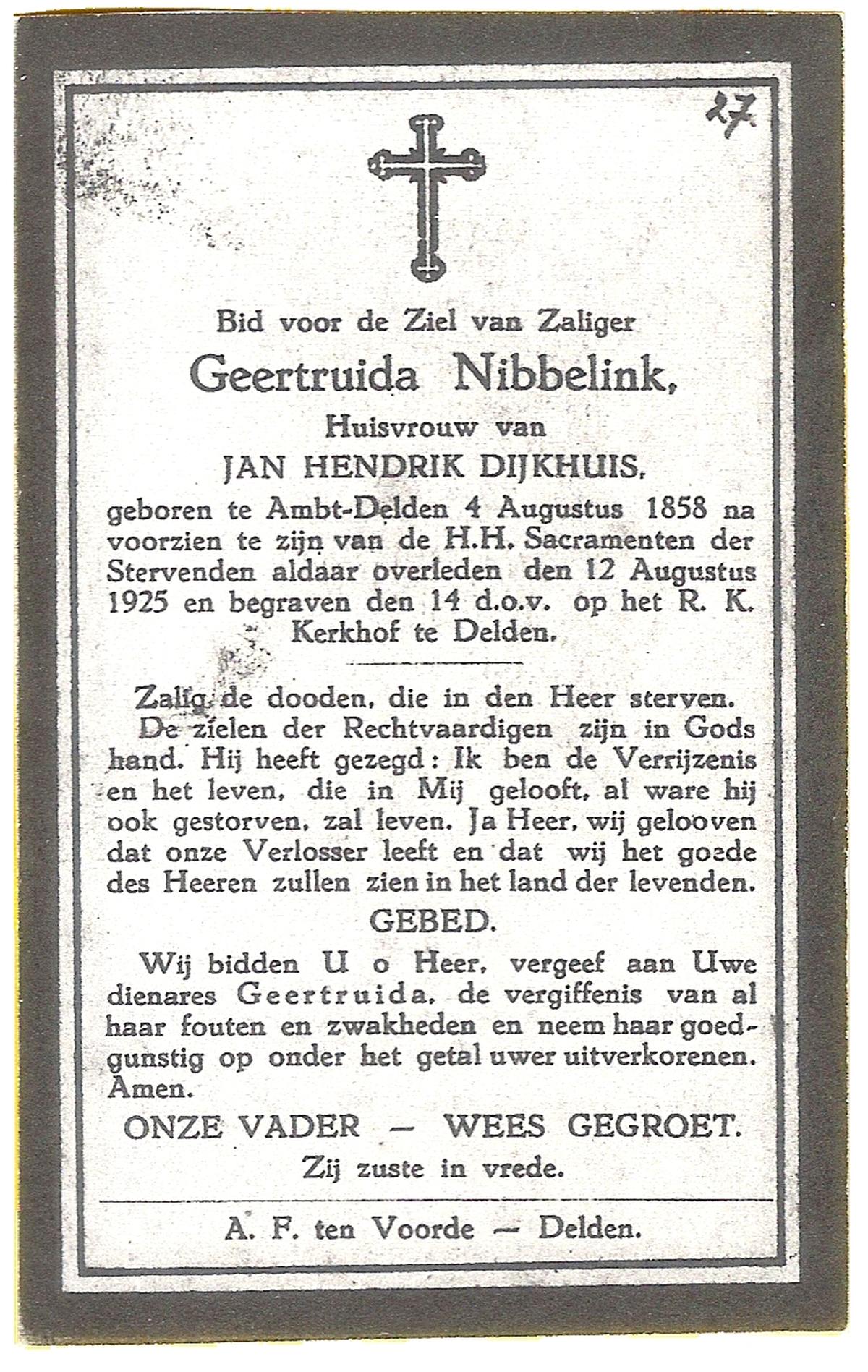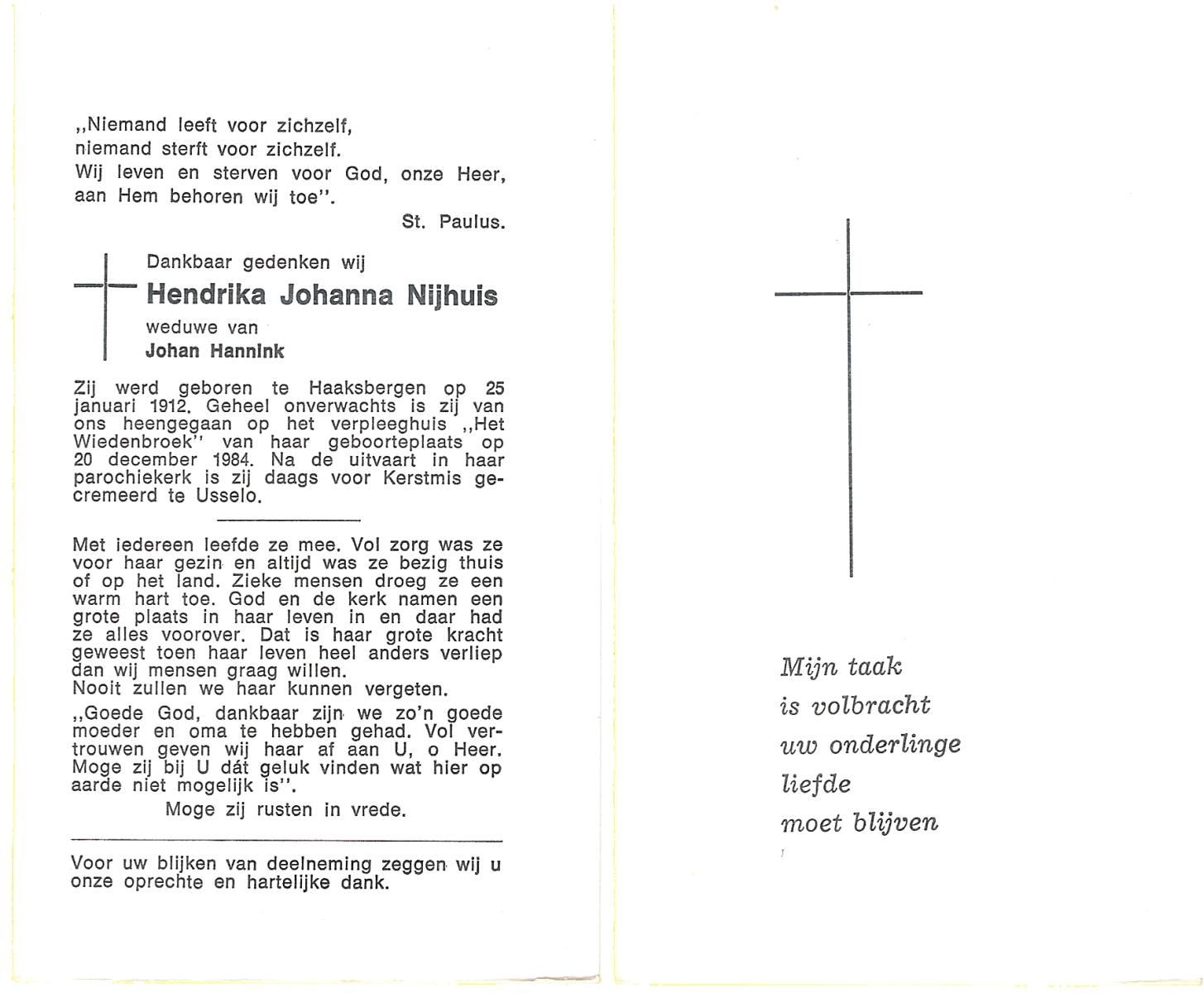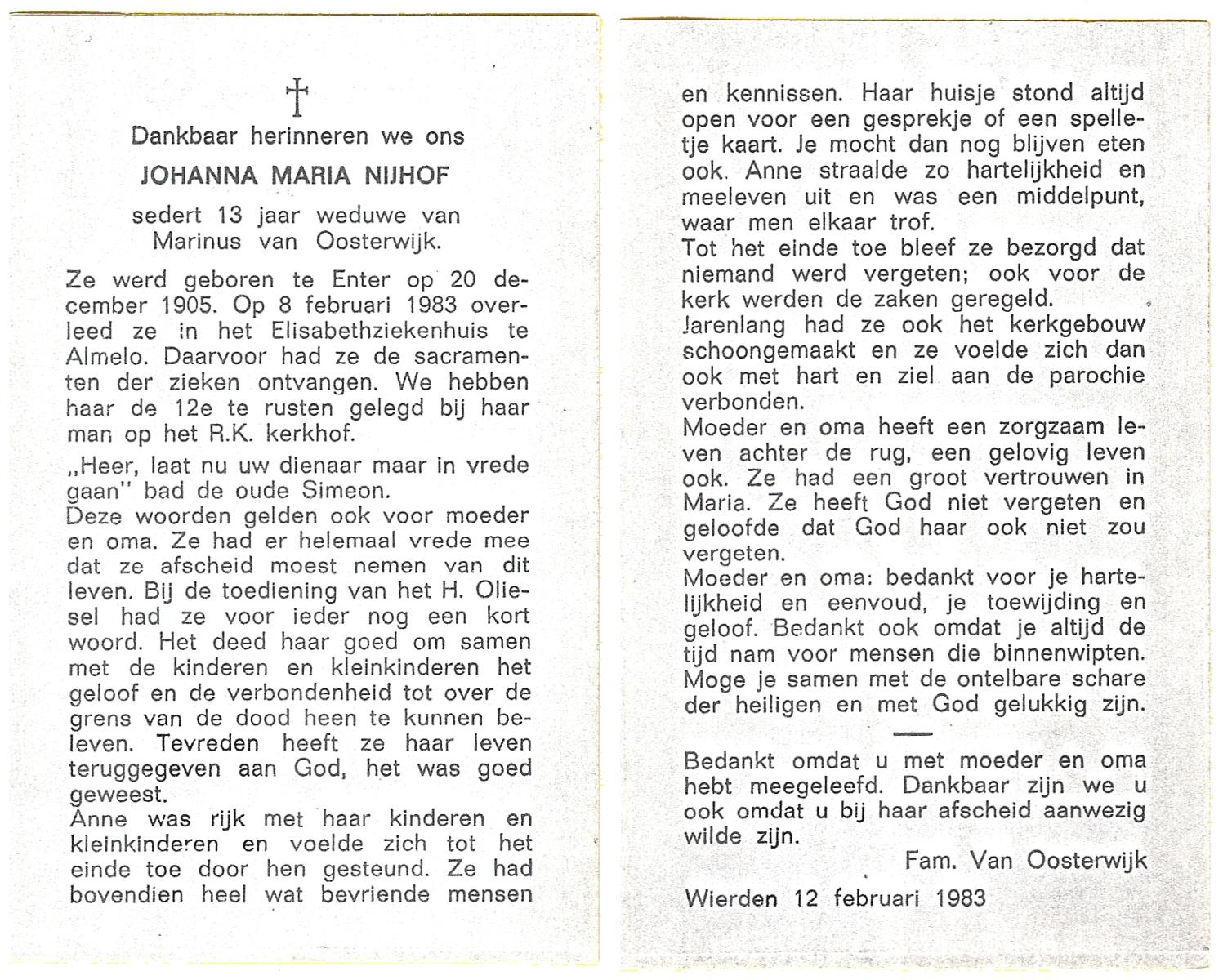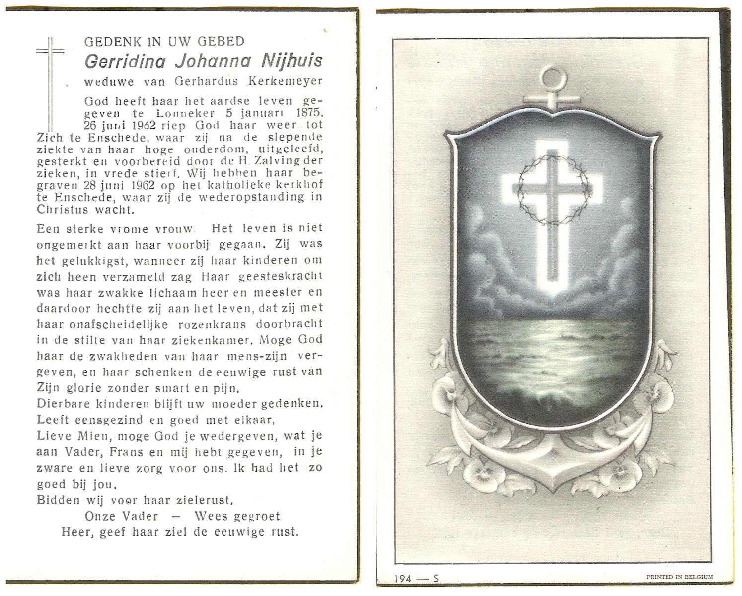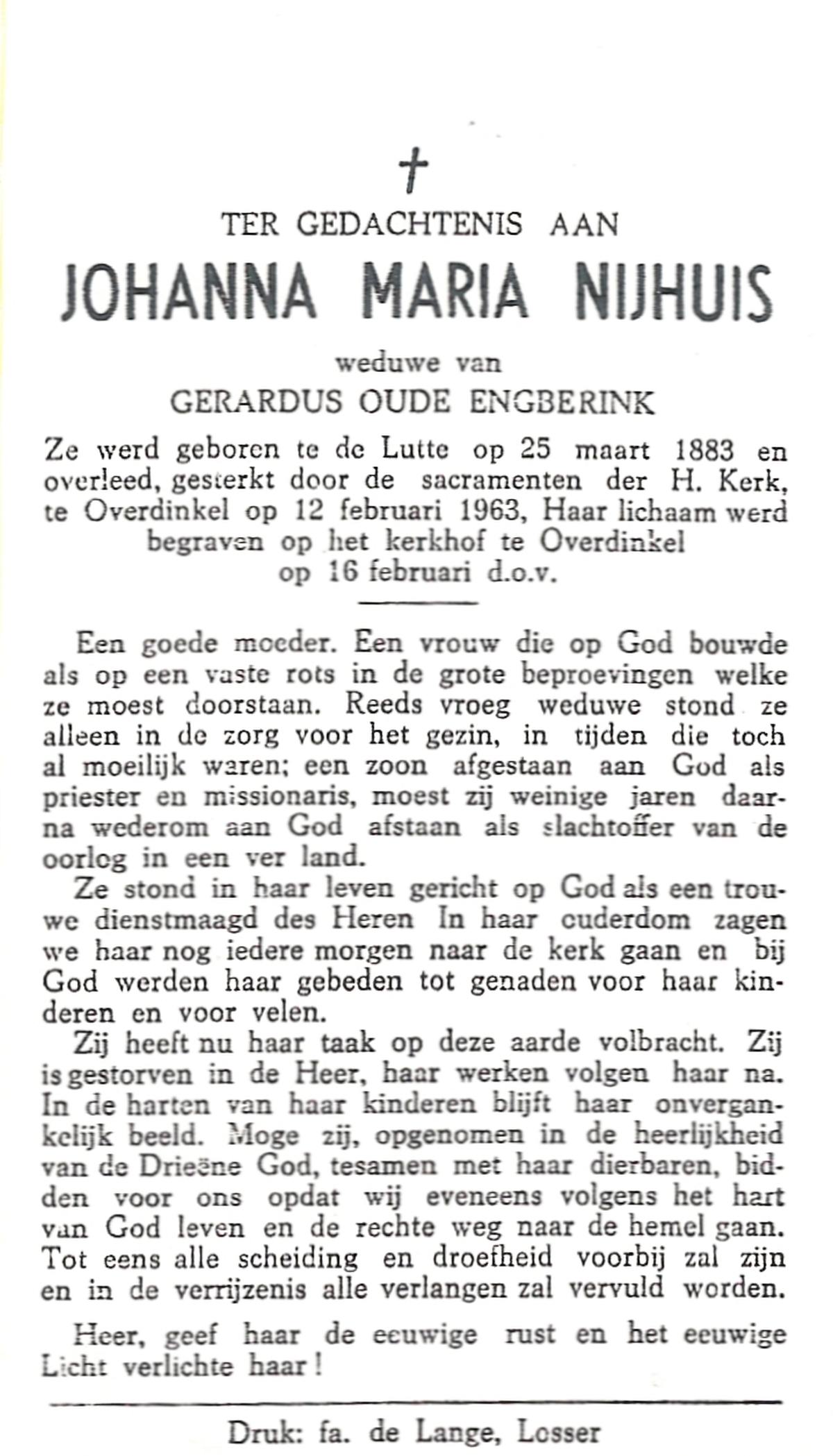 NIJHUIS, Johanna Maria, geboren op 25-03-1883 te De Lutte, overleden op 12-2-1963 te Overdinkel op 79-jarige leeftijd, begraven op 16-2-1963 te Overdinkel.