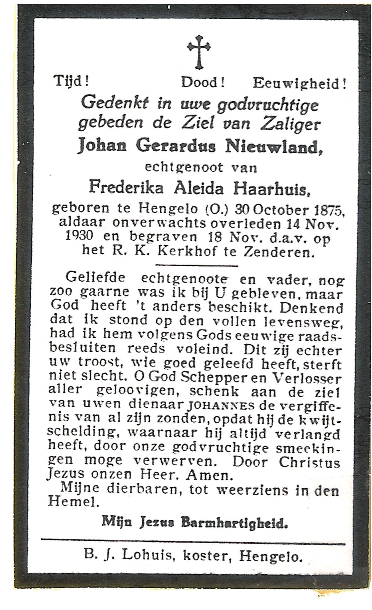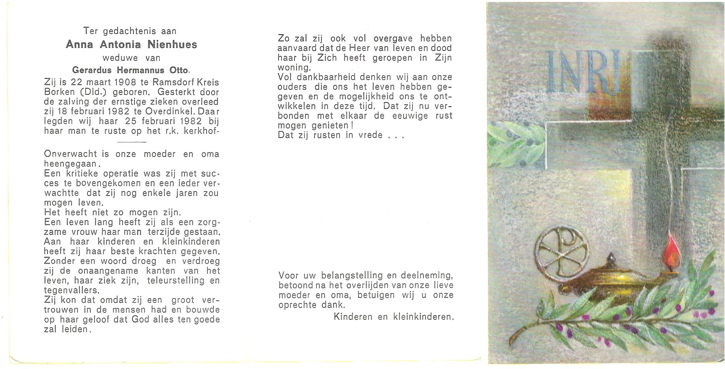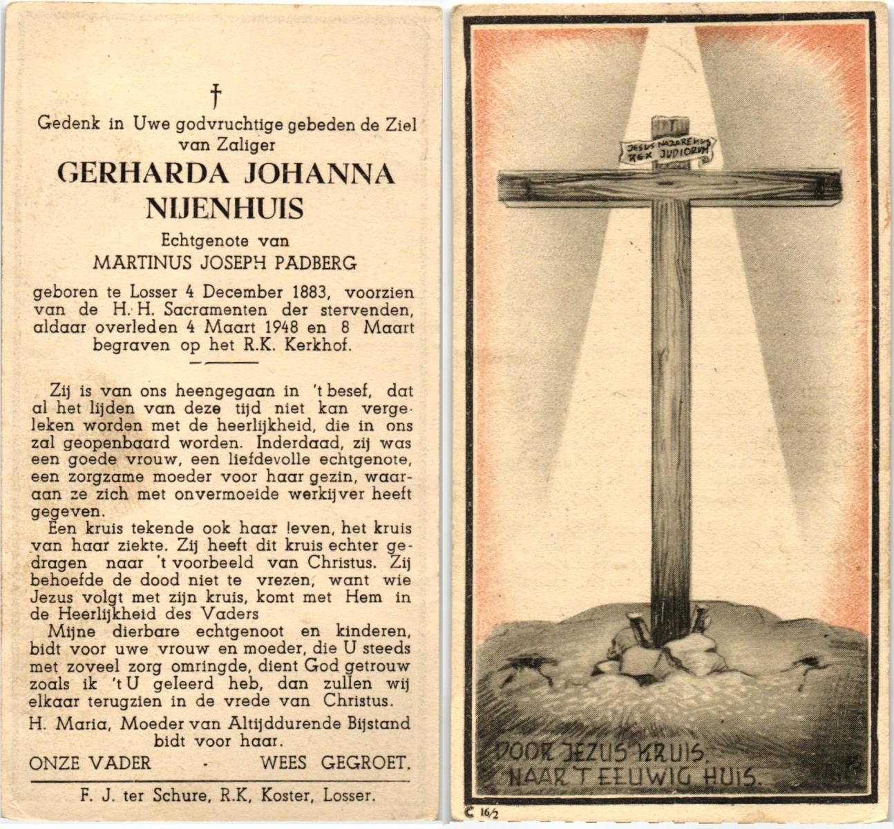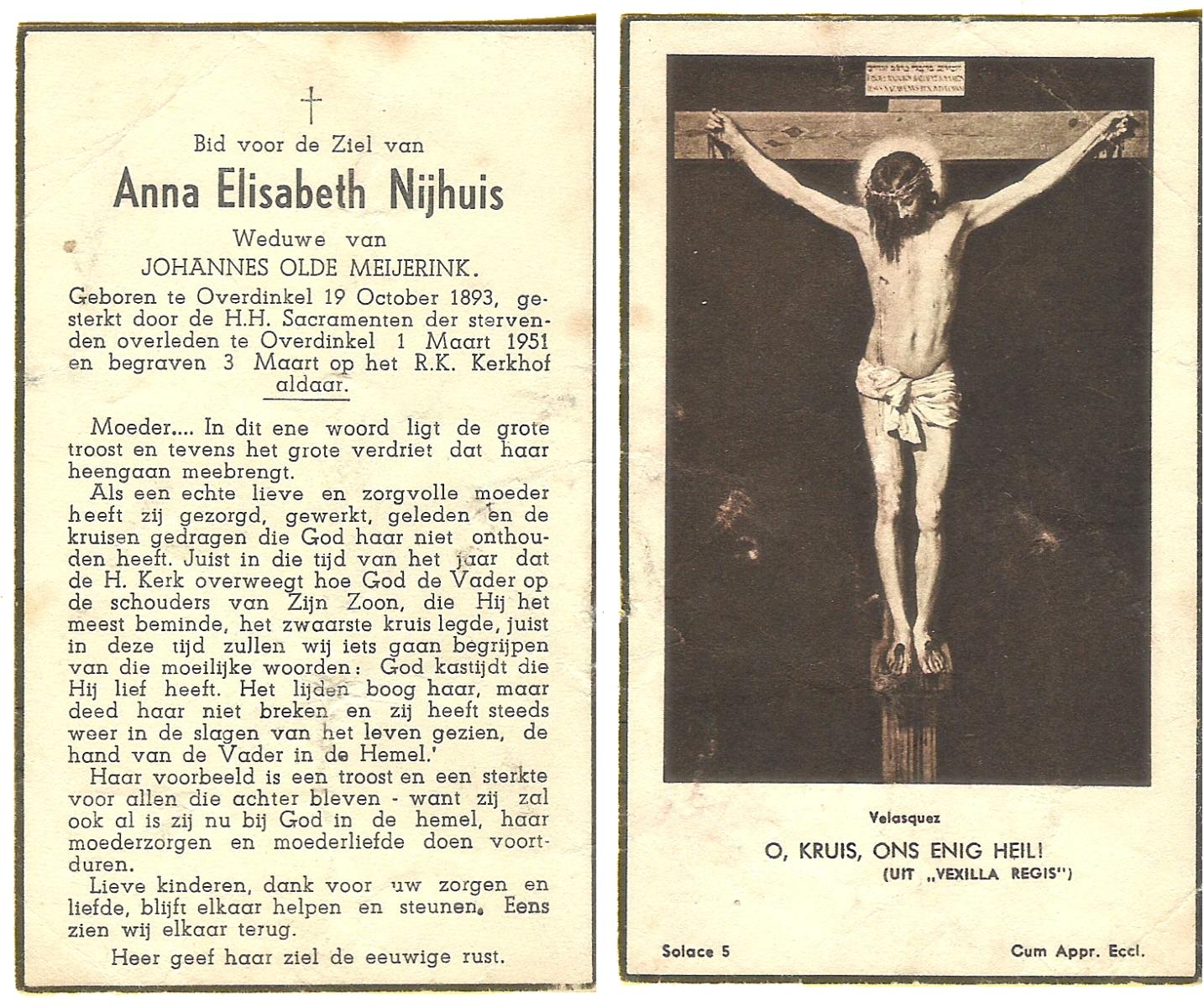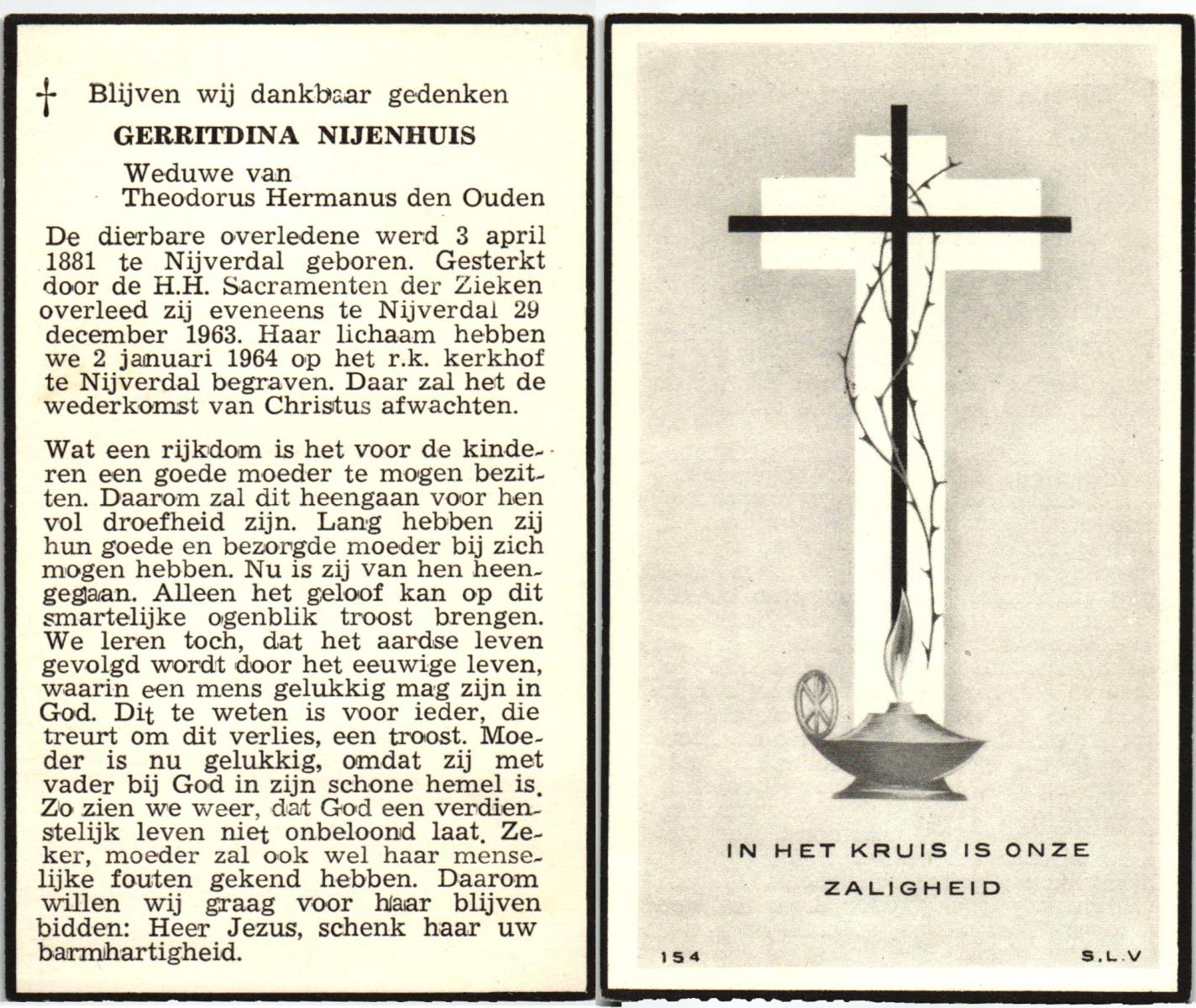 NIJHUIS, Johanna Maria, geboren op 25-03-1883 te De Lutte, overleden op 12-2-1963 te Overdinkel op 79-jarige leeftijd, begraven op 16-2-1963 te Overdinkel.