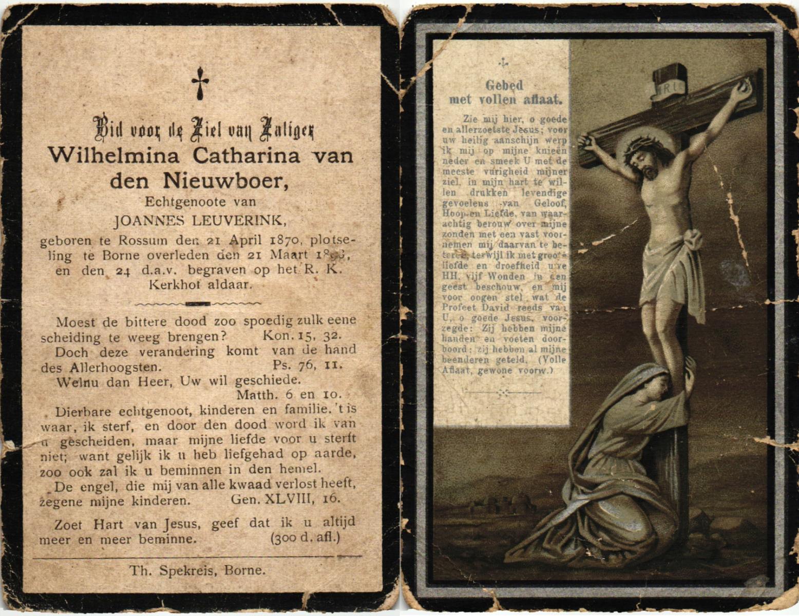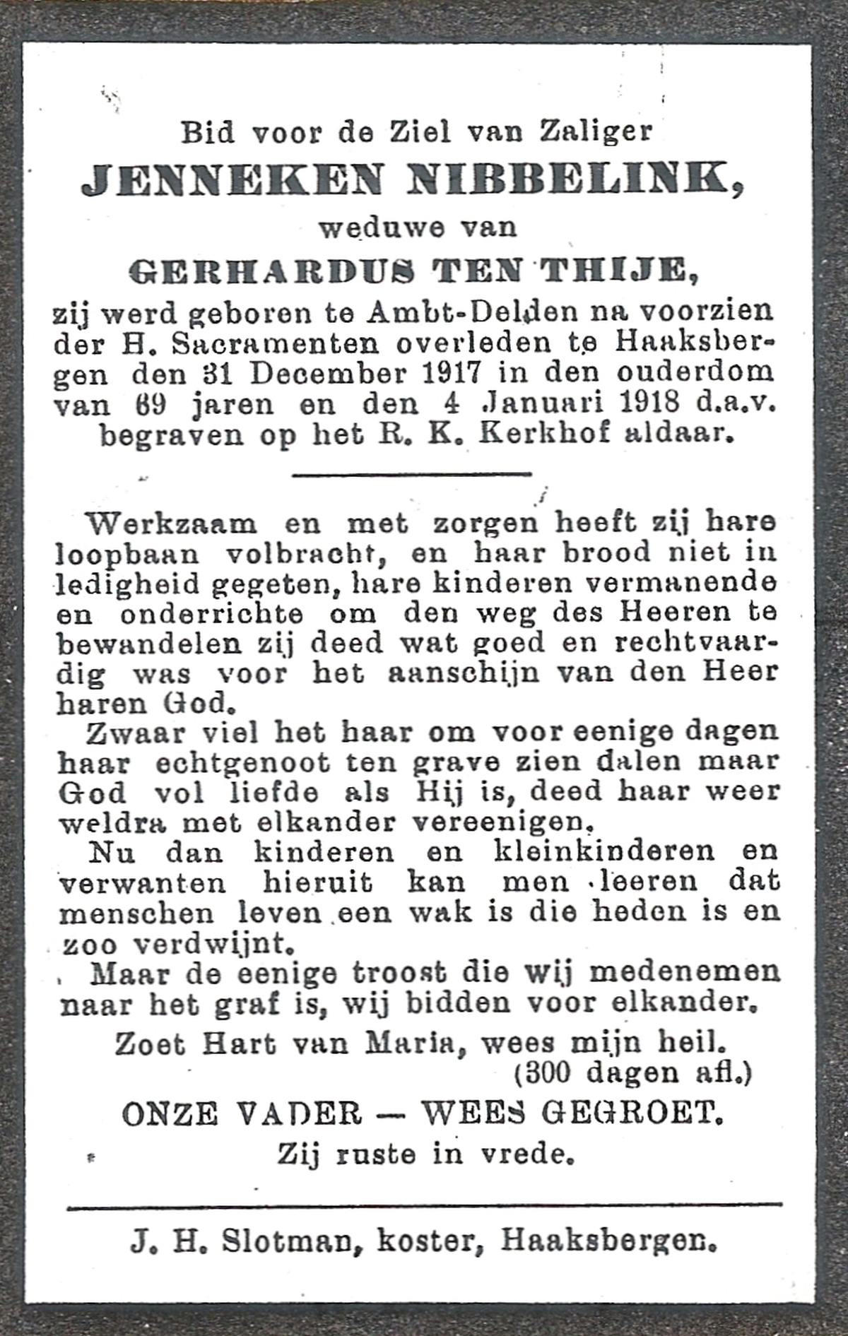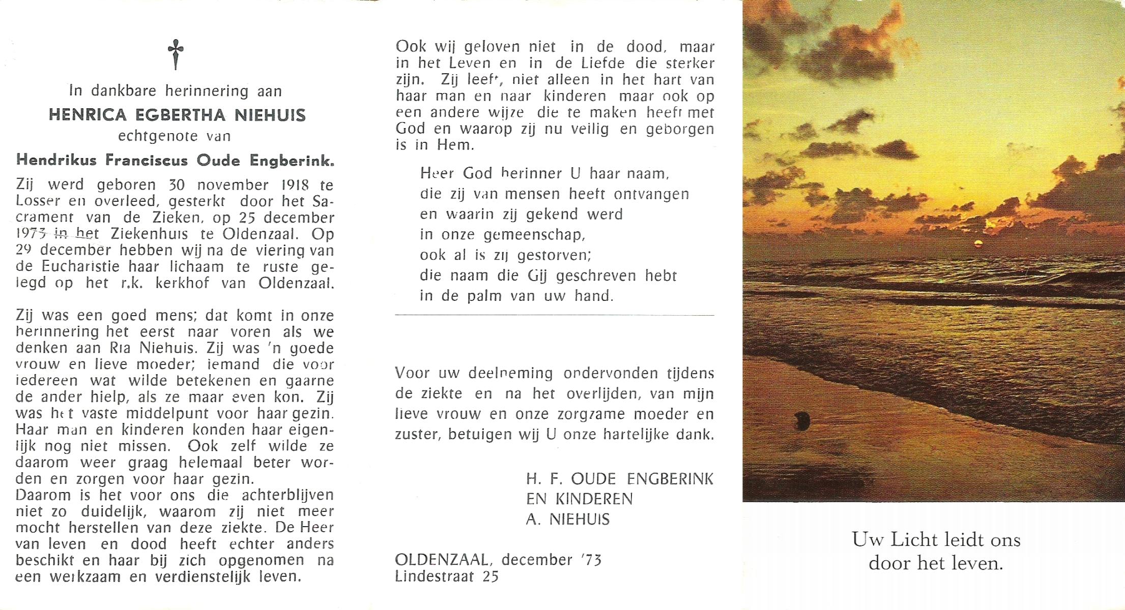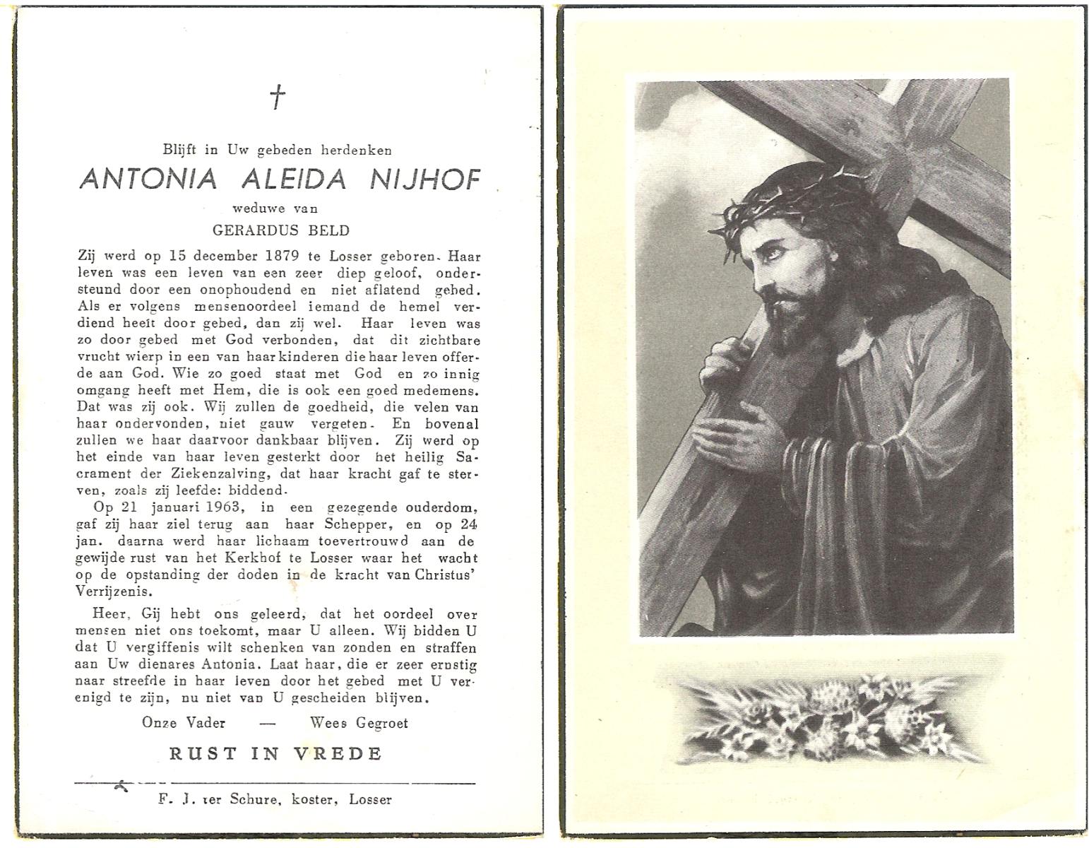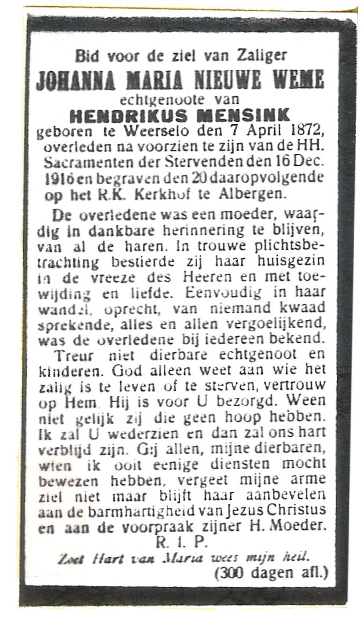 NIJHUIS, Johanna Maria, geboren op 25-03-1883 te De Lutte, overleden op 12-2-1963 te Overdinkel op 79-jarige leeftijd, begraven op 16-2-1963 te Overdinkel.