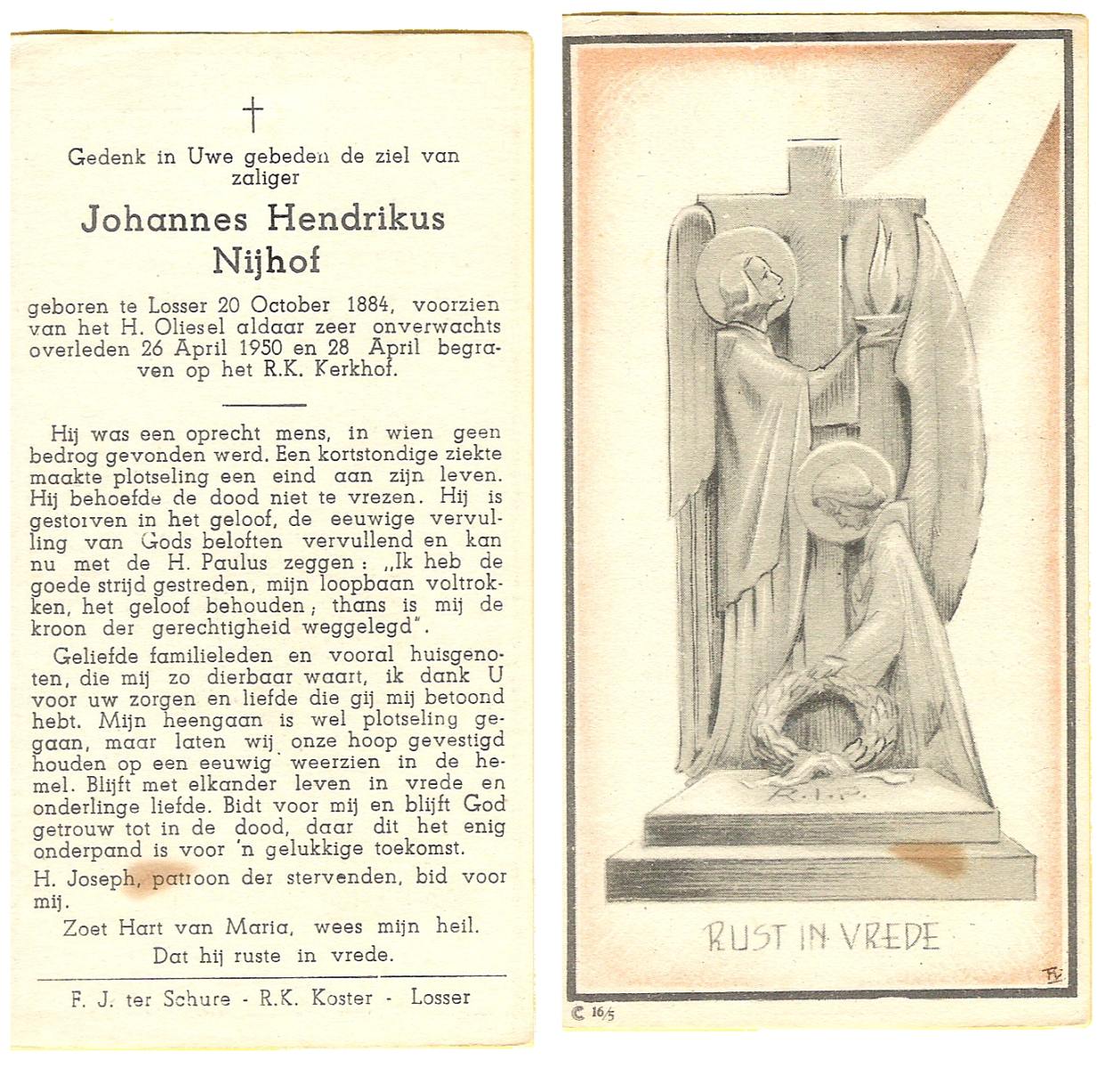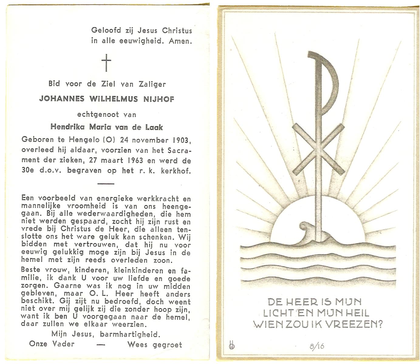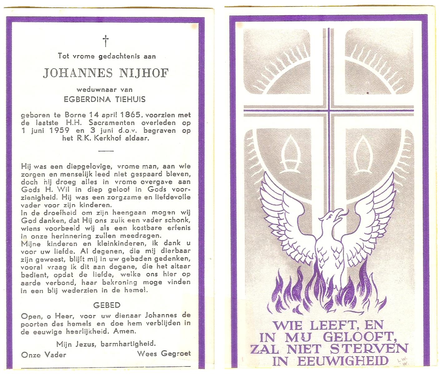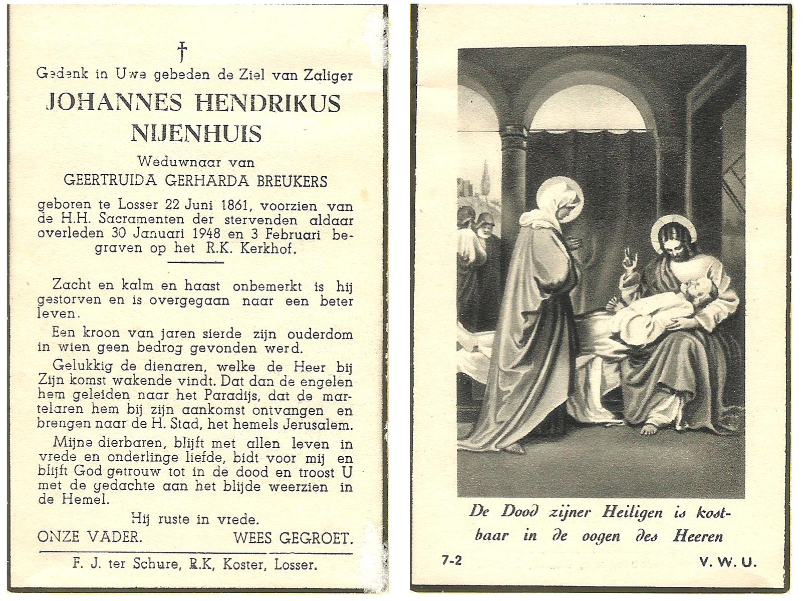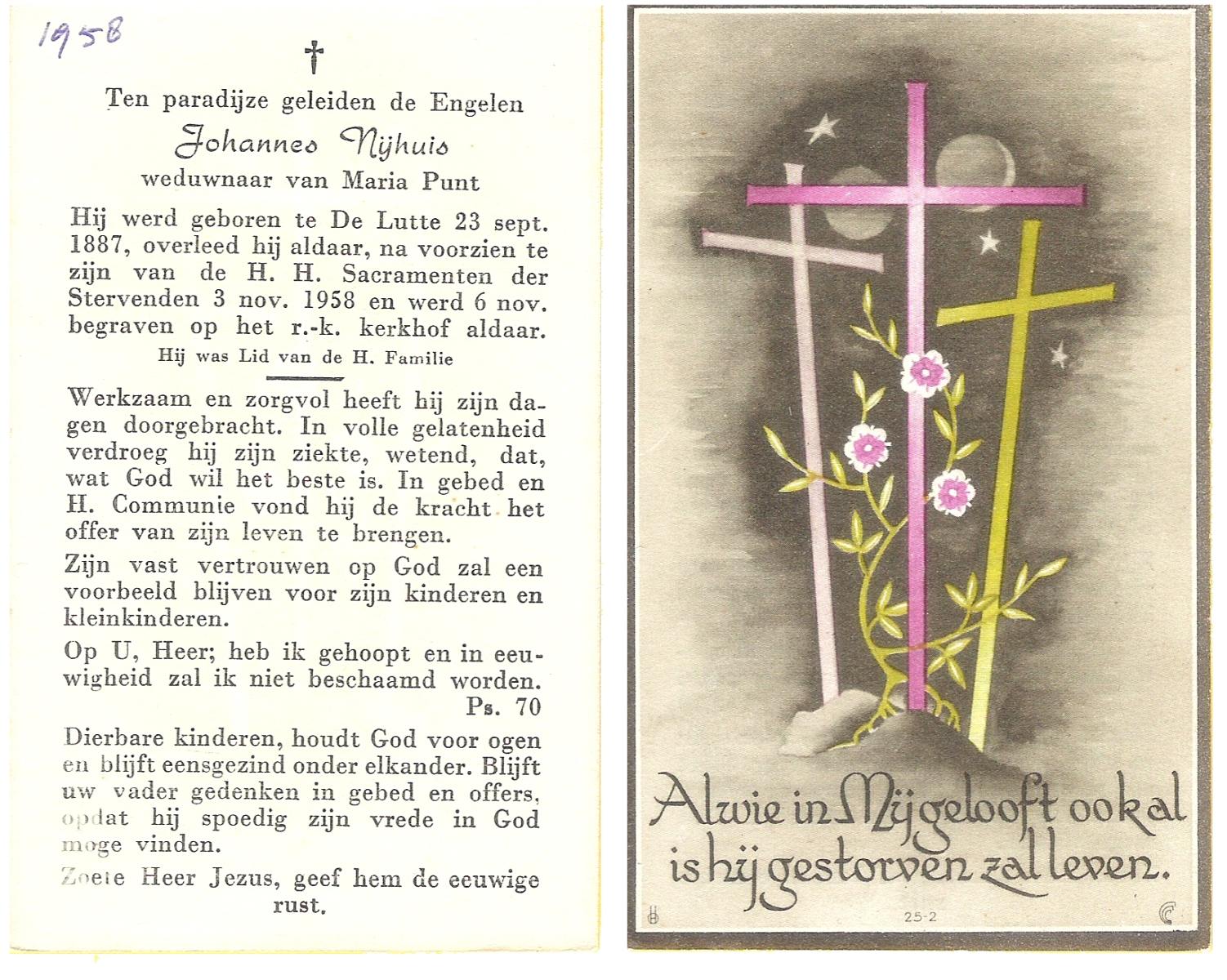 NIJHUIS, Johannes, geboren op 23-09-1887 te De Lutte, overleden op 3-11-1958 te De Lutte op 71-jarige leeftijd, begraven op 6-11-1958 te De Lutte.