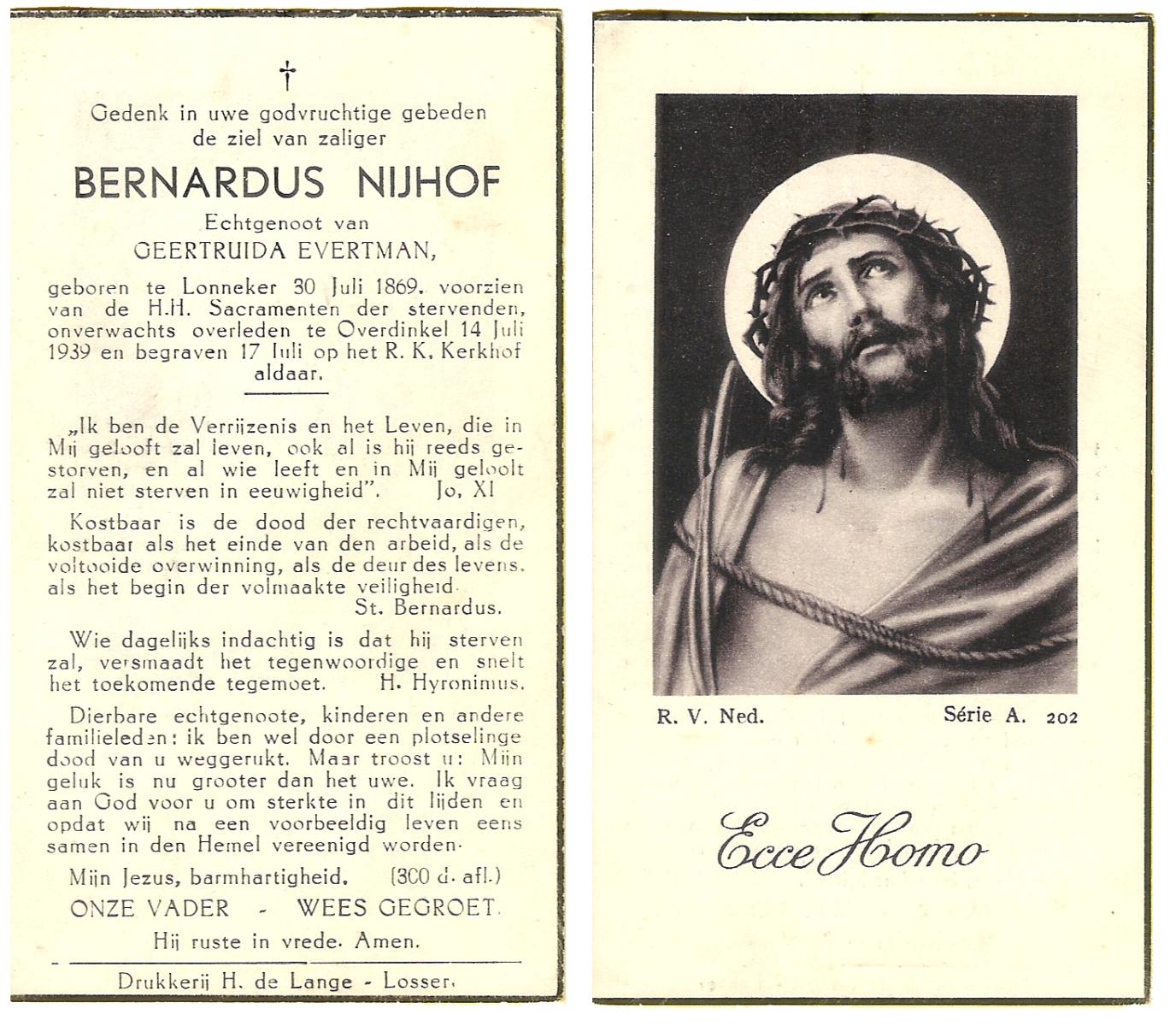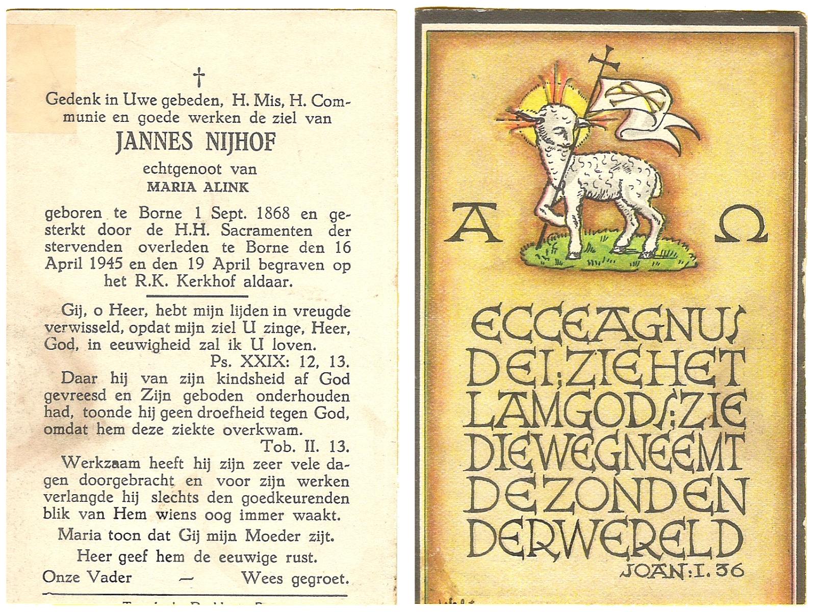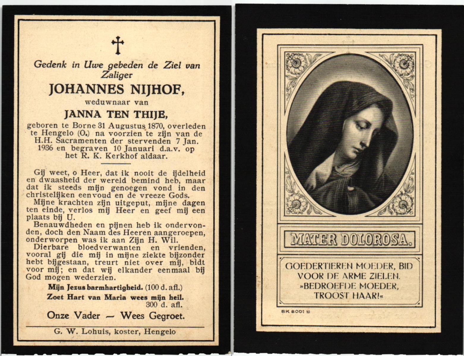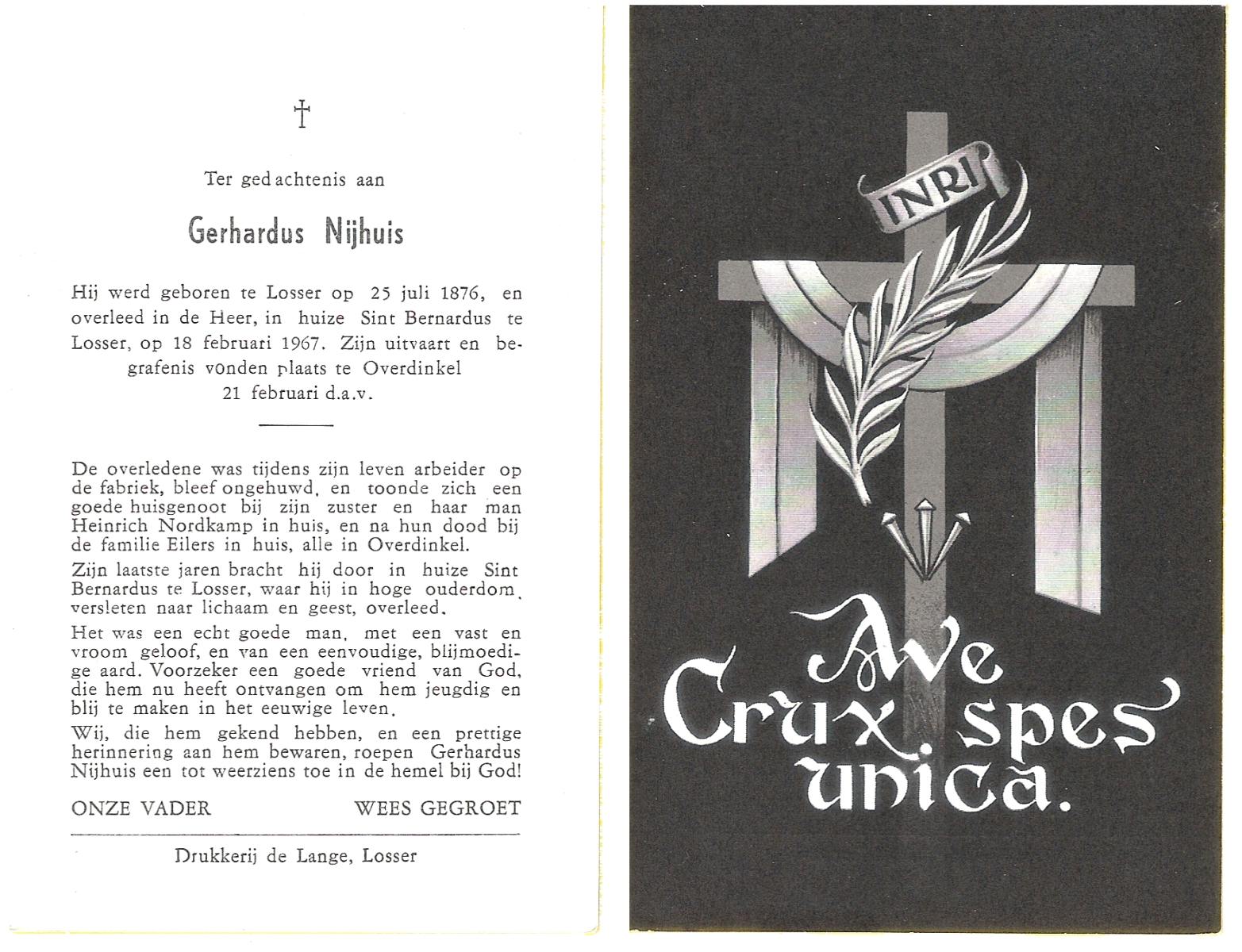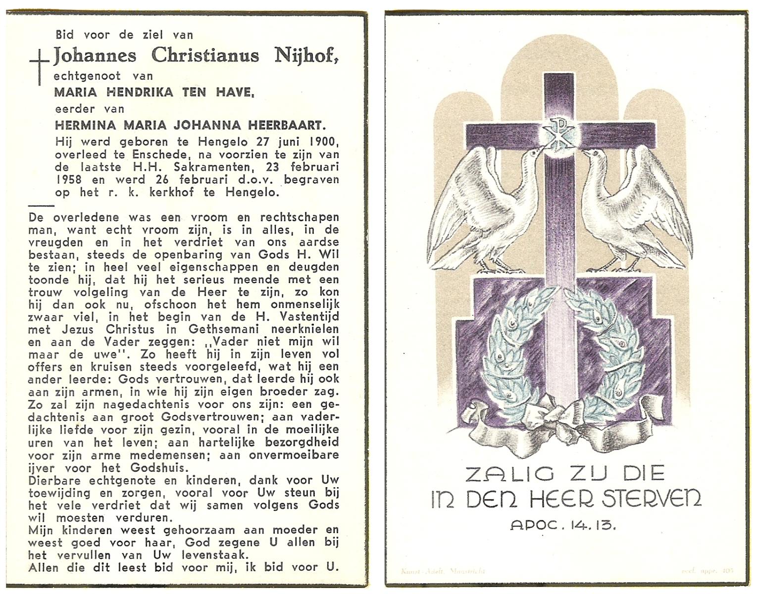 NIJHUIS, Johannes, geboren op 23-09-1887 te De Lutte, overleden op 3-11-1958 te De Lutte op 71-jarige leeftijd, begraven op 6-11-1958 te De Lutte.