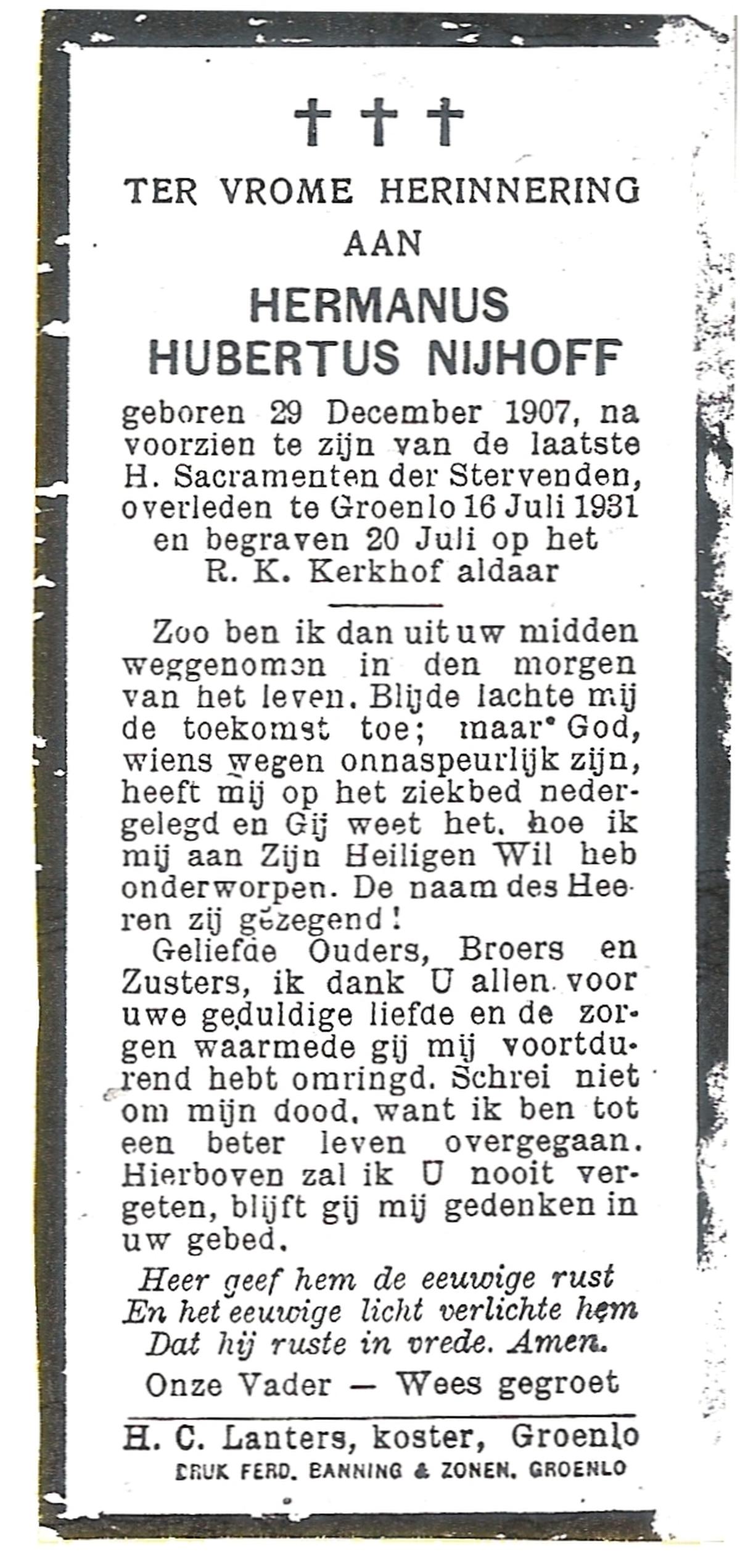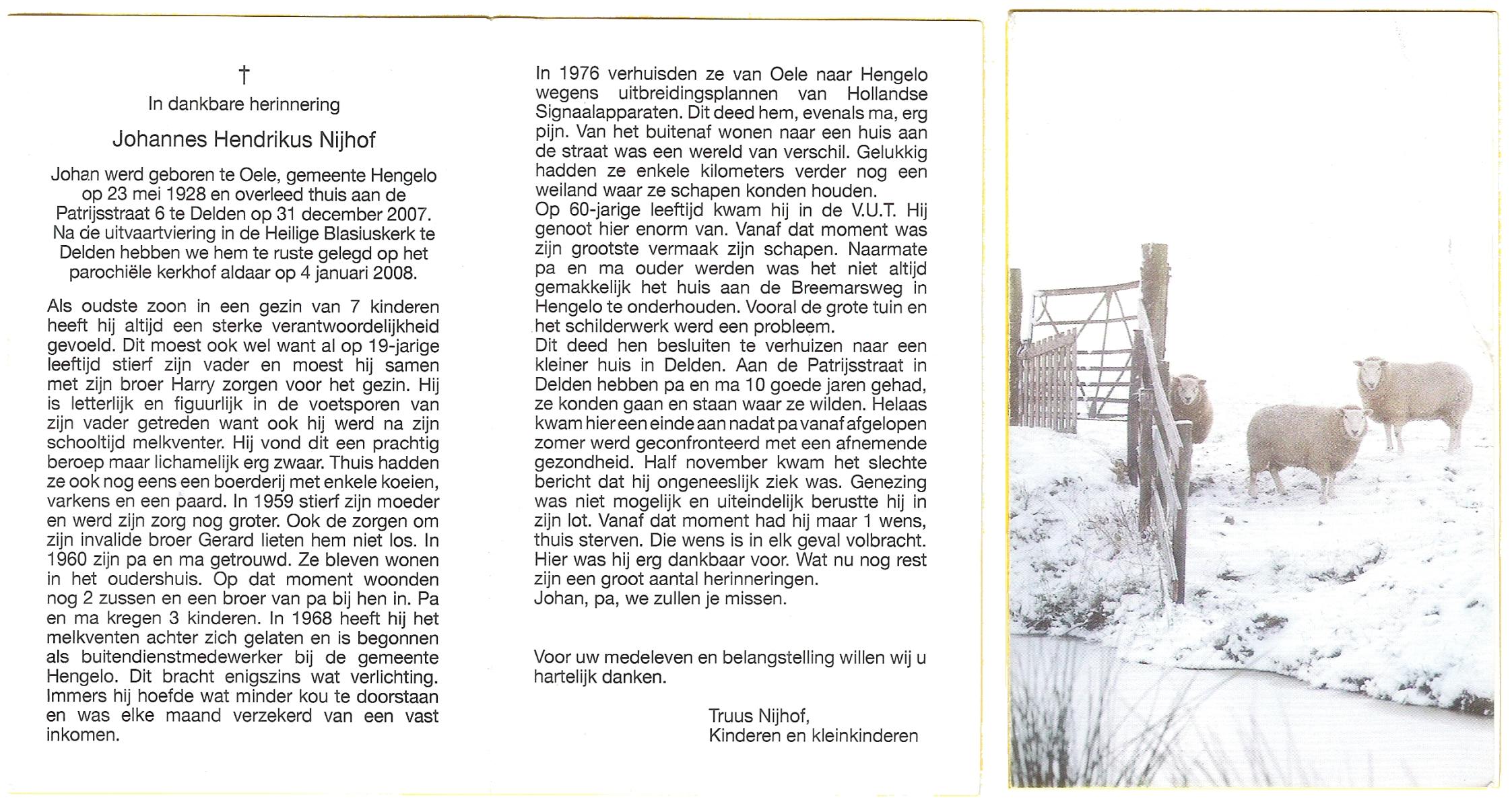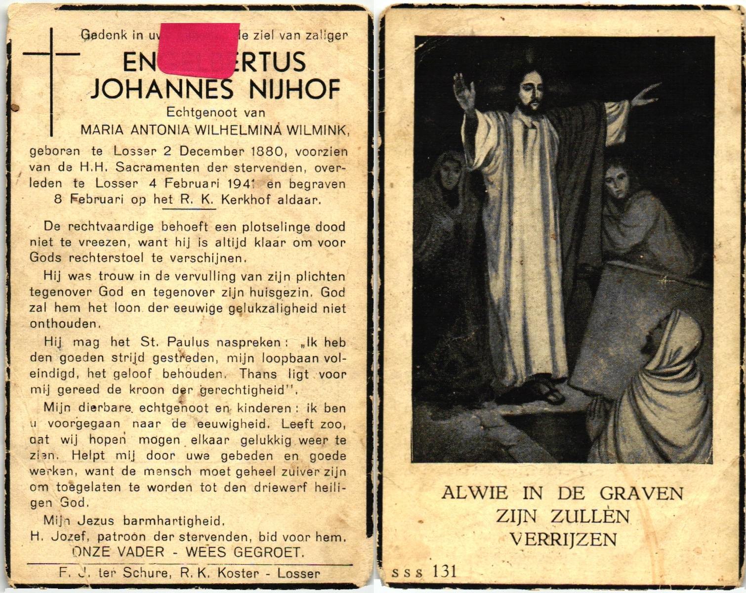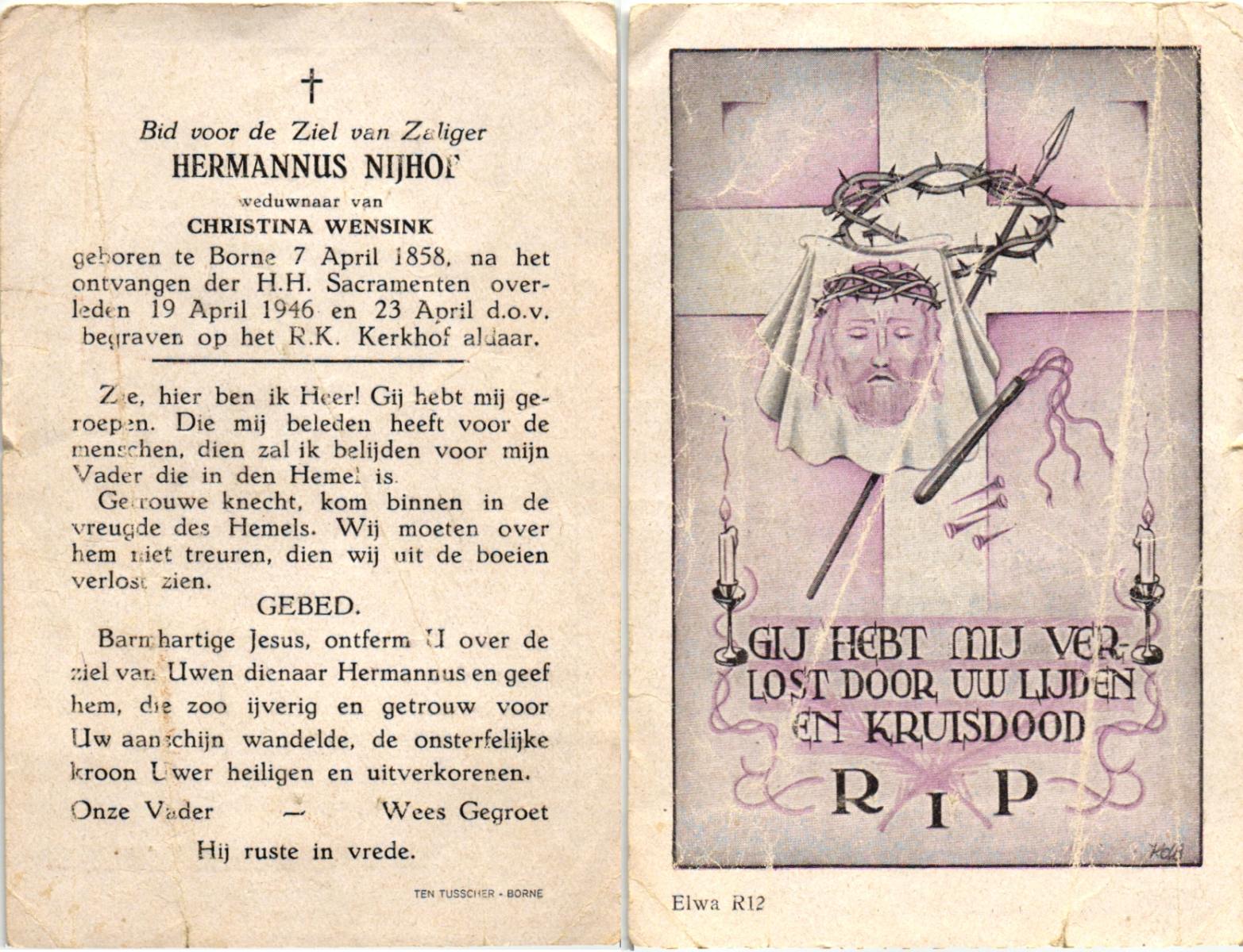 NIJHUIS, Johannes, geboren op 23-09-1887 te De Lutte, overleden op 3-11-1958 te De Lutte op 71-jarige leeftijd, begraven op 6-11-1958 te De Lutte.