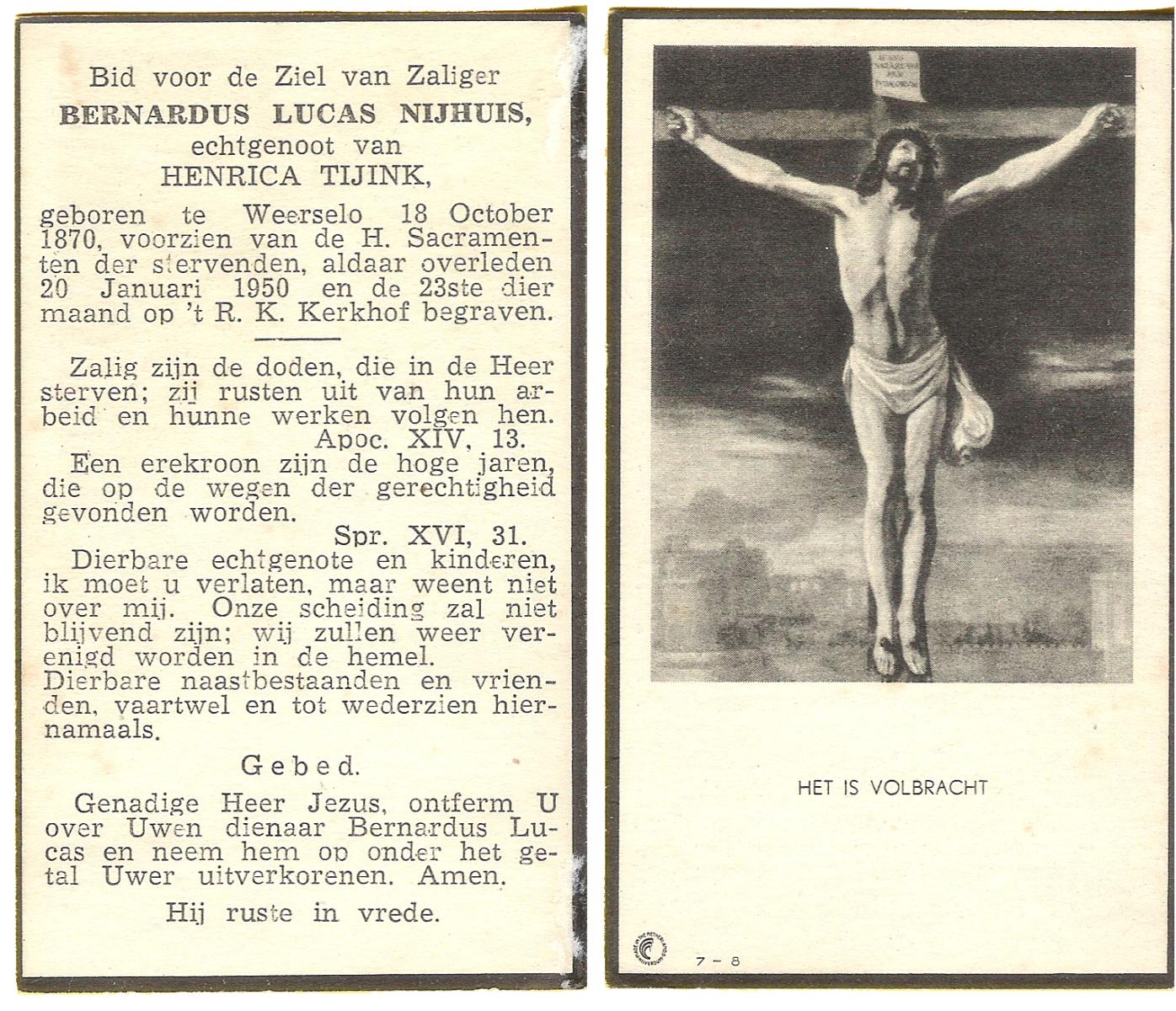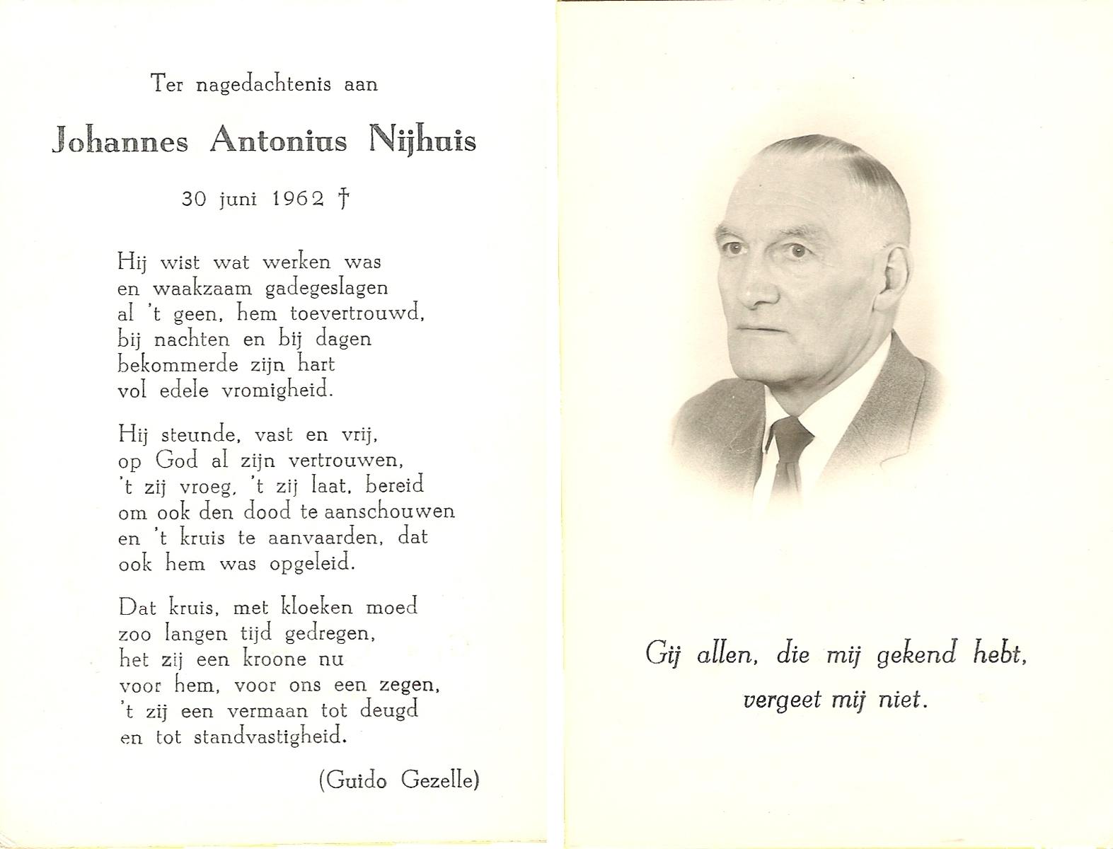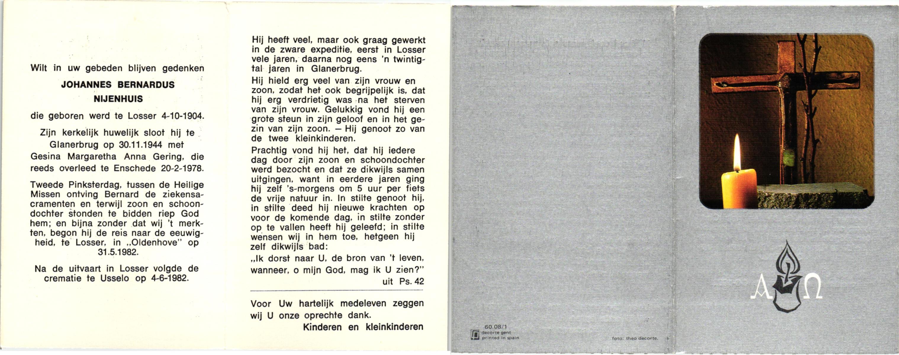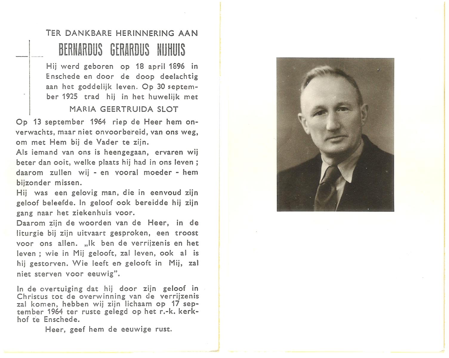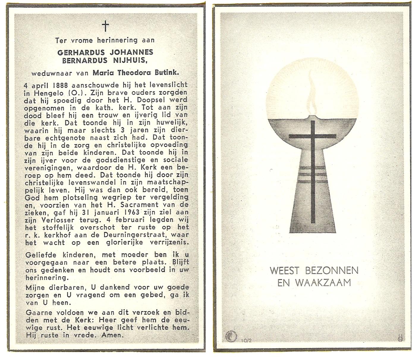 NIJHUIS, Johannes Bernardus, geboren op 28-03-1877 te Denekamp, overleden op 5-1-1962 te De Lutte op 84-jarige leeftijd, begraven op 9-1-1962 te Denekamp.