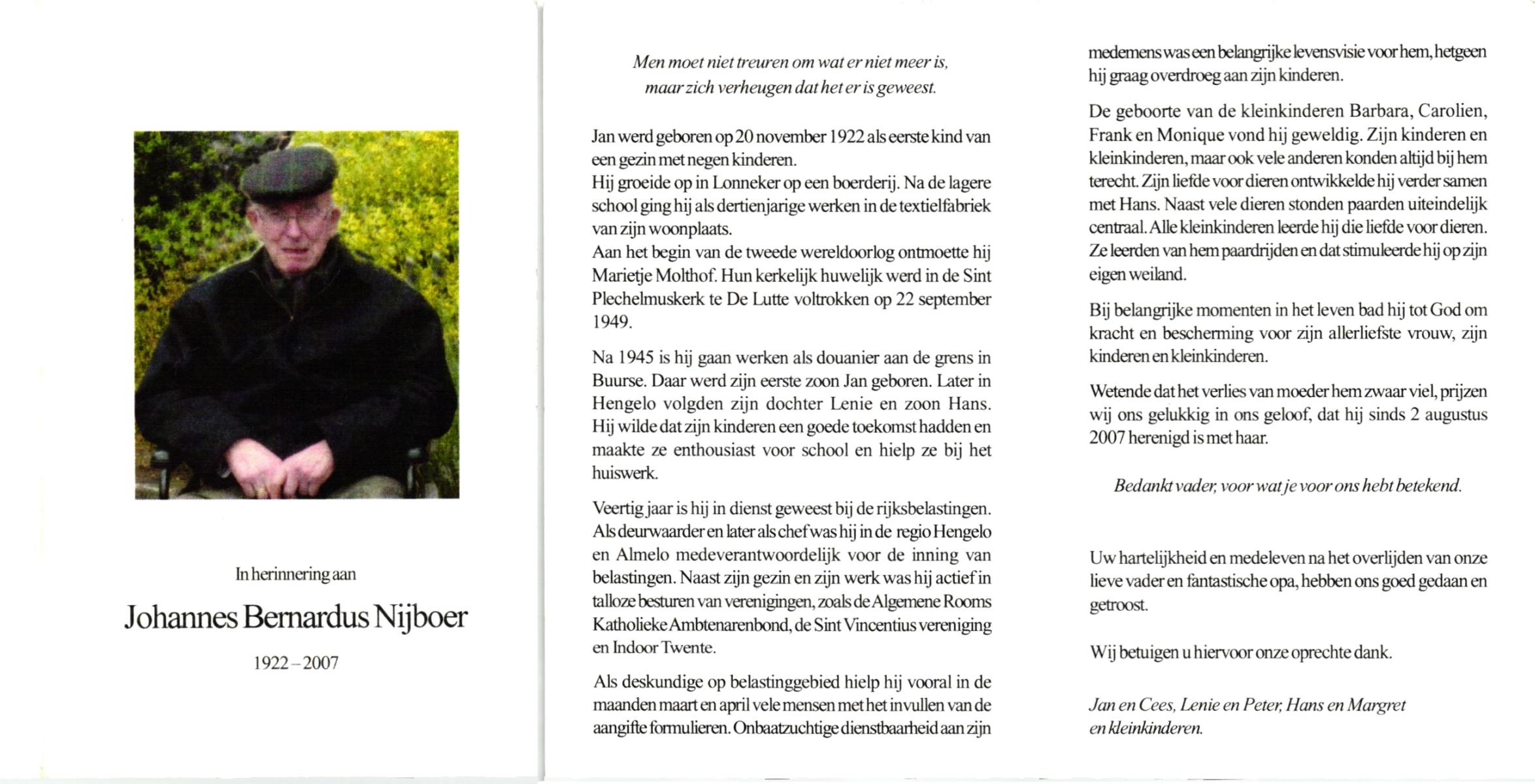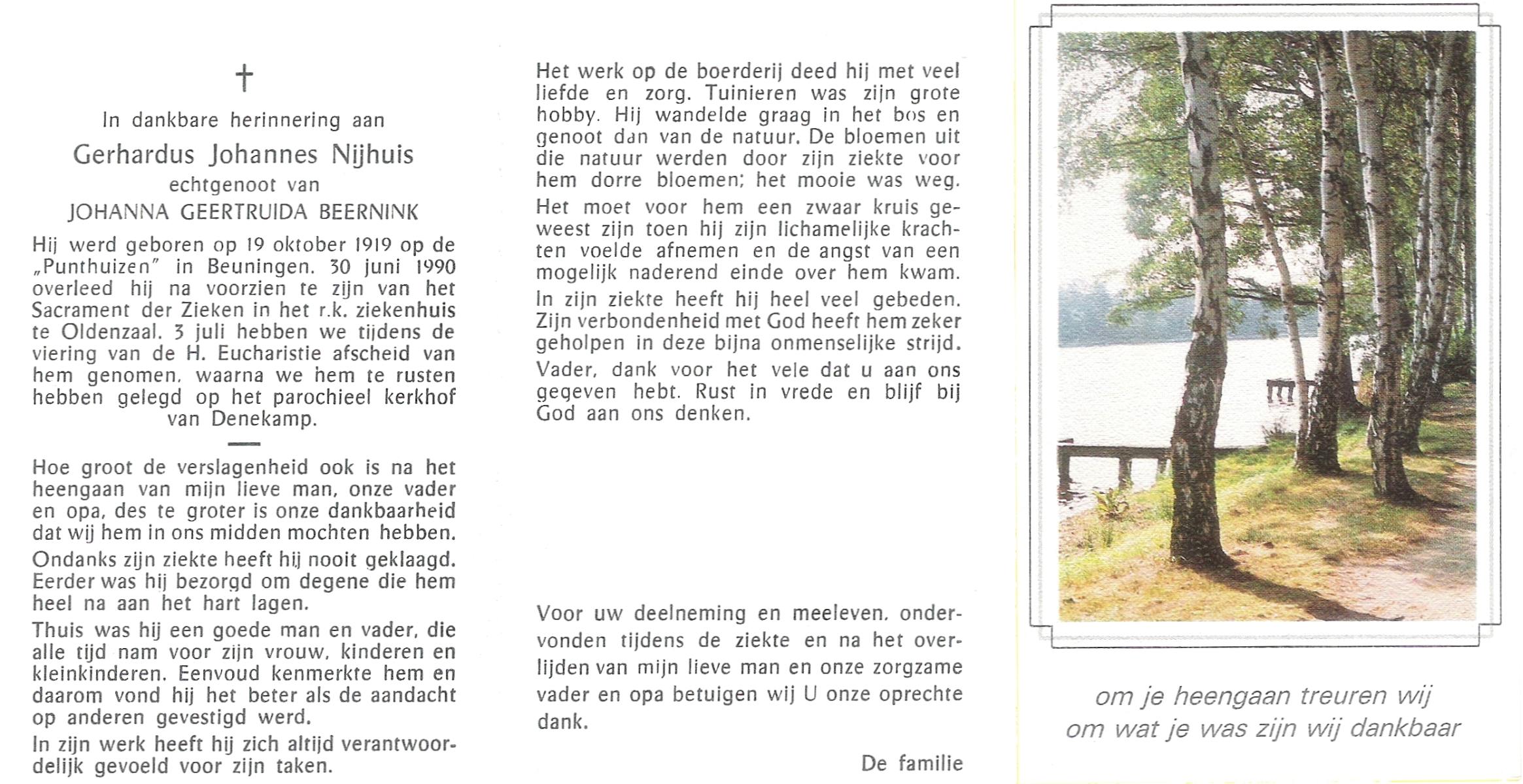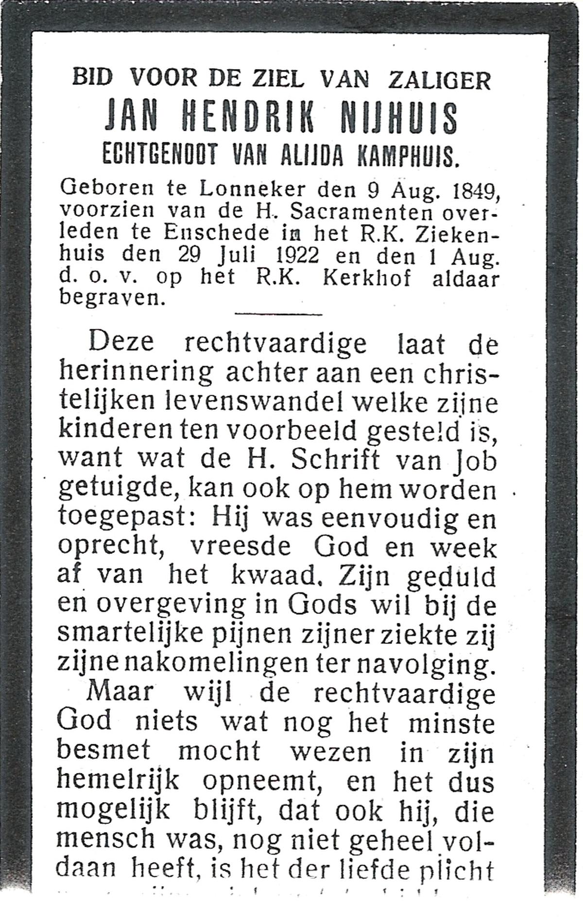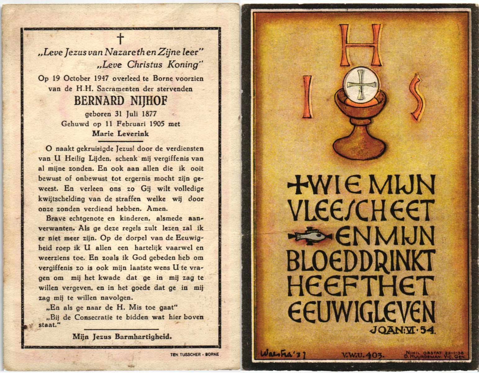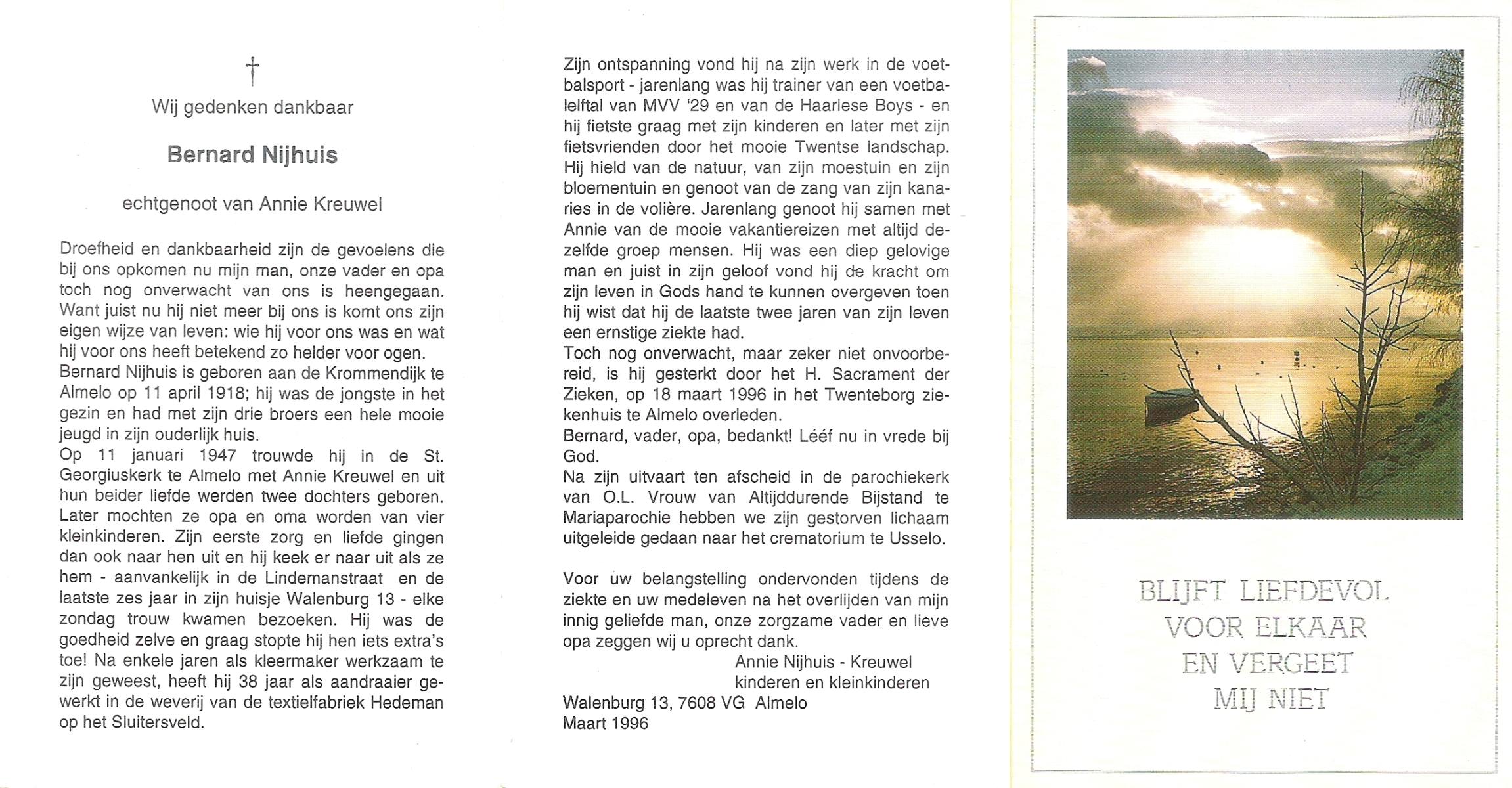 NIJHUIS, Johannes Bernardus, geboren op 28-03-1877 te Denekamp, overleden op 5-1-1962 te De Lutte op 84-jarige leeftijd, begraven op 9-1-1962 te Denekamp.