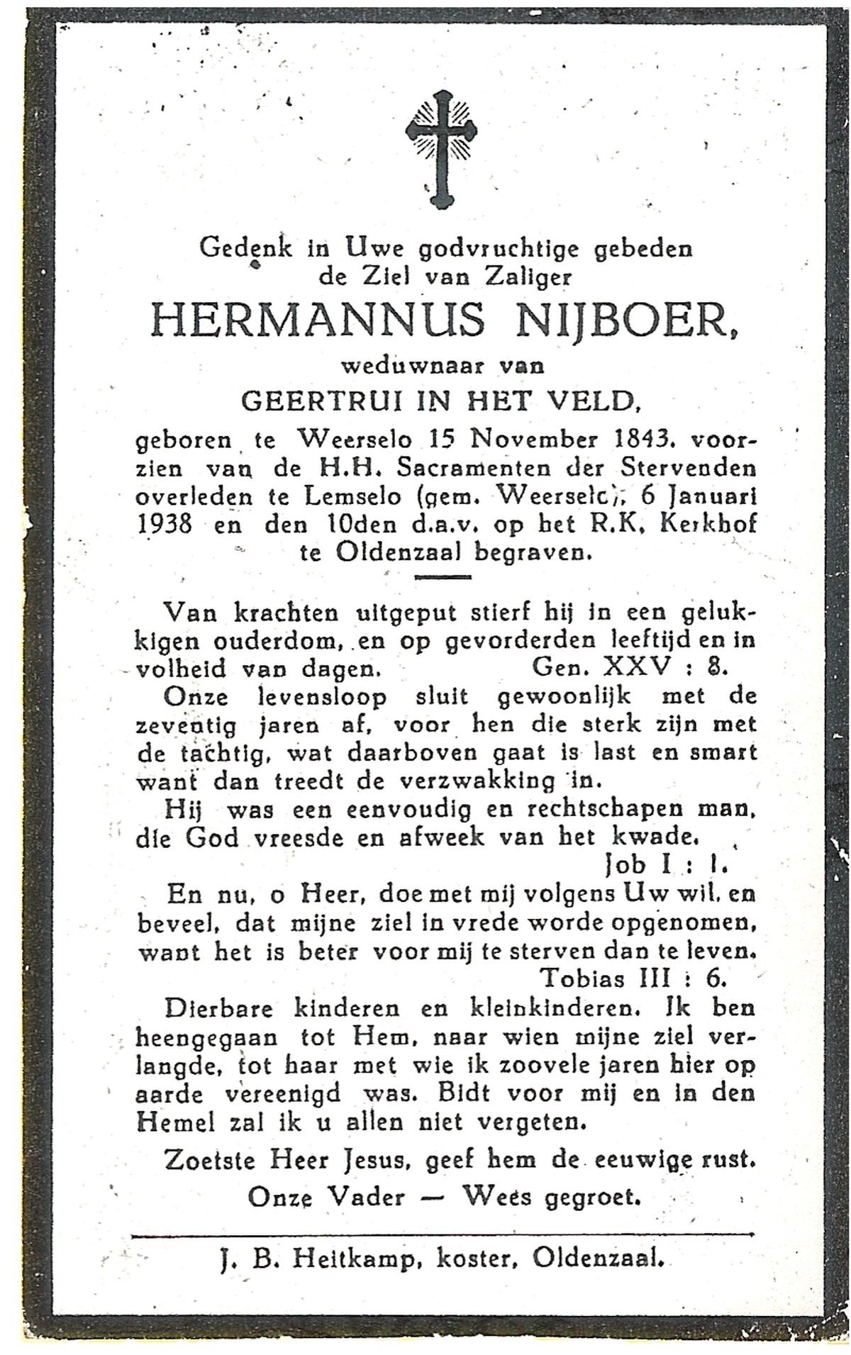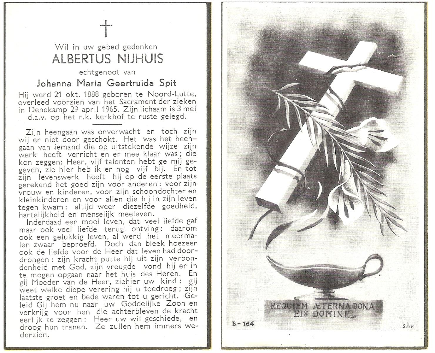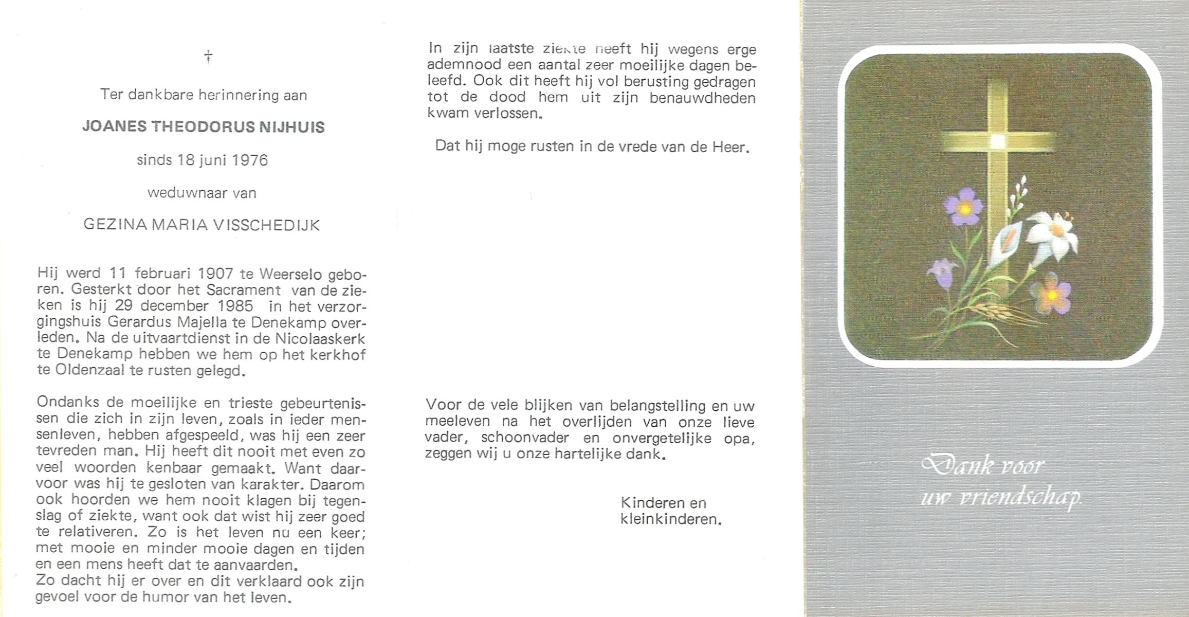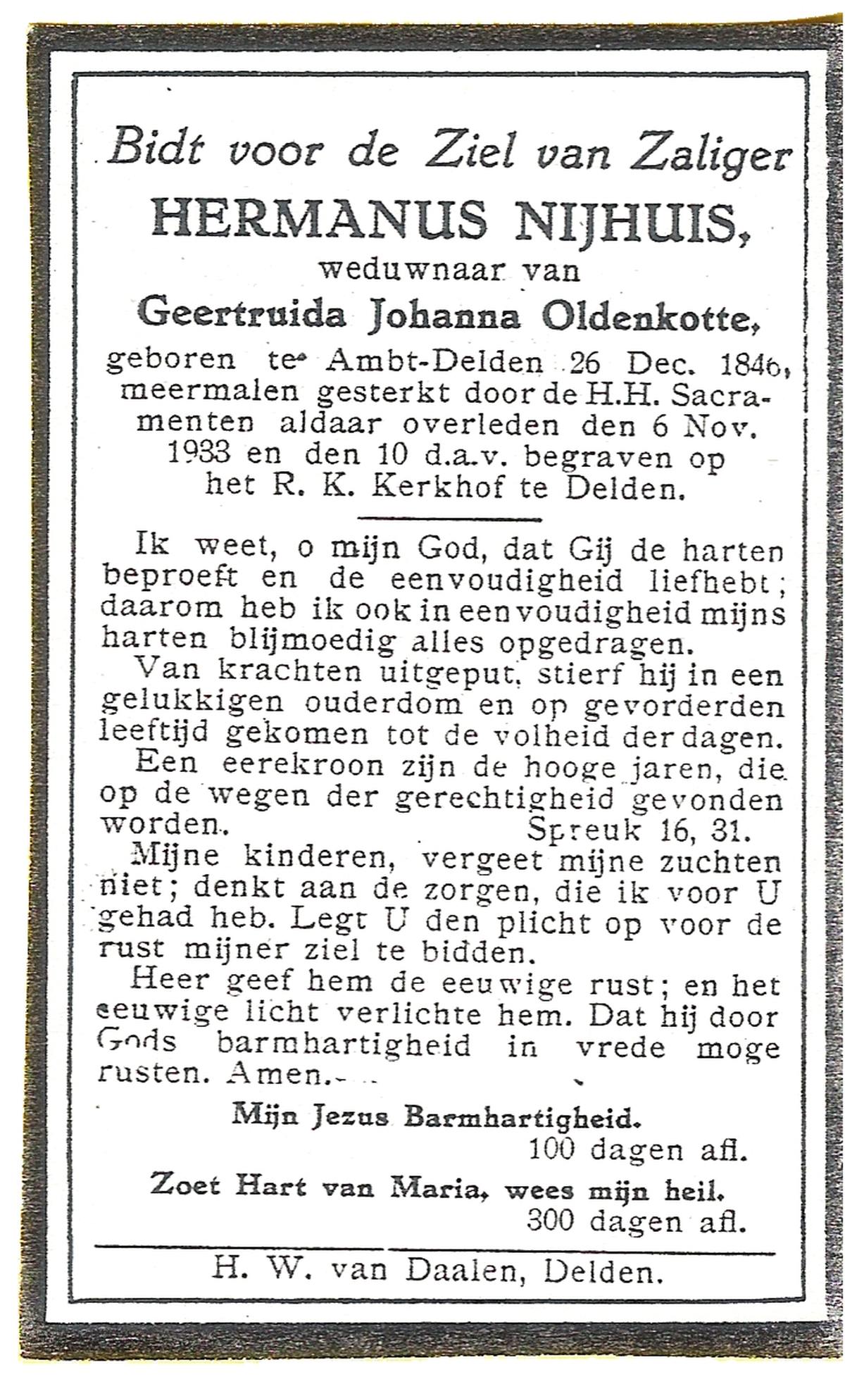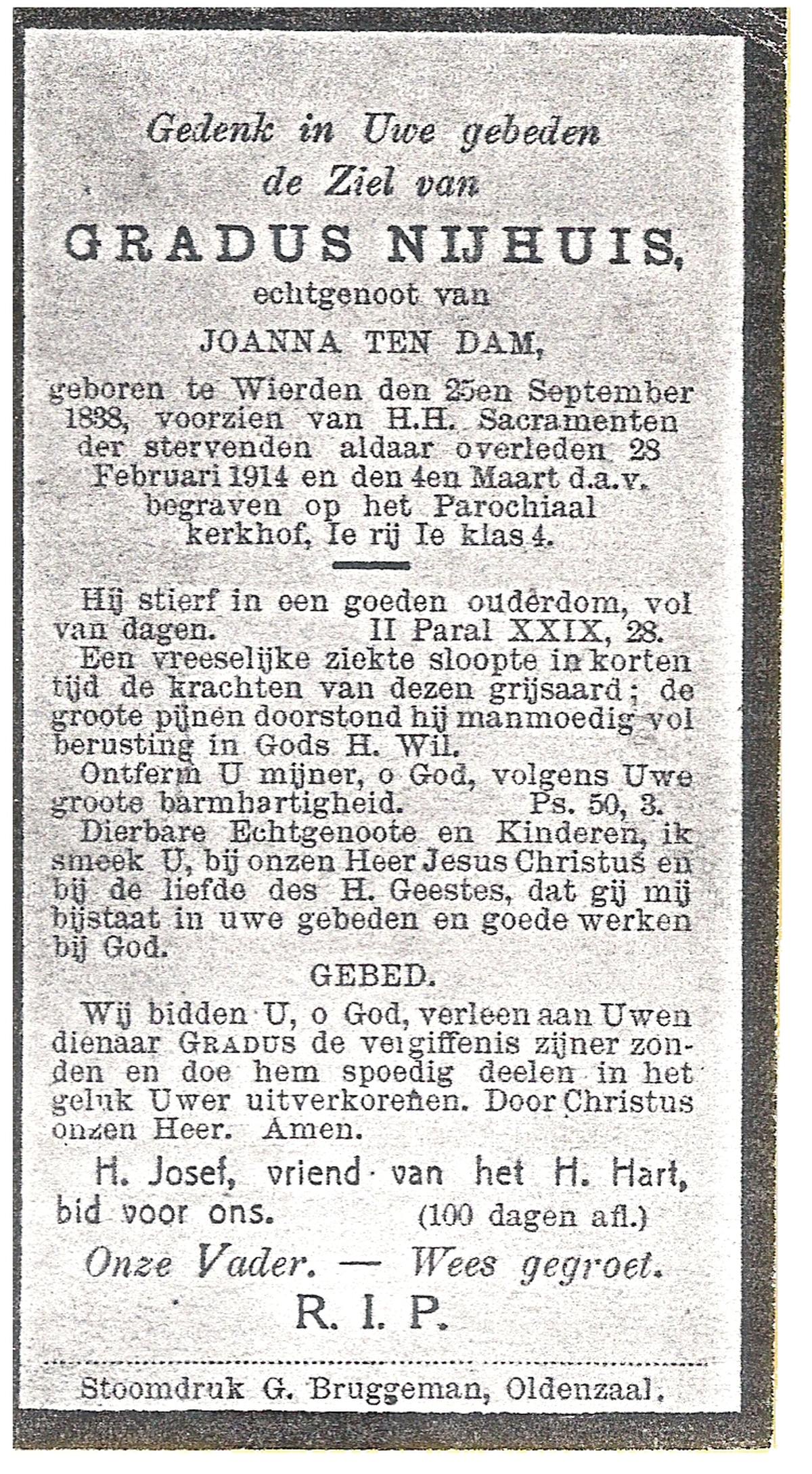 NIJHUIS, Johannes Bernardus, geboren op 28-03-1877 te Denekamp, overleden op 5-1-1962 te De Lutte op 84-jarige leeftijd, begraven op 9-1-1962 te Denekamp.
