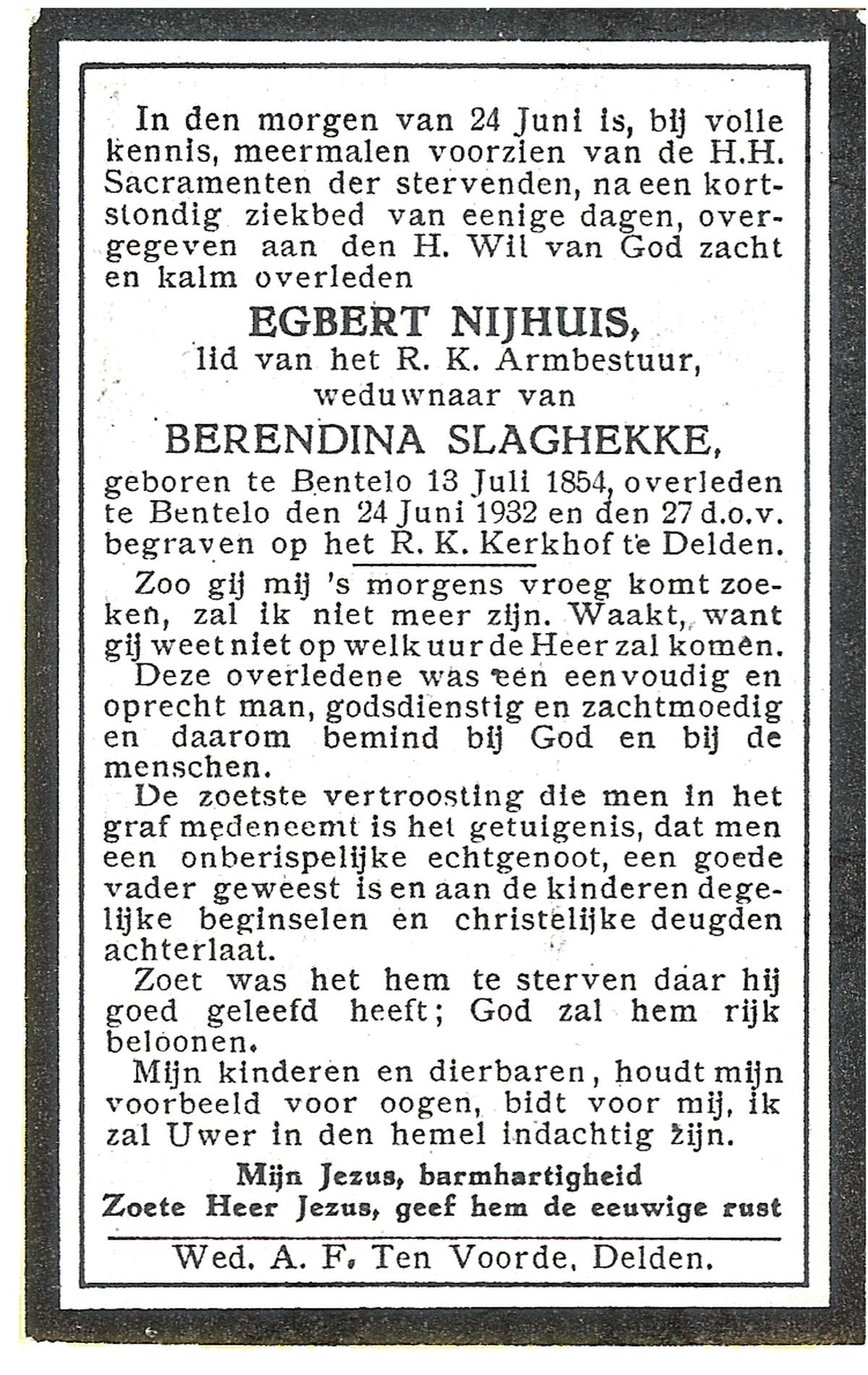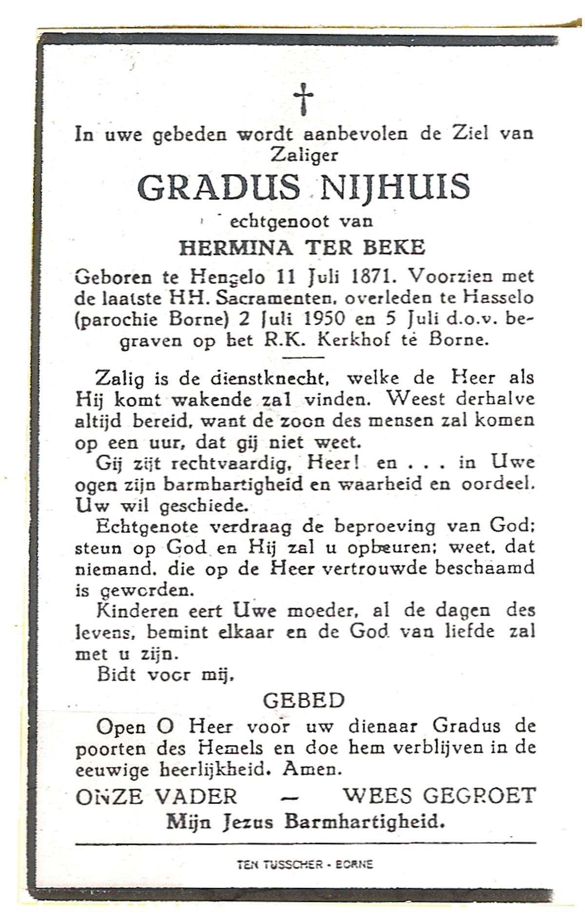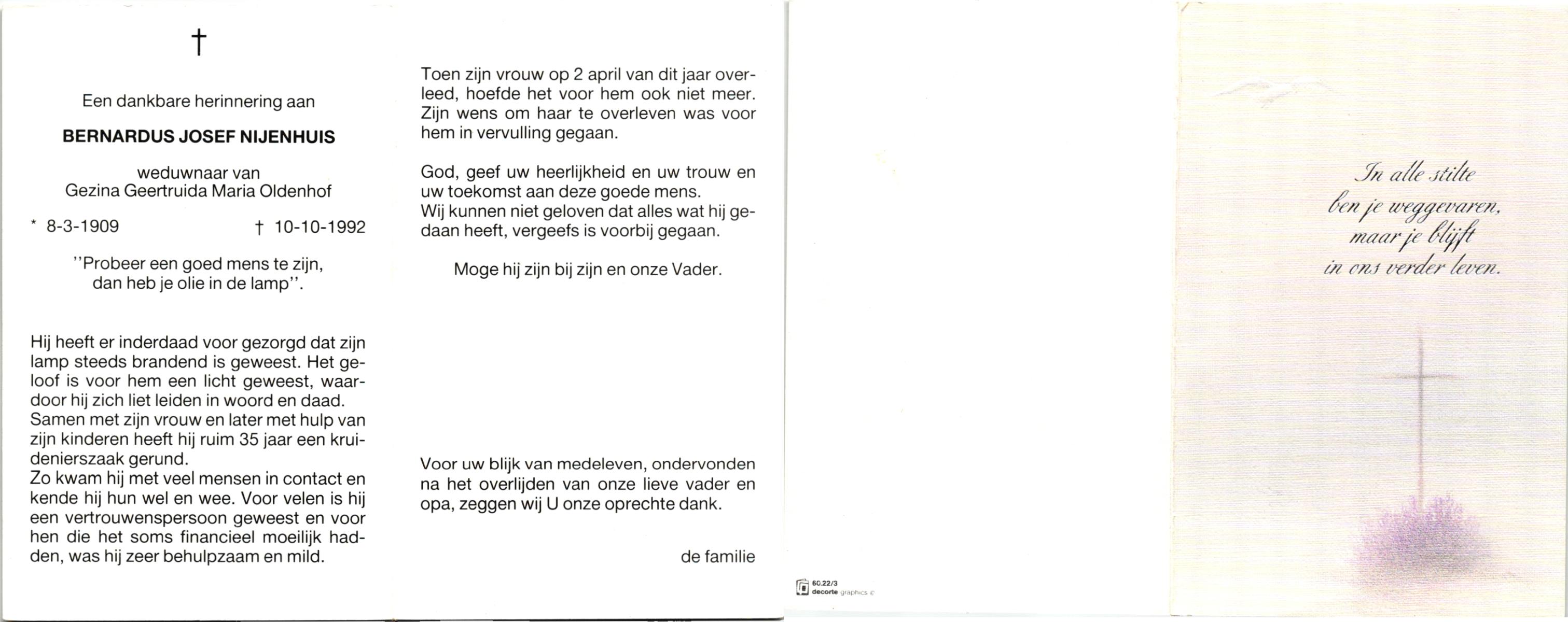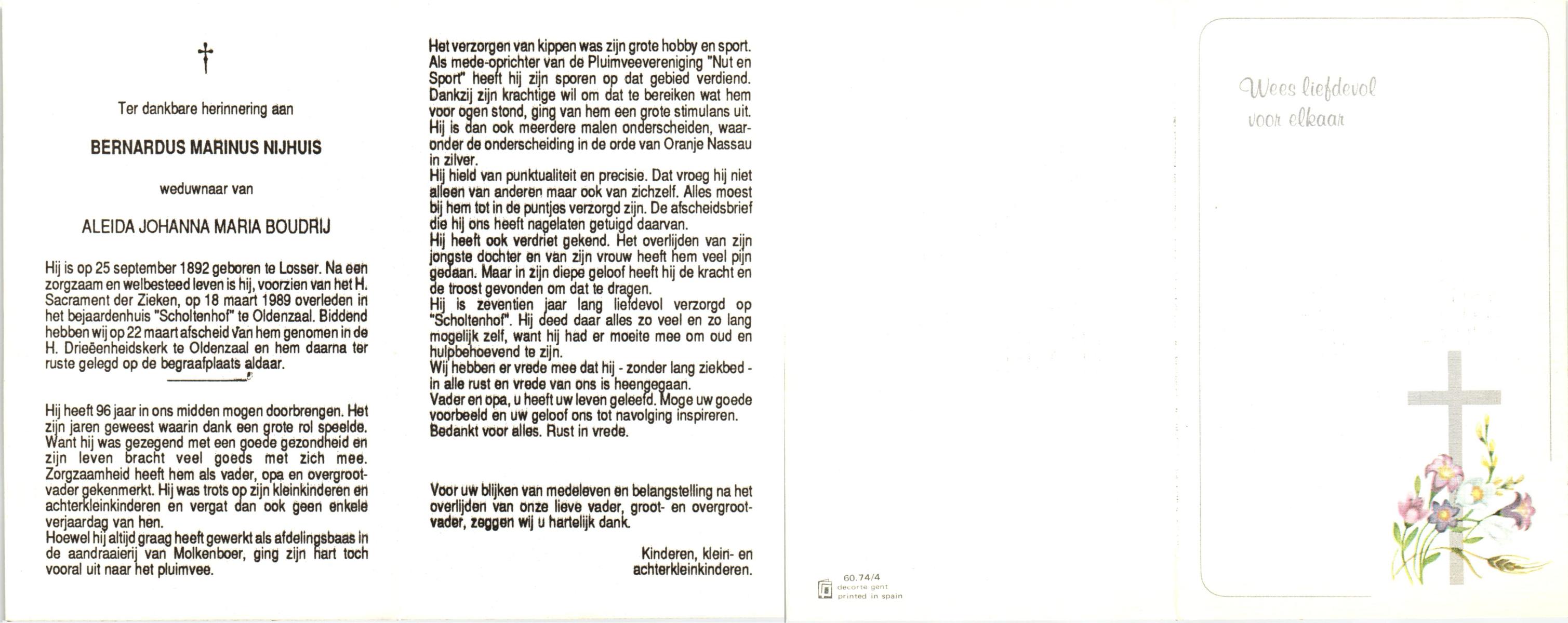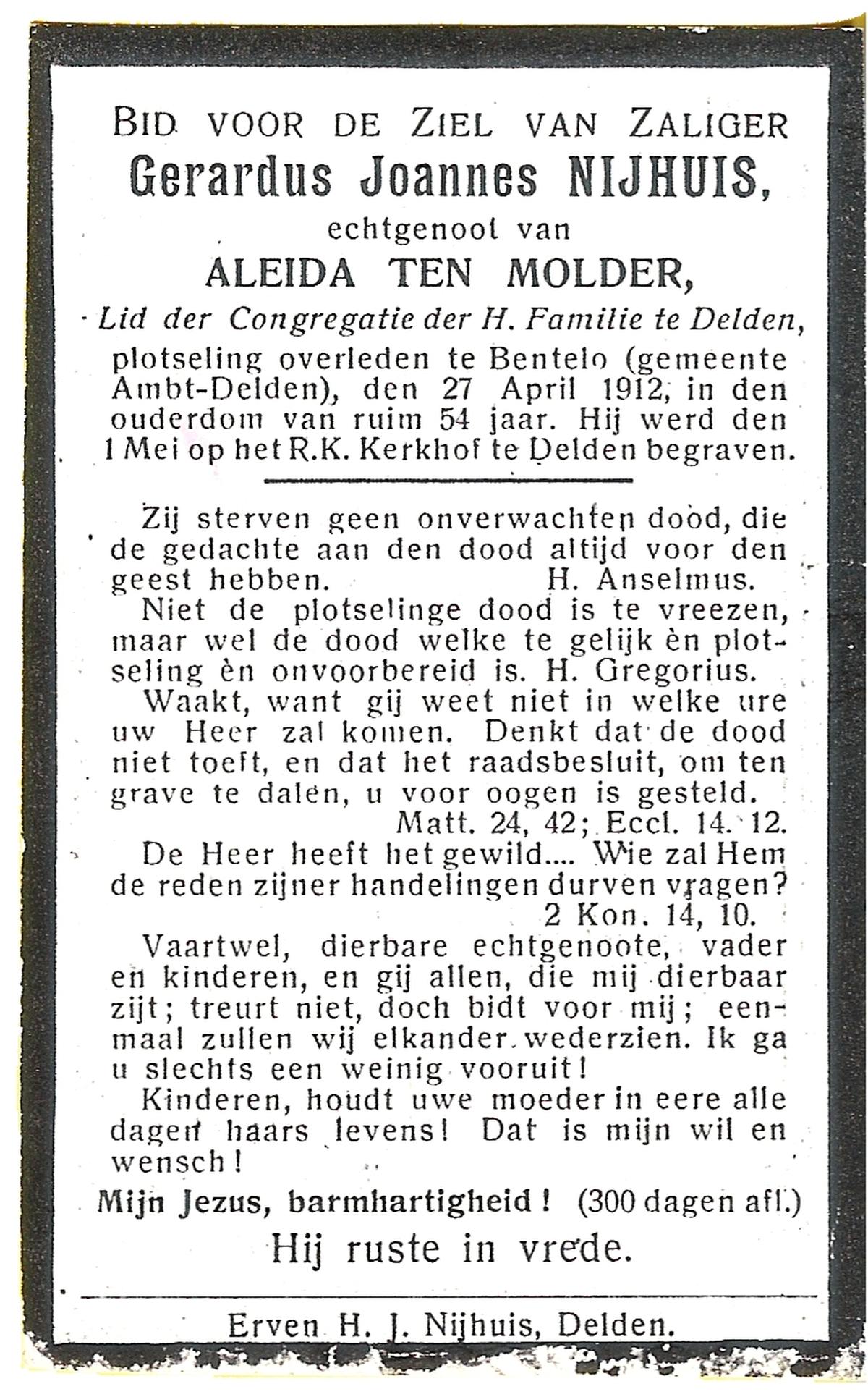 NIJHUIS, Johannes Bernardus, geboren op 28-03-1877 te Denekamp, overleden op 5-1-1962 te De Lutte op 84-jarige leeftijd, begraven op 9-1-1962 te Denekamp.