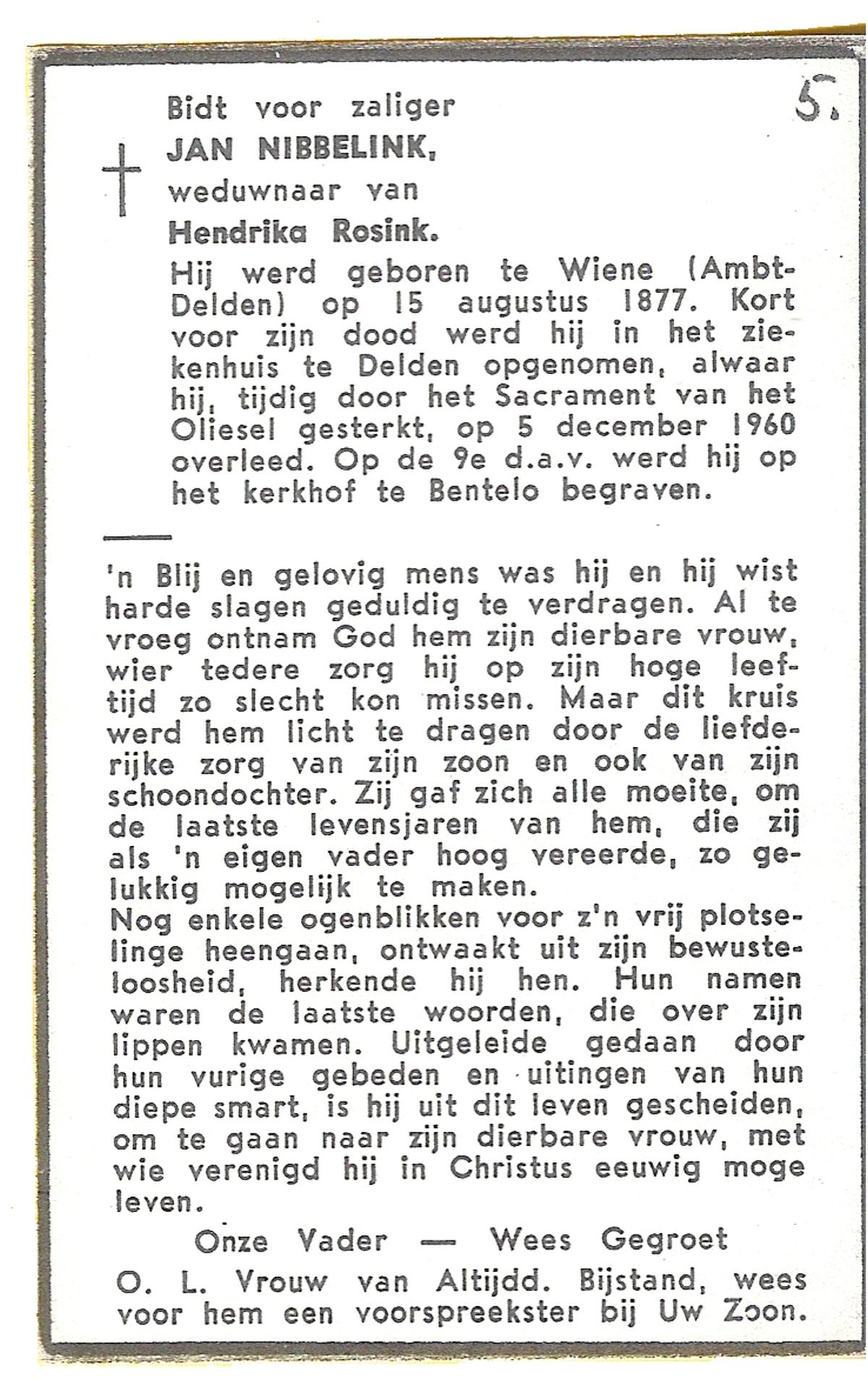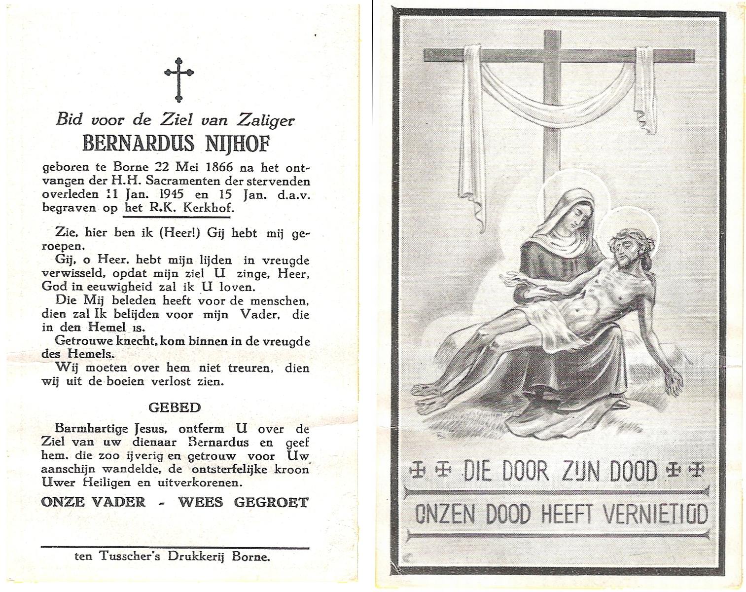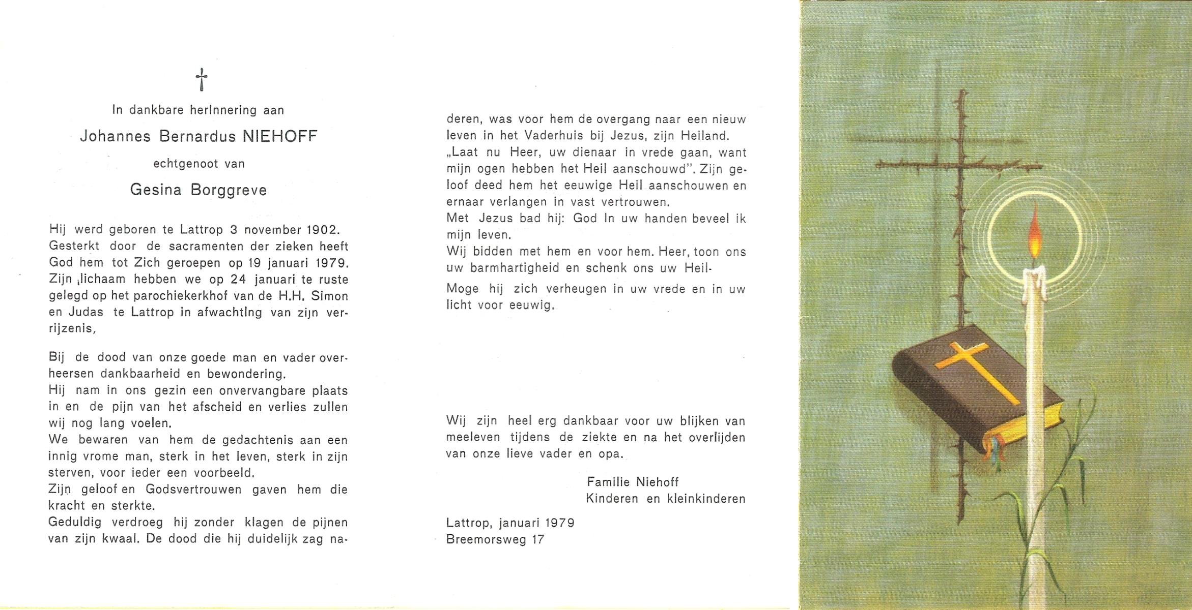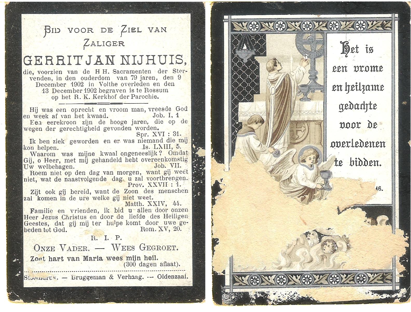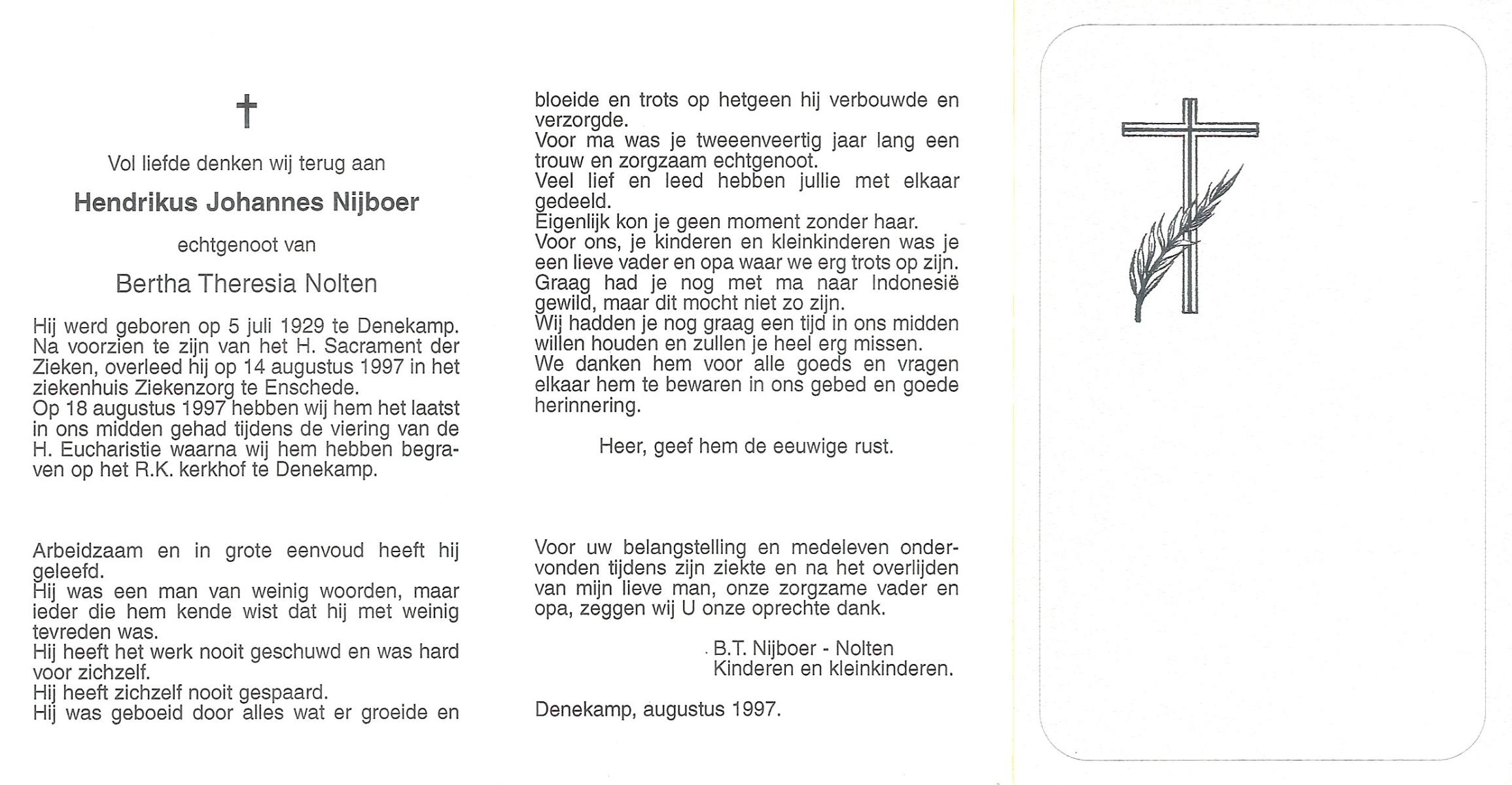NIJHUIS, Johannes Bernardus, geboren op 28-03-1877 te Denekamp, overleden op 5-1-1962 te De Lutte op 84-jarige leeftijd, begraven op 9-1-1962 te Denekamp.