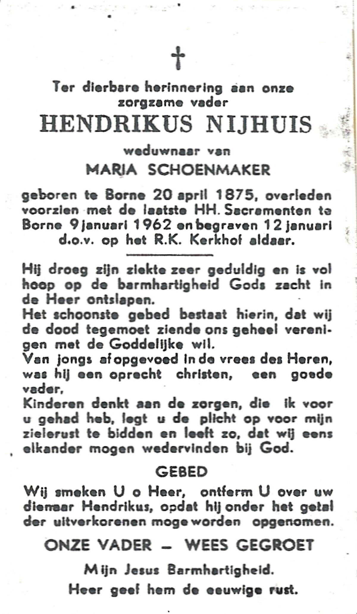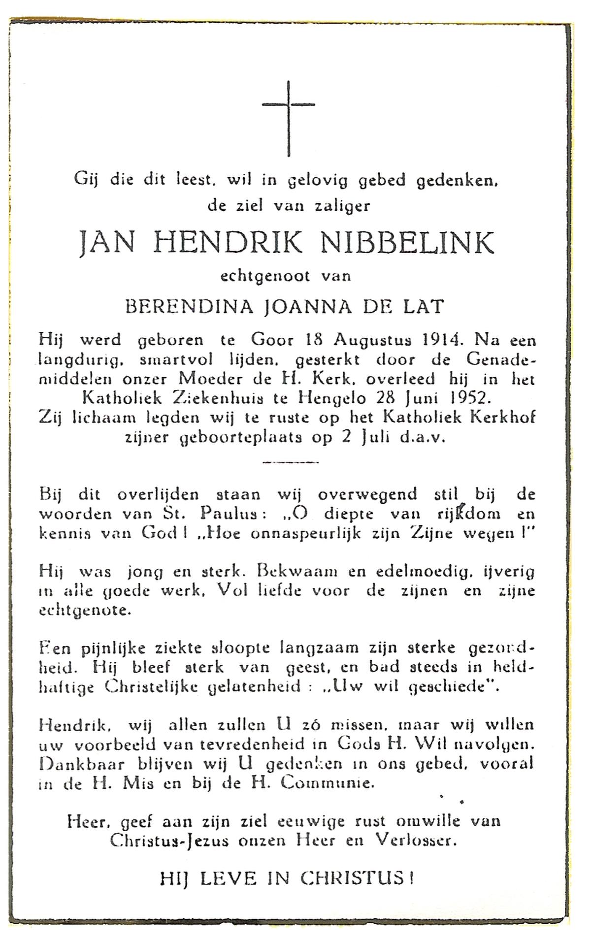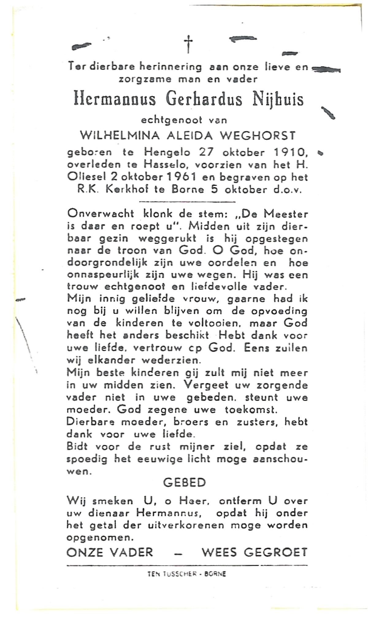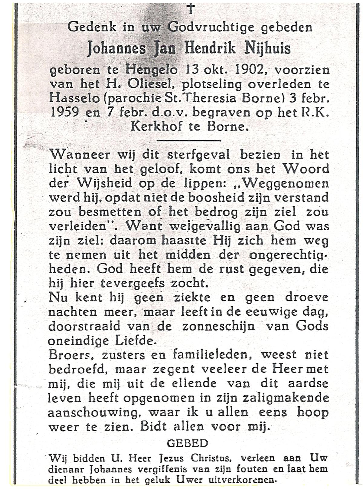 NIJHUIS, Johannes Jan Hendrik, geboren op 13-10-1902 te Hengelo (O), overleden op 3-2-1959 te Hasselo, Borne op 56-jarige leeftijd, begraven op 7-2-1959 te Borne.