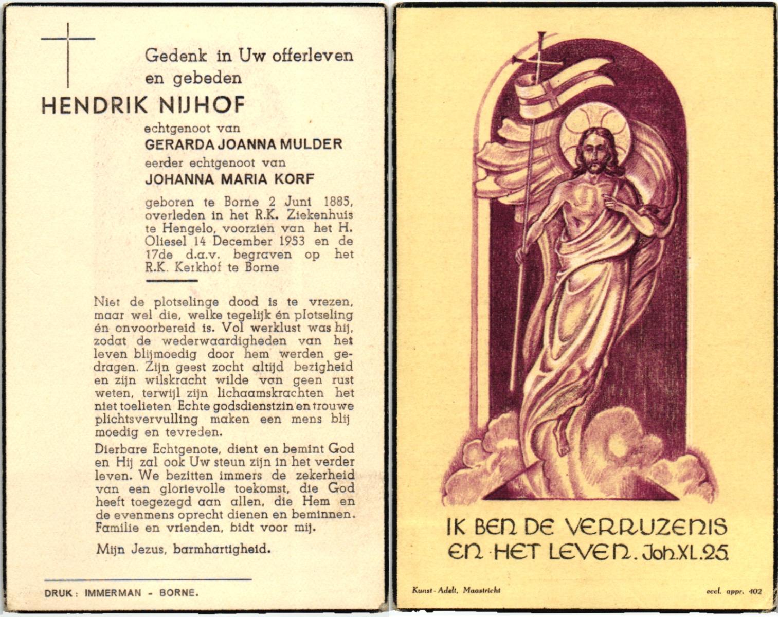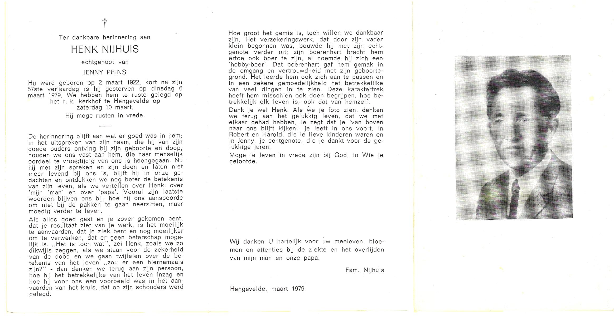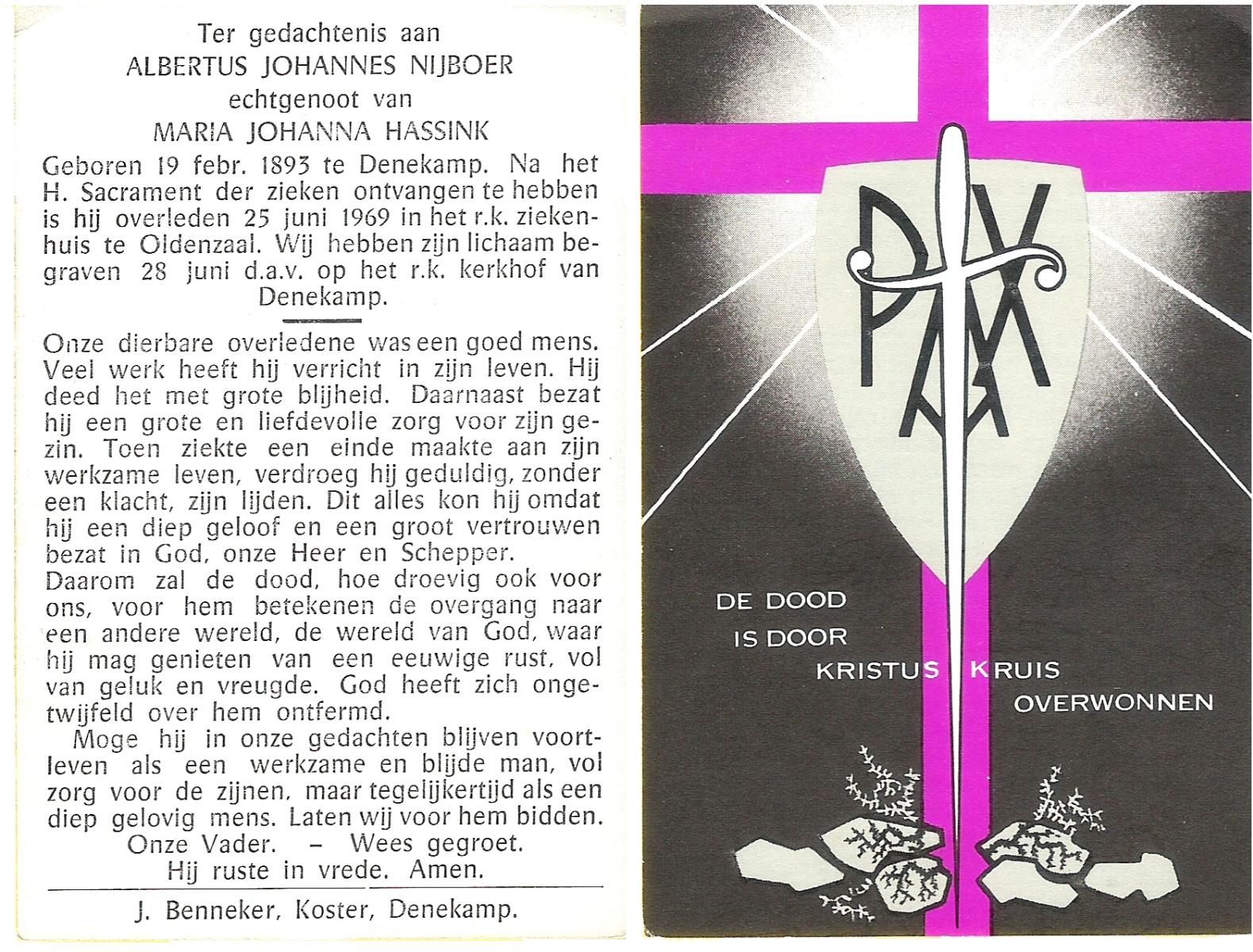 NIJHUIS, Johannes Jan Hendrik, geboren op 13-10-1902 te Hengelo (O), overleden op 3-2-1959 te Hasselo, Borne op 56-jarige leeftijd, begraven op 7-2-1959 te Borne.