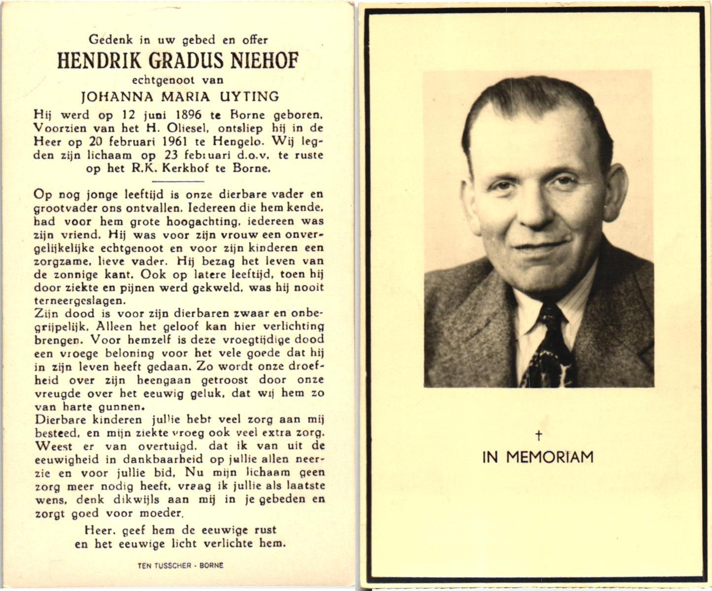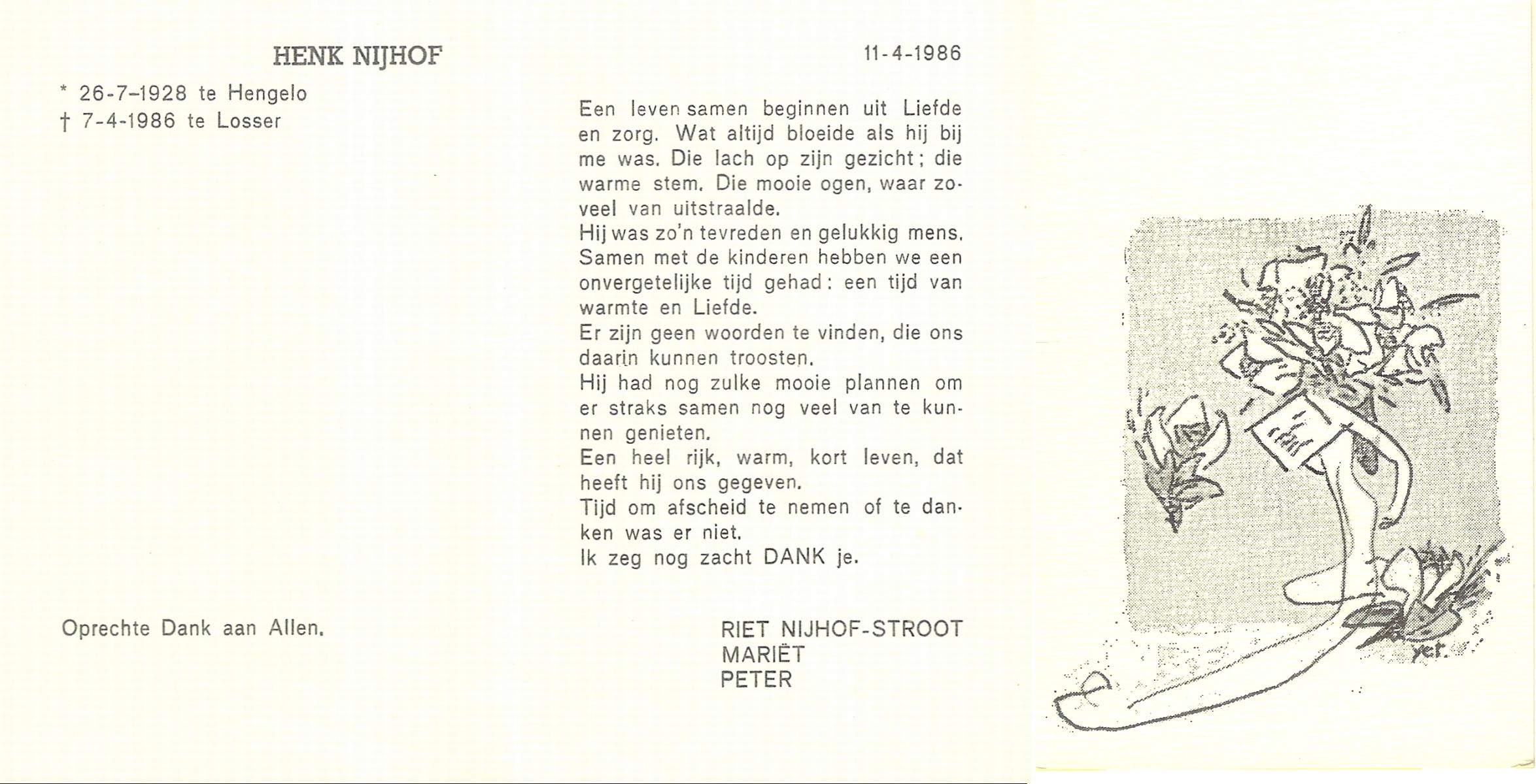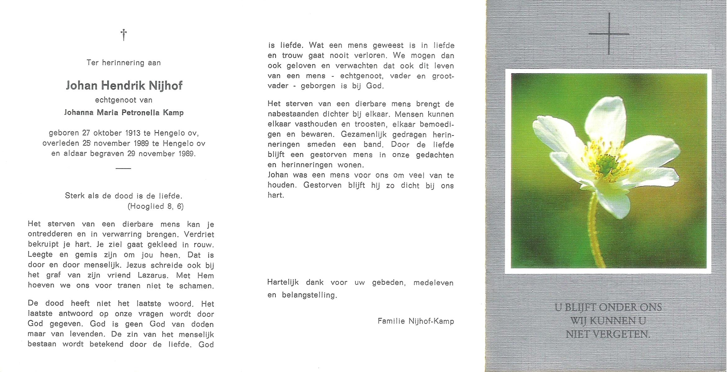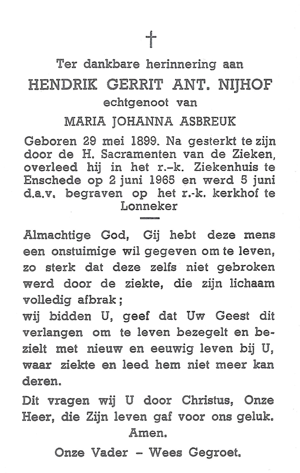 NIJHUIS, Johannes Jan Hendrik, geboren op 13-10-1902 te Hengelo (O), overleden op 3-2-1959 te Hasselo, Borne op 56-jarige leeftijd, begraven op 7-2-1959 te Borne.