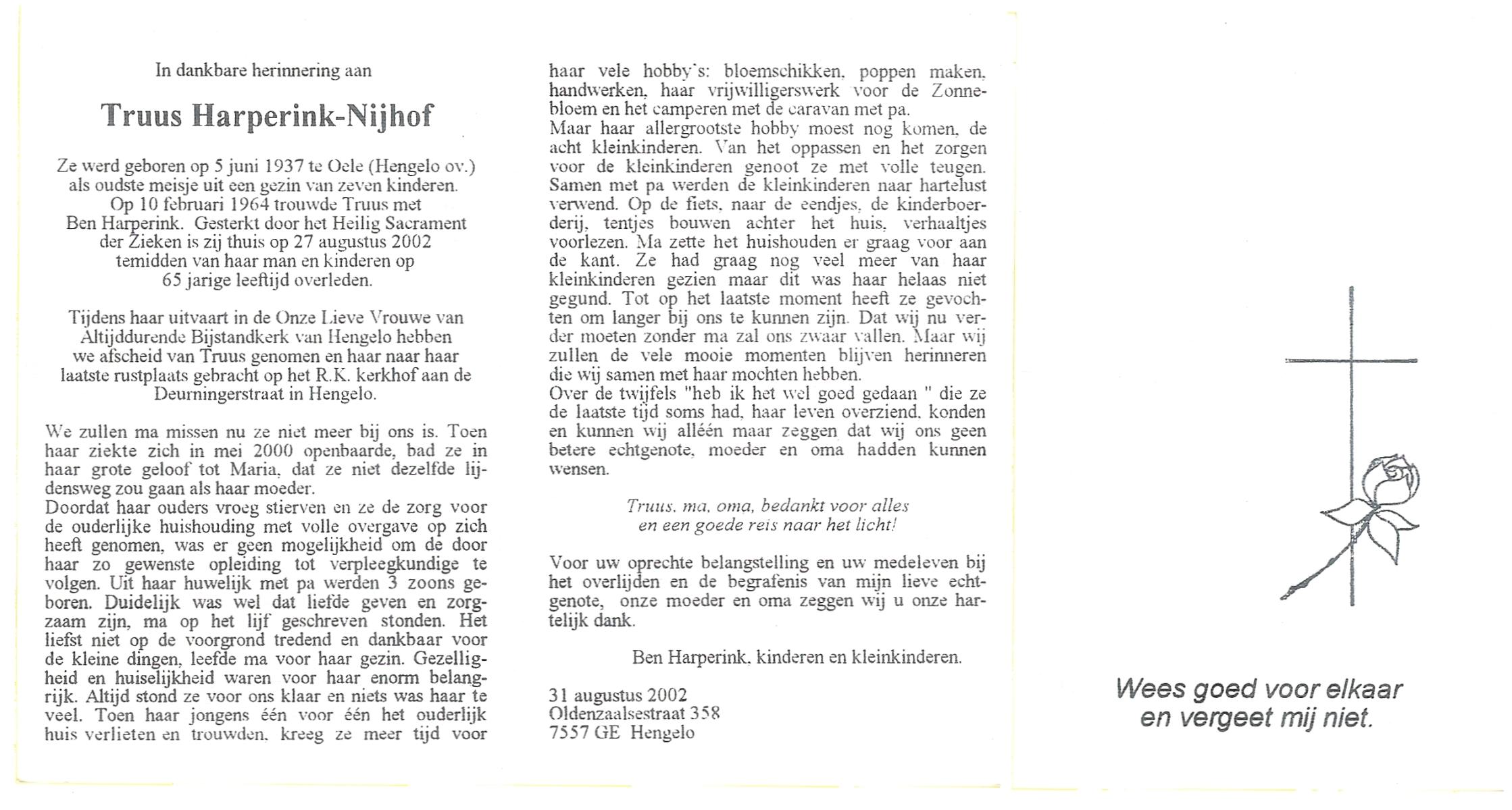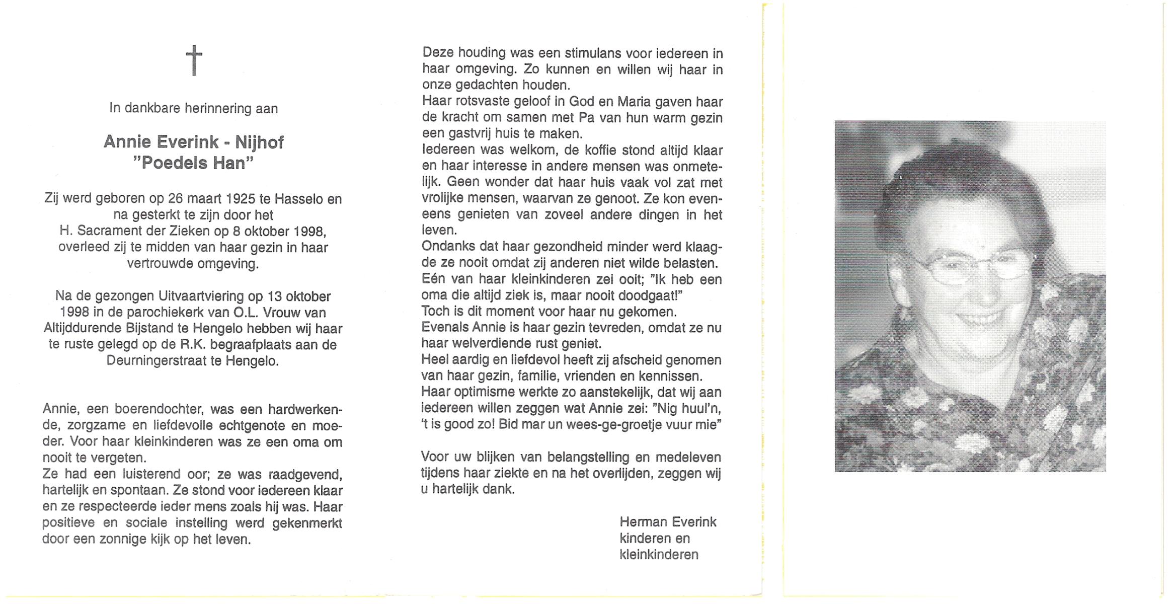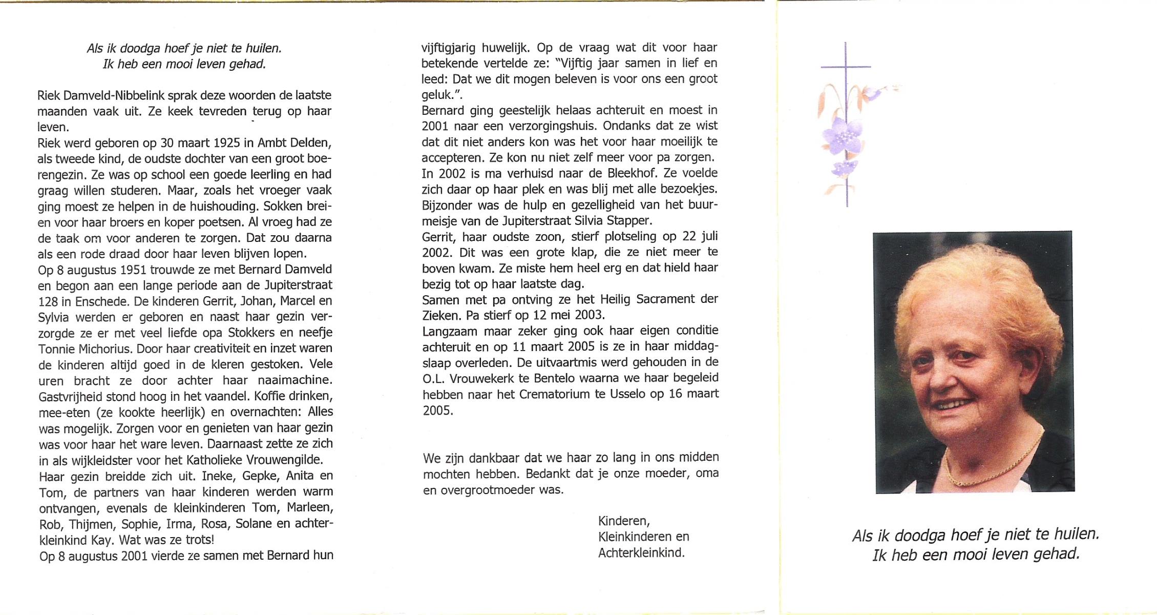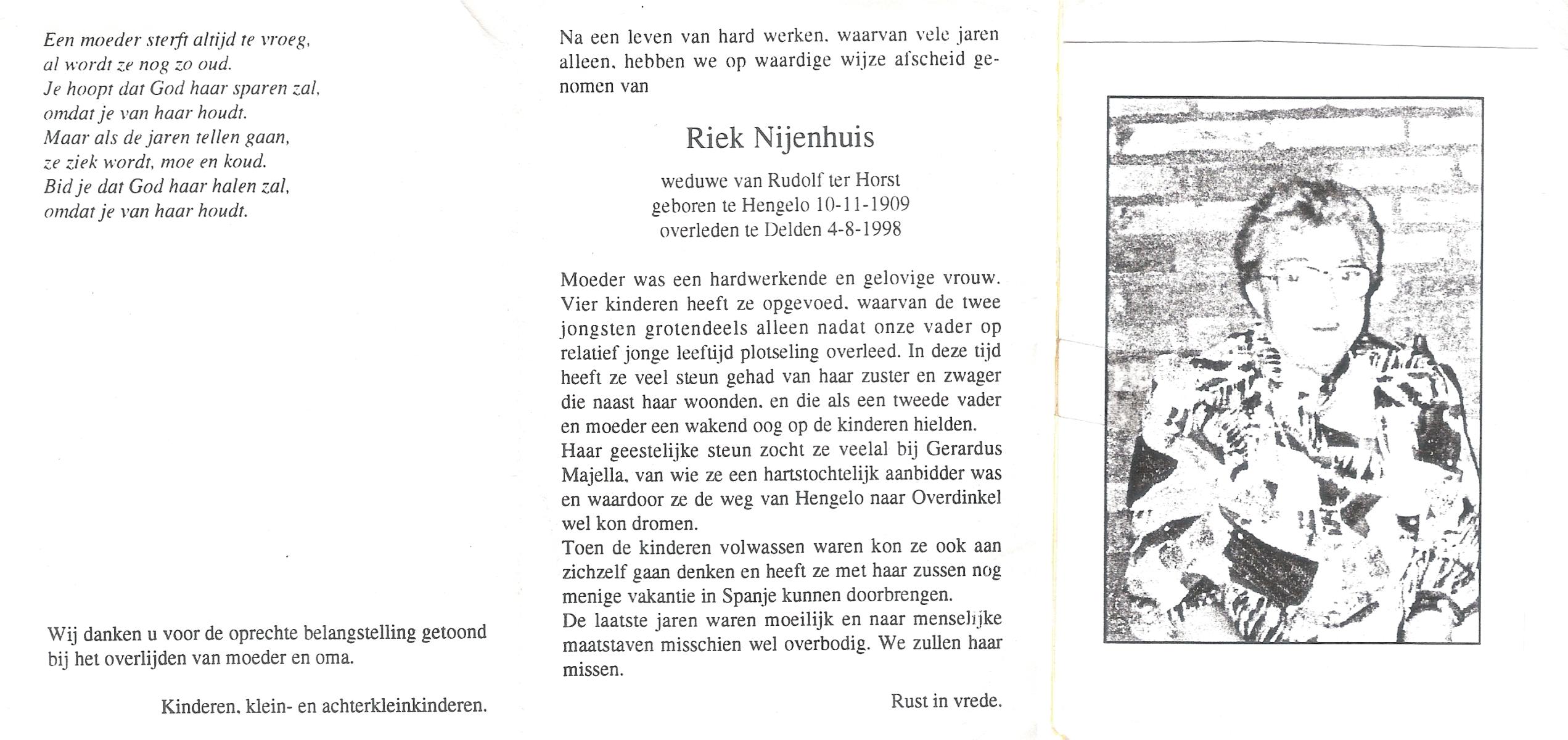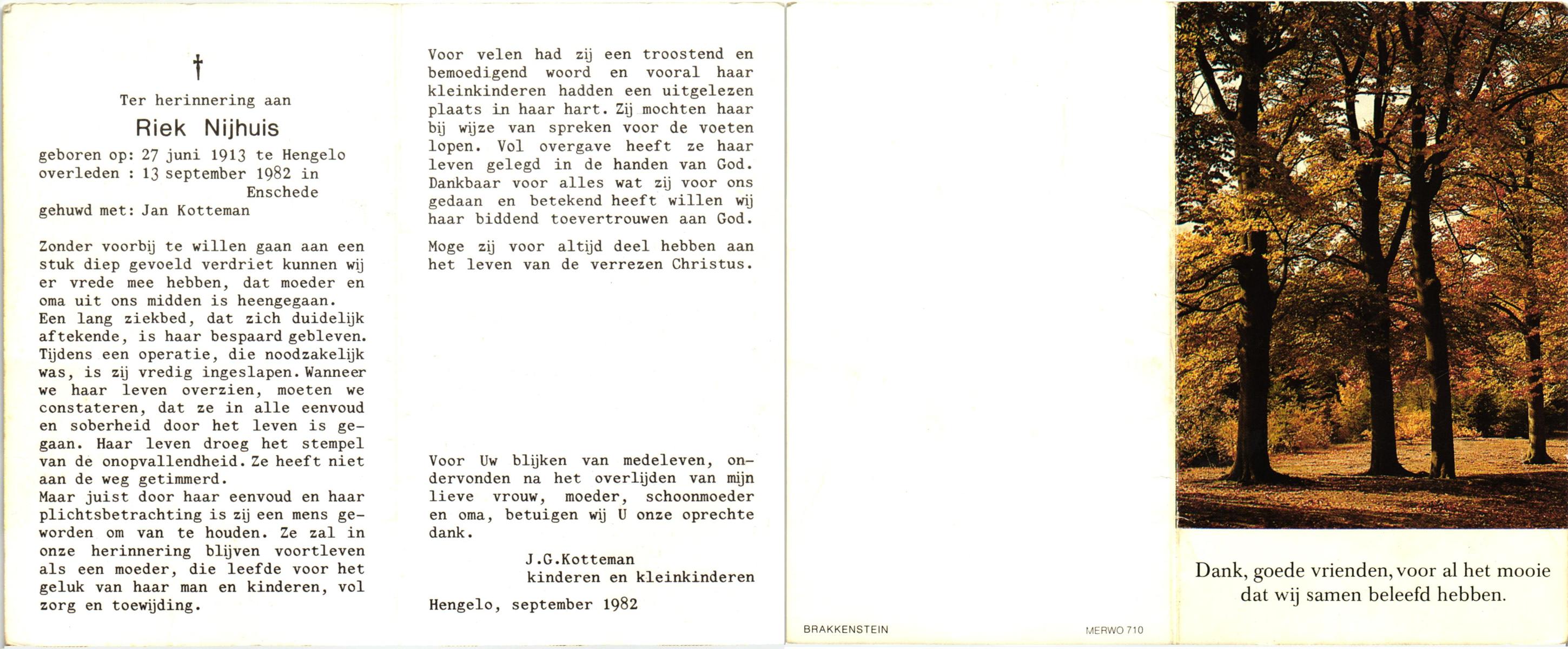 NIJHUIS, Riek, geboren op 27-6-1913 te Hengelo, overleden op 13-9-1982 te Enschede op 69-jarige leeftijd.