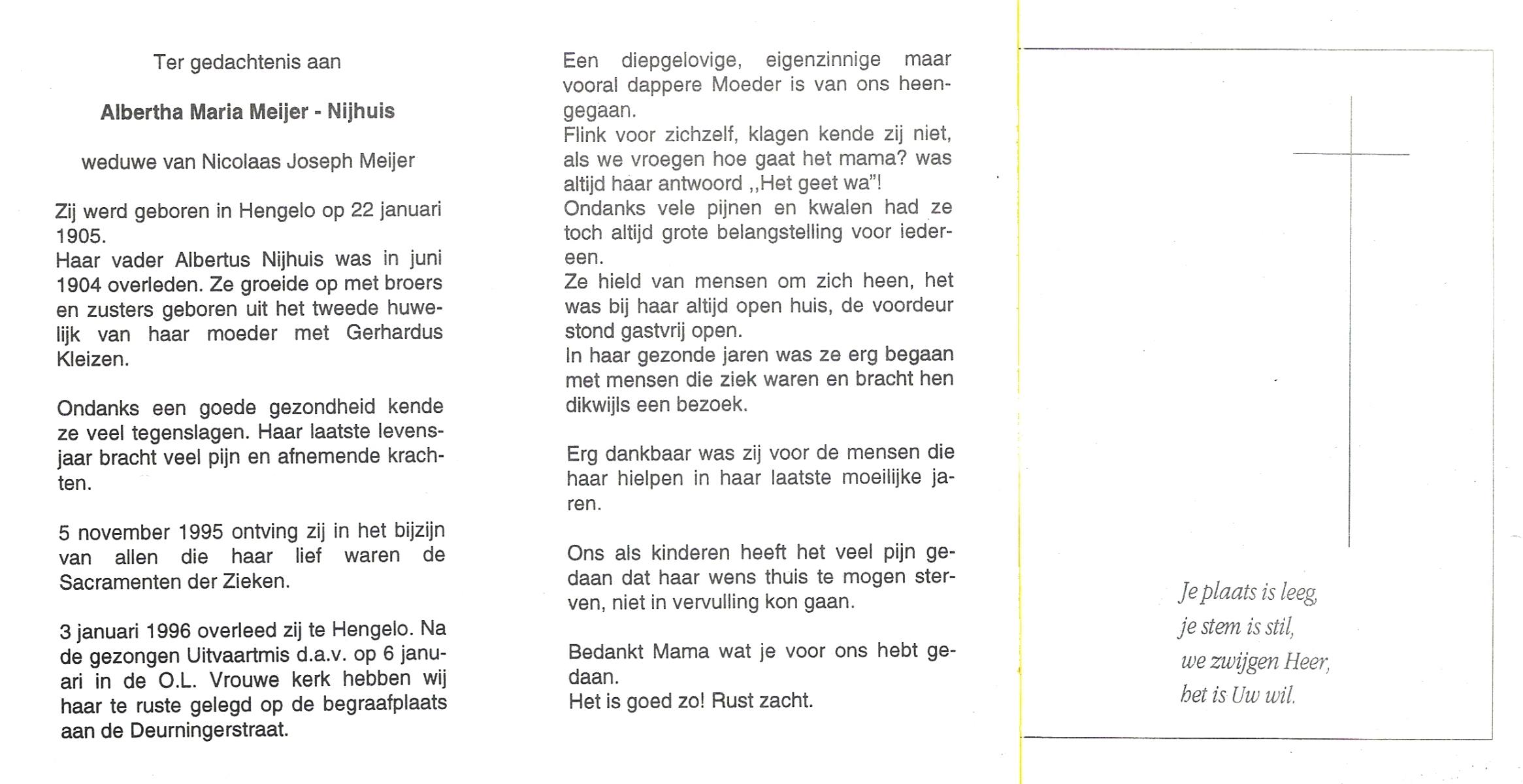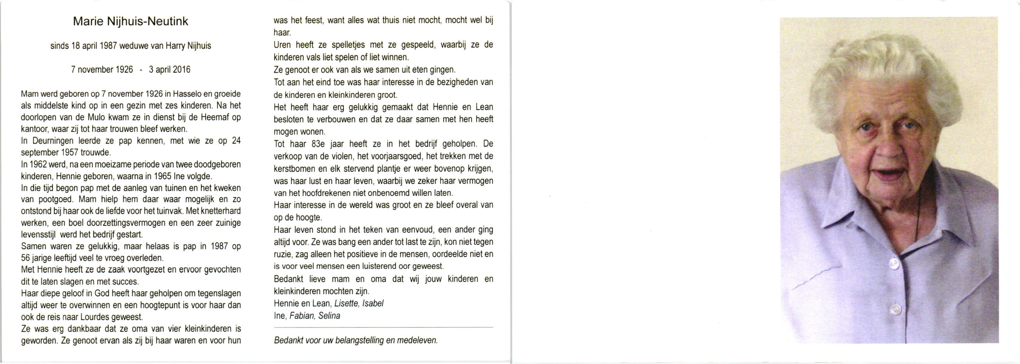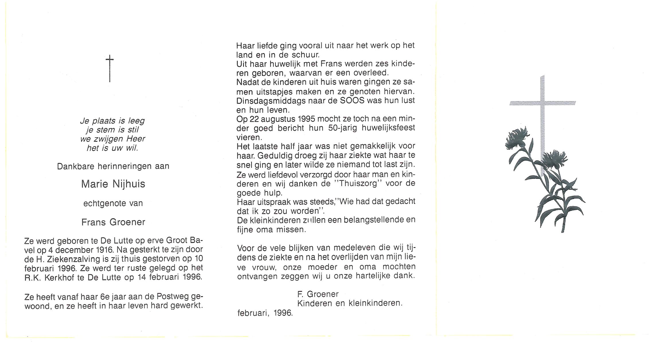 NIJHUIS, Marie, geboren op 4-12-1916 te De Lutte, overleden op 10-2-1996 te De Lutte op 79-jarige leeftijd, begraven op 14-2-1996 te De Lutte.
