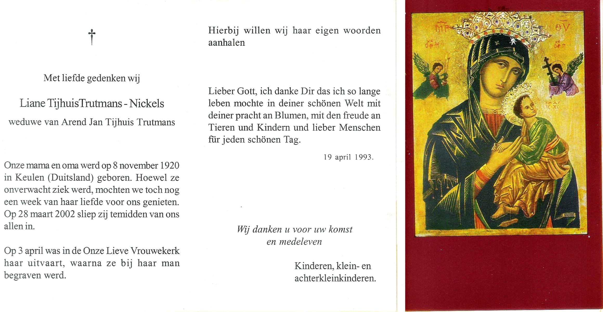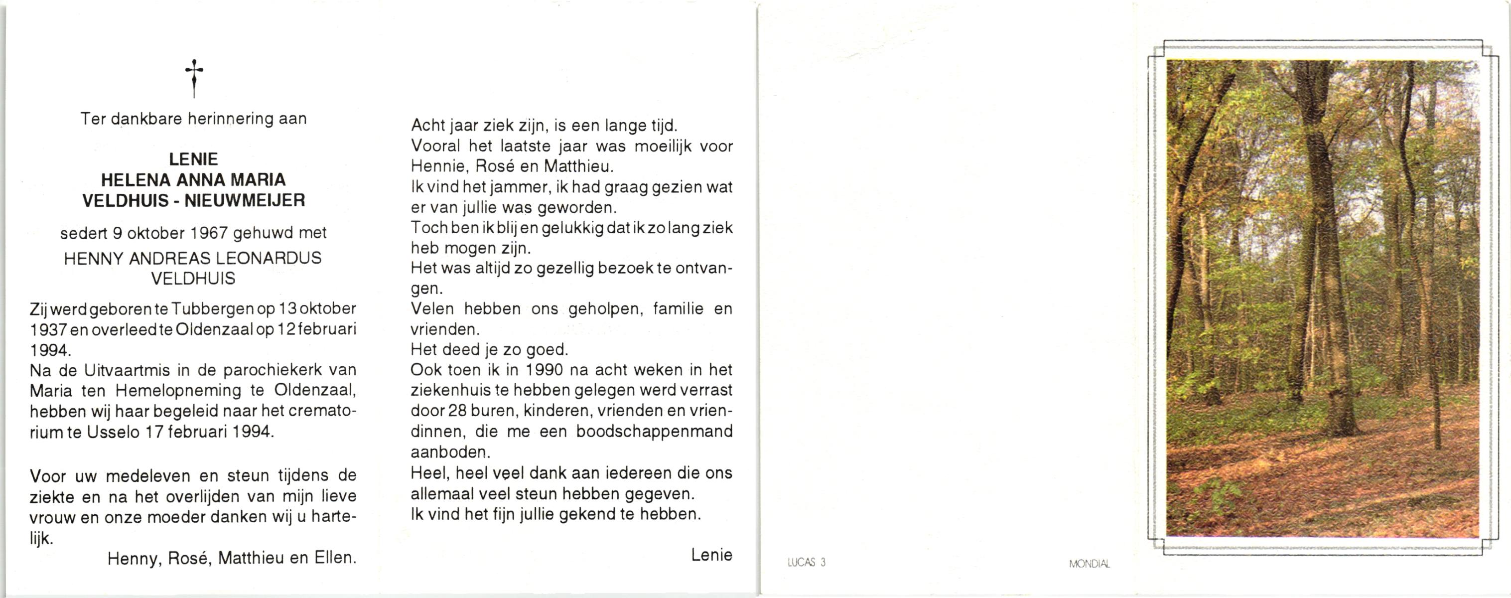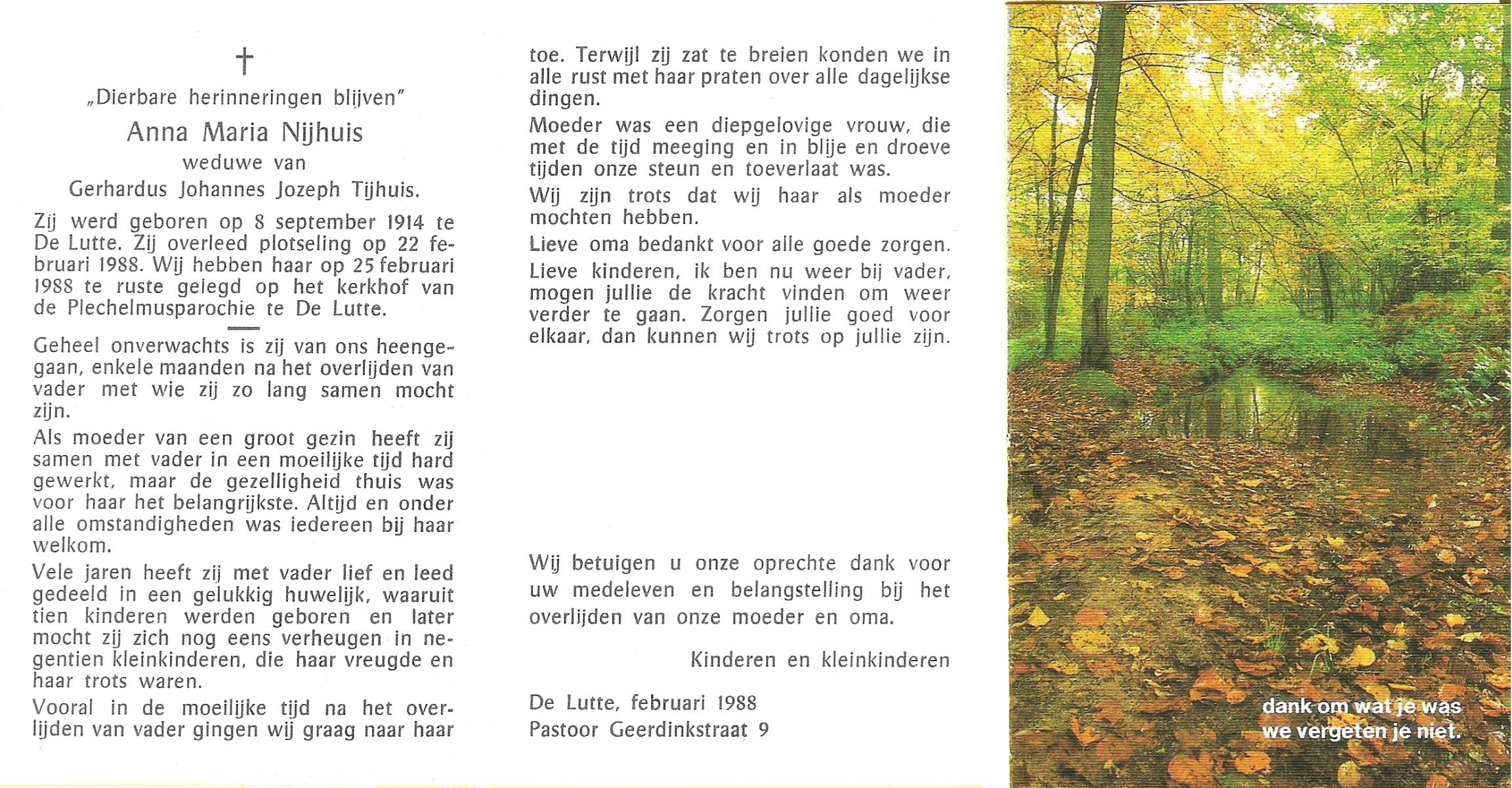 NIJHUIS, Marie, geboren op 4-12-1916 te De Lutte, overleden op 10-2-1996 te De Lutte op 79-jarige leeftijd, begraven op 14-2-1996 te De Lutte.