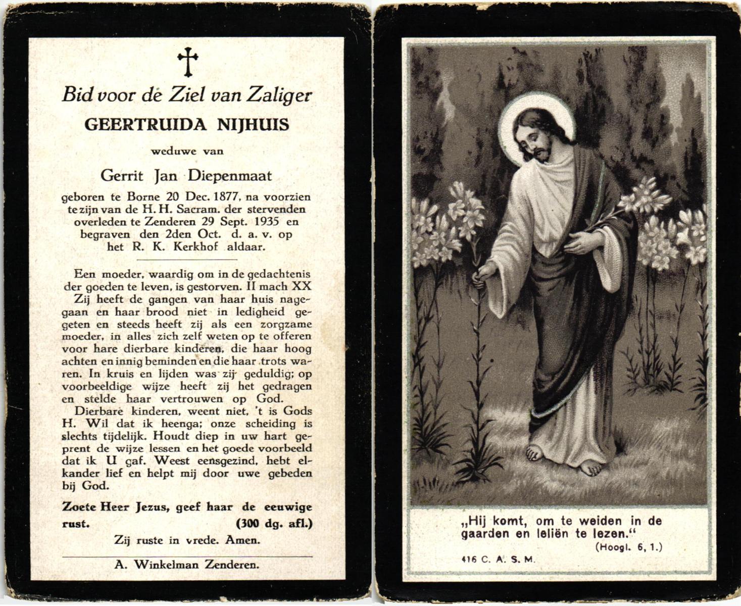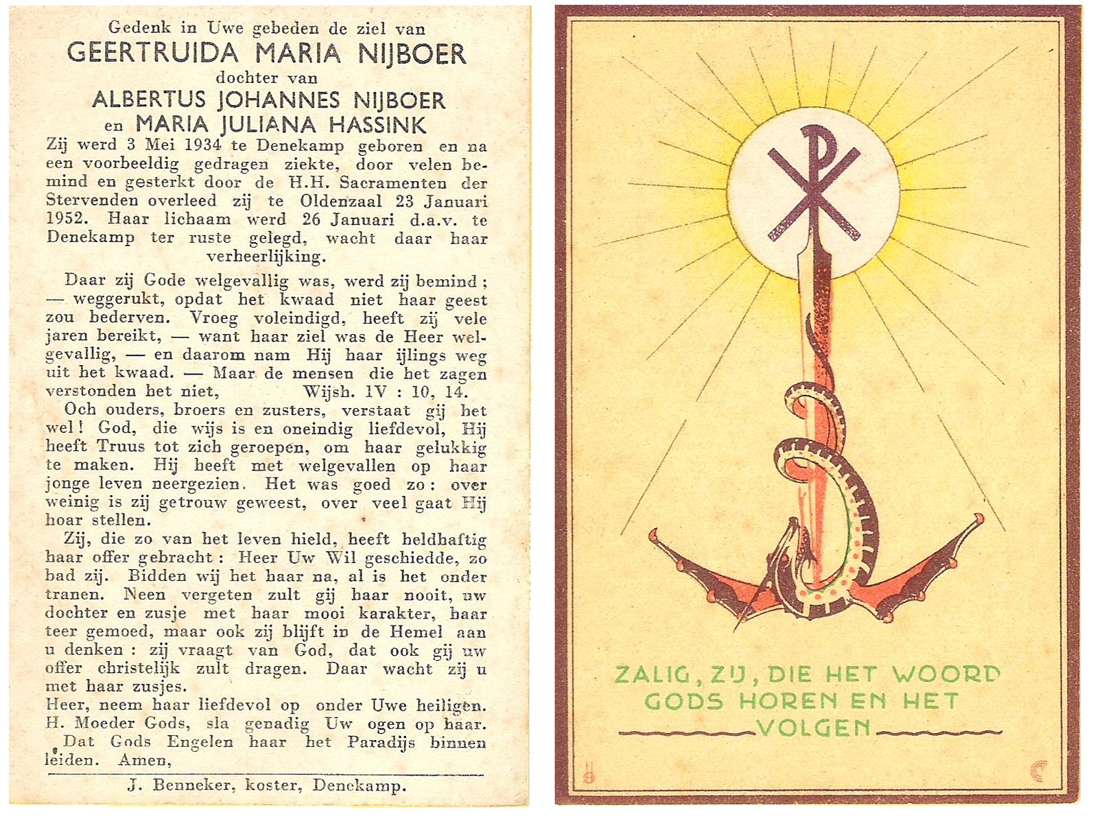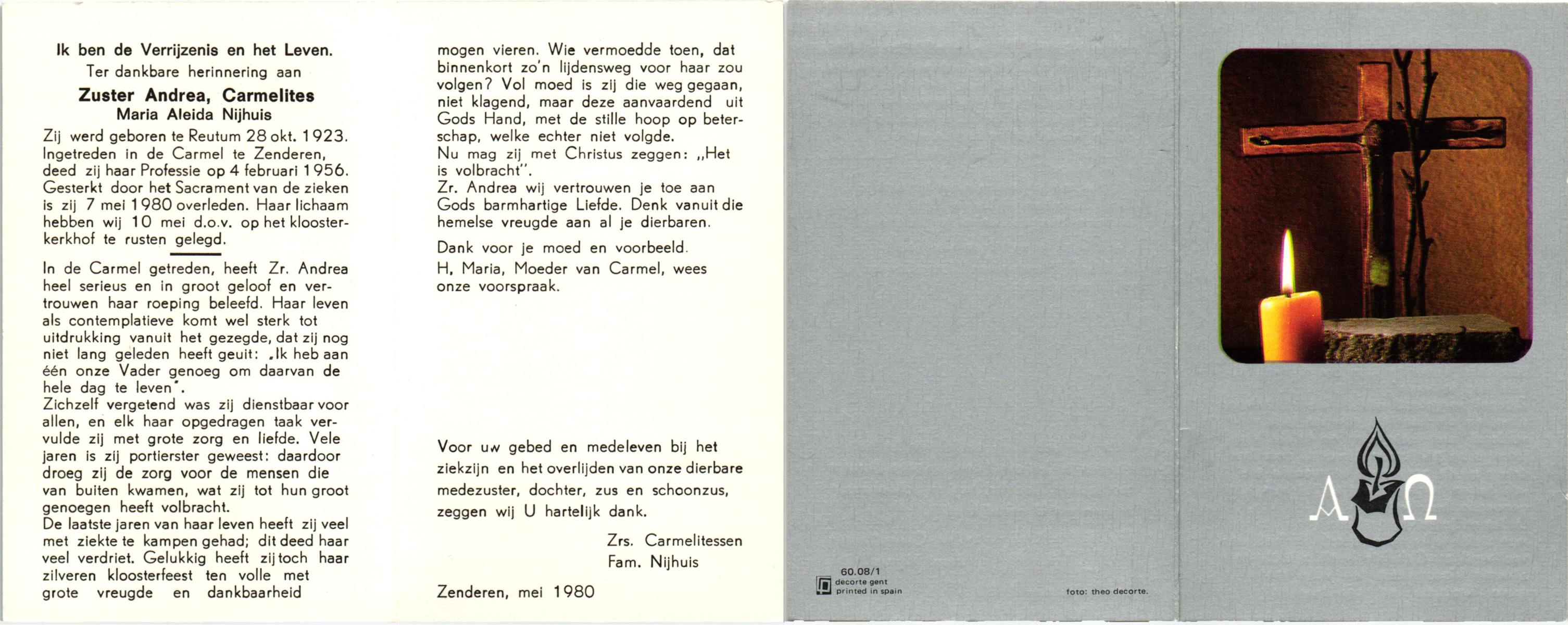 NIJHUIS, Maria Aleida (Zr. Andrea), geboren op 28-10-1923 te Reutum, overleden op 7-5-1980 te Zenderen op 56-jarige leeftijd, begraven op 10-5-1980 te Zenderen.