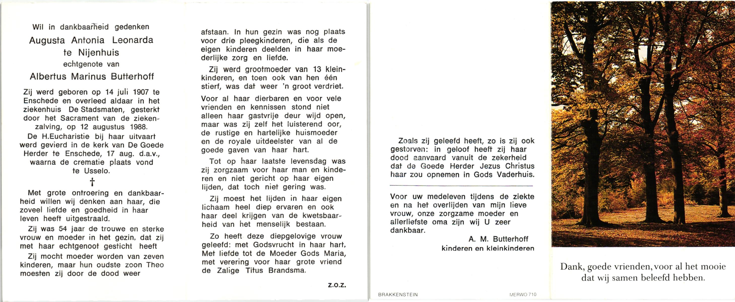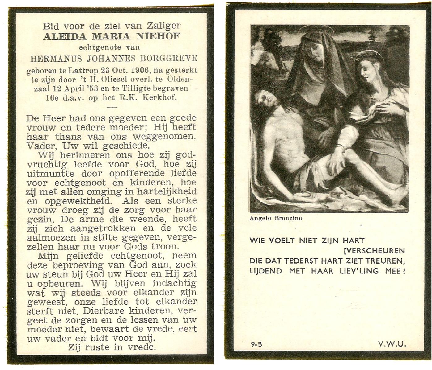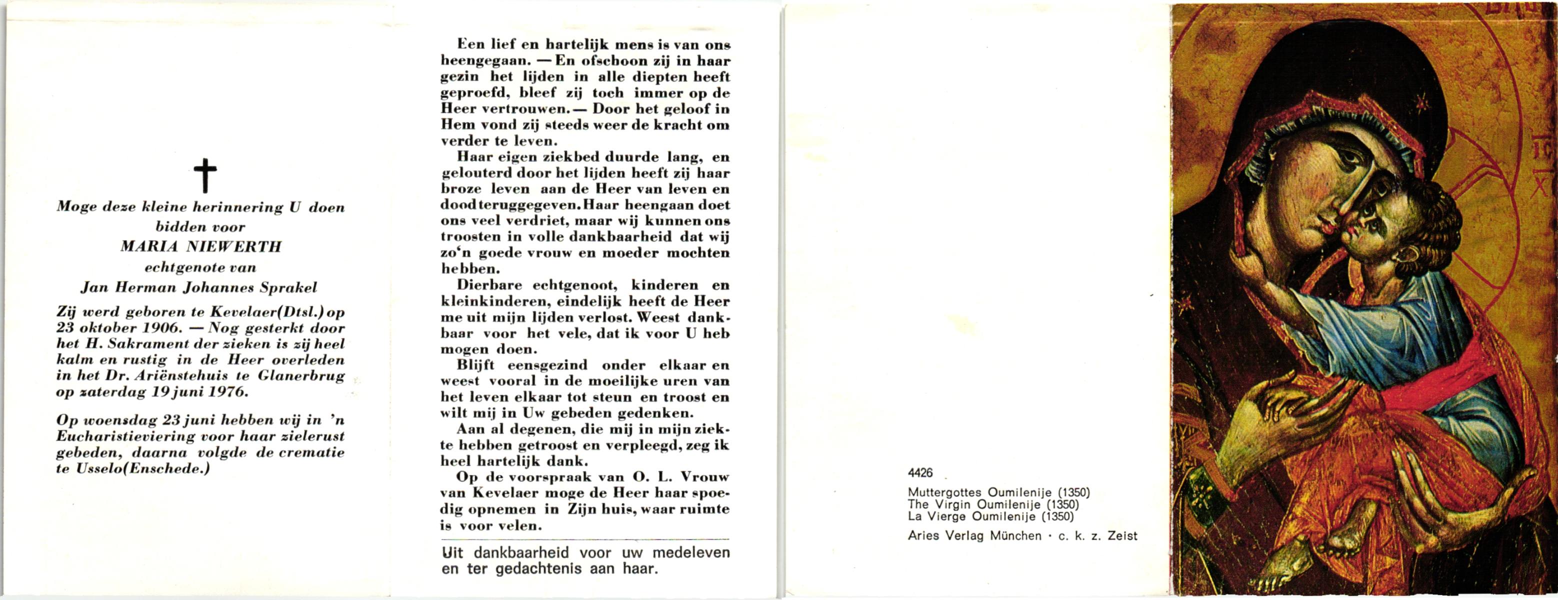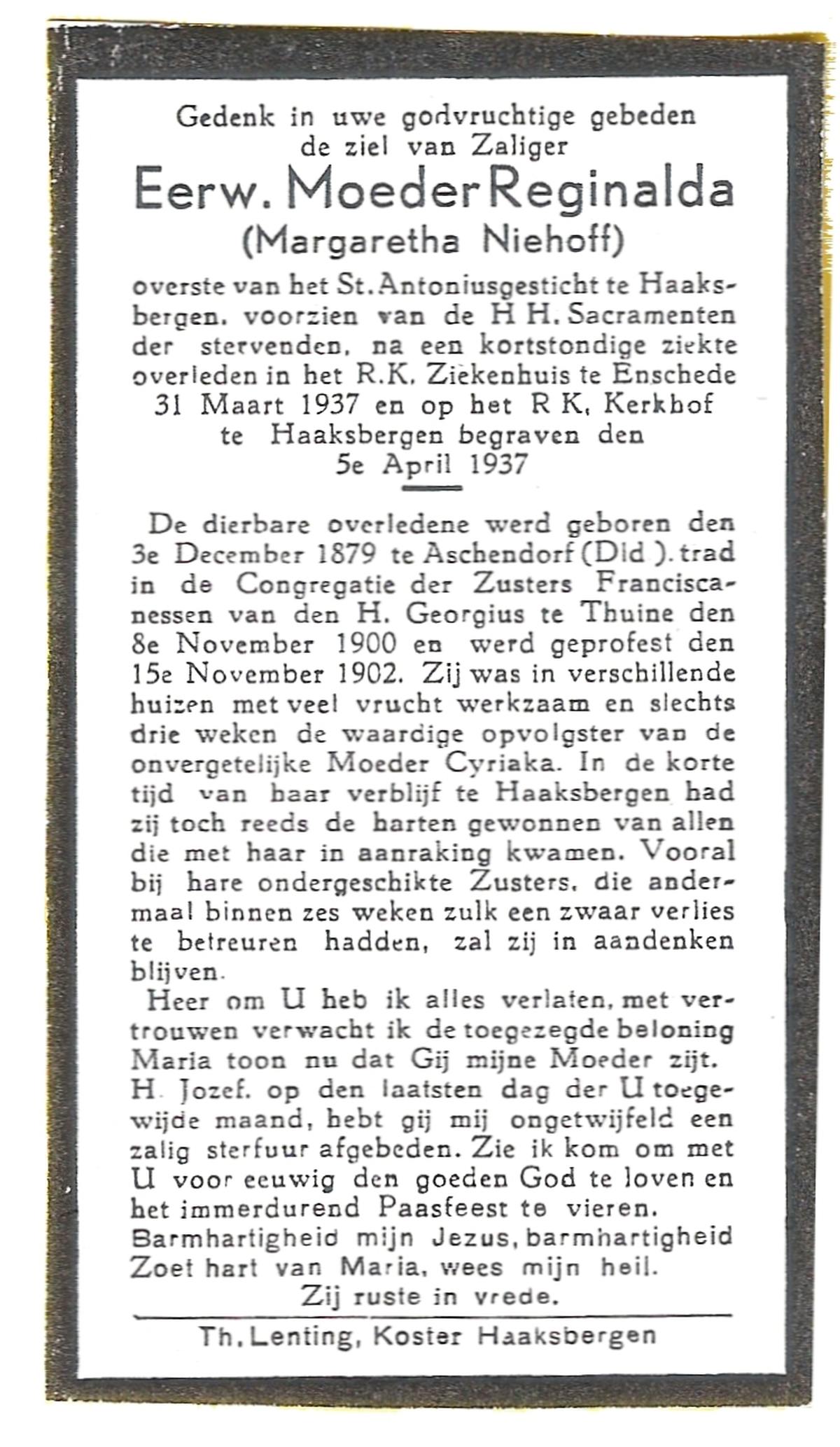 NIJHUIS, Maria Aleida (Zr. Andrea), geboren op 28-10-1923 te Reutum, overleden op 7-5-1980 te Zenderen op 56-jarige leeftijd, begraven op 10-5-1980 te Zenderen.