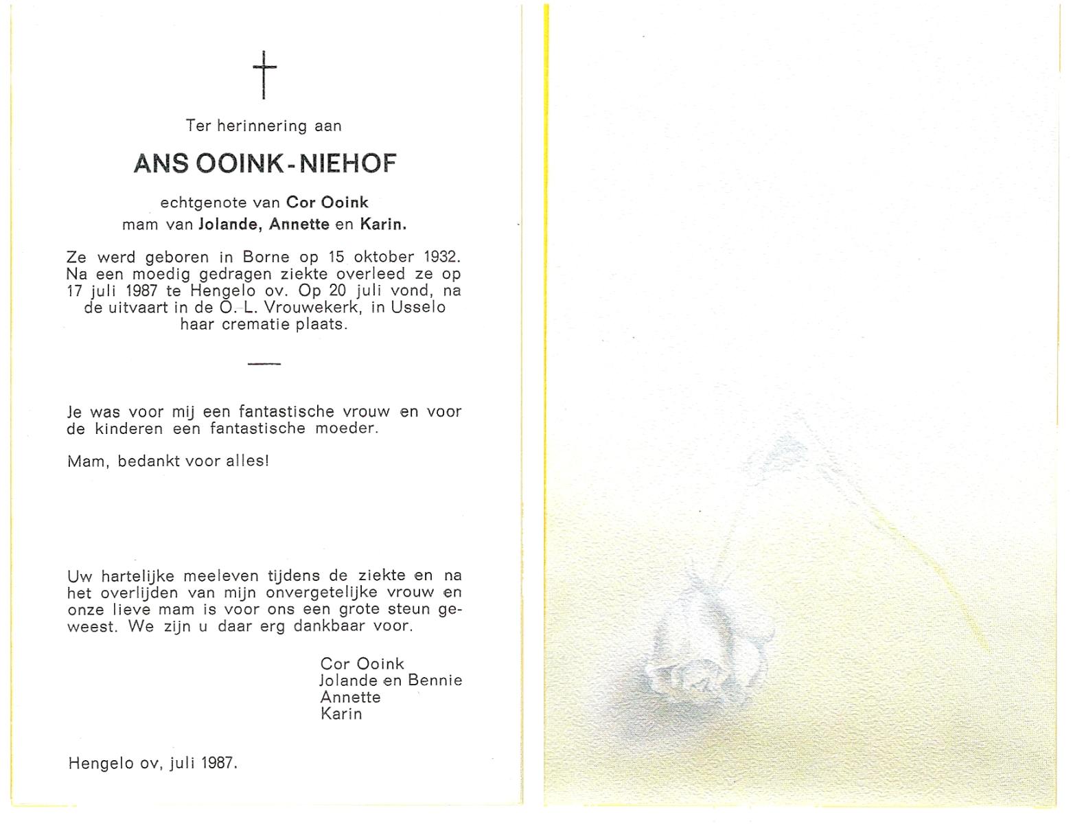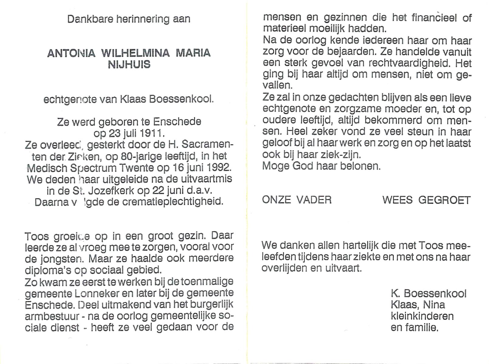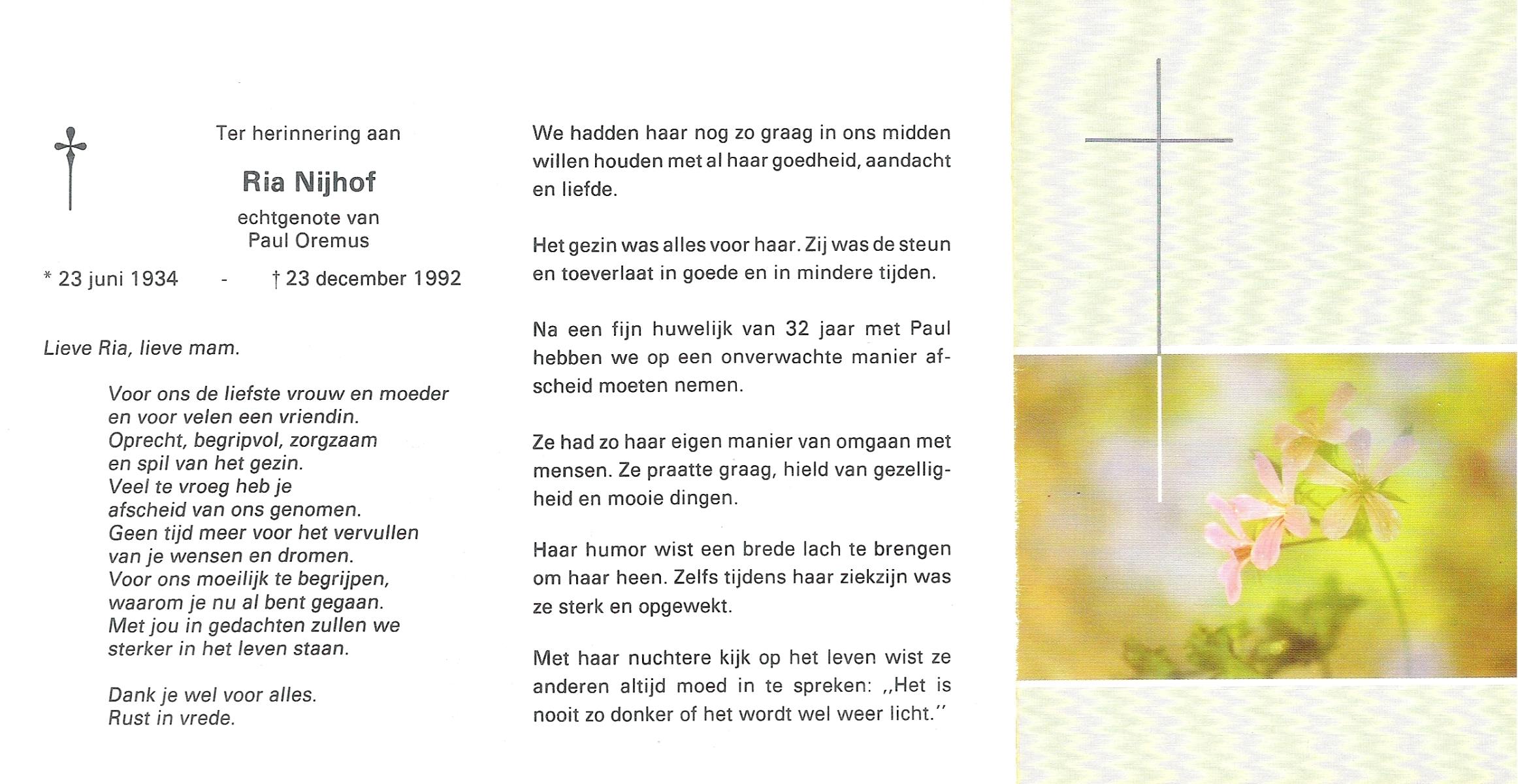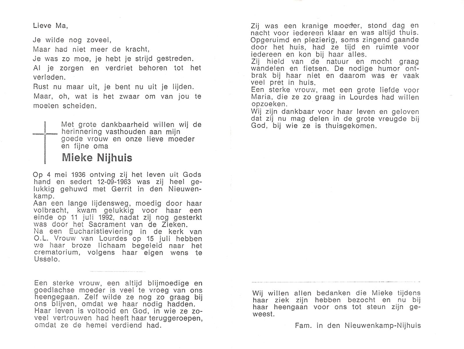 NIJHUIS, Mieke, geboren op 4-5-1936, overleden op 11-7-1992 op 56-jarige leeftijd, gecremeerd op 15-7-1992 te Usselo.