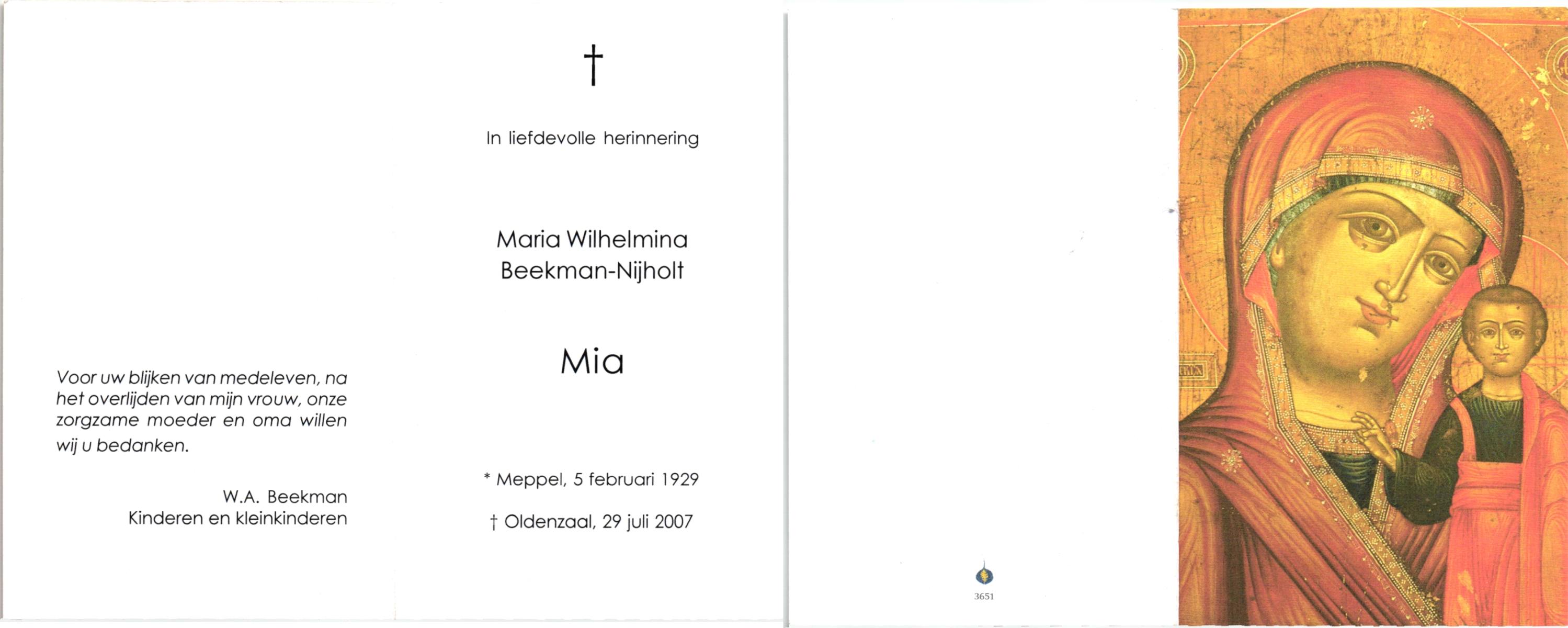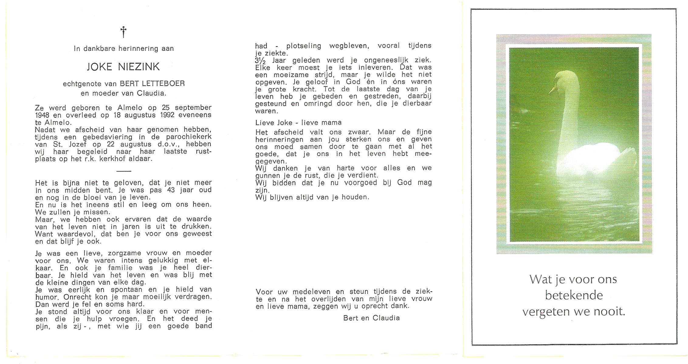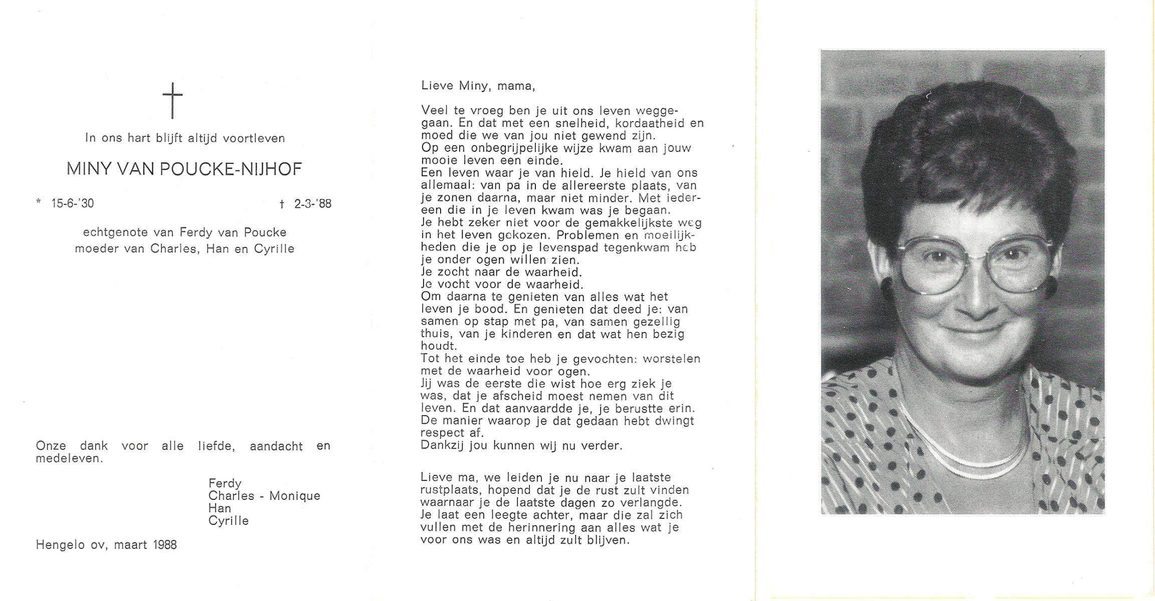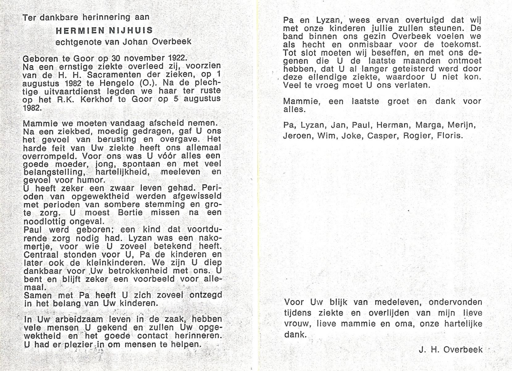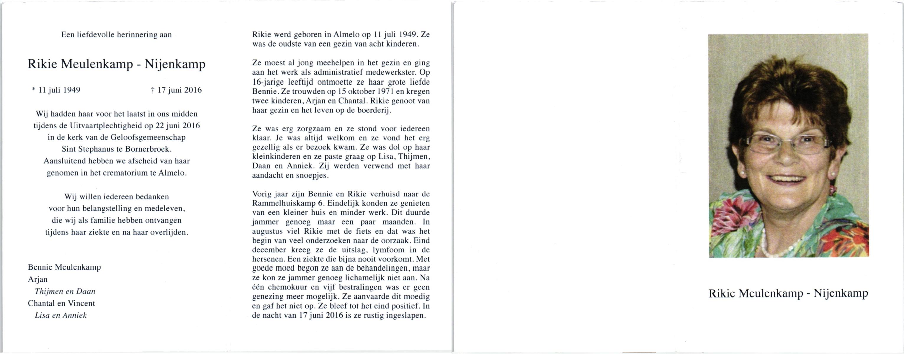 NIJHUIS, Mieke, geboren op 4-5-1936, overleden op 11-7-1992 op 56-jarige leeftijd, gecremeerd op 15-7-1992 te Usselo.