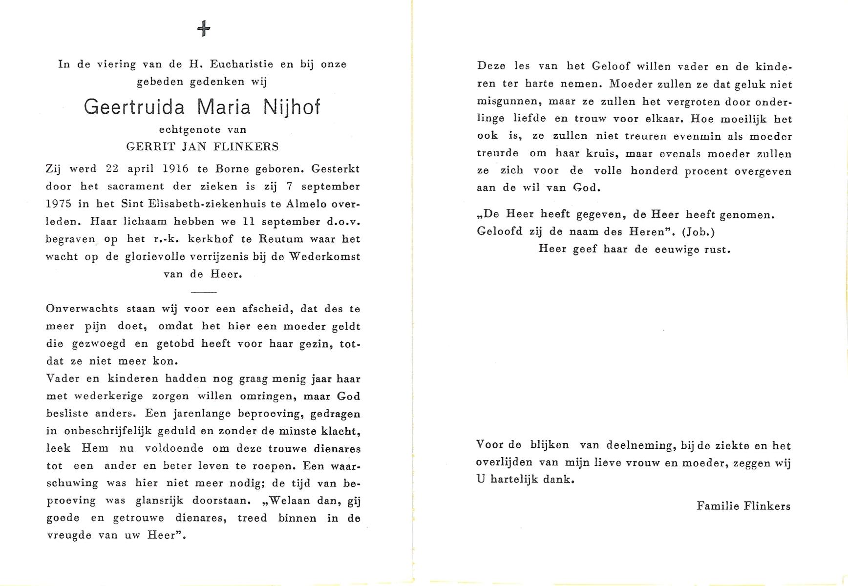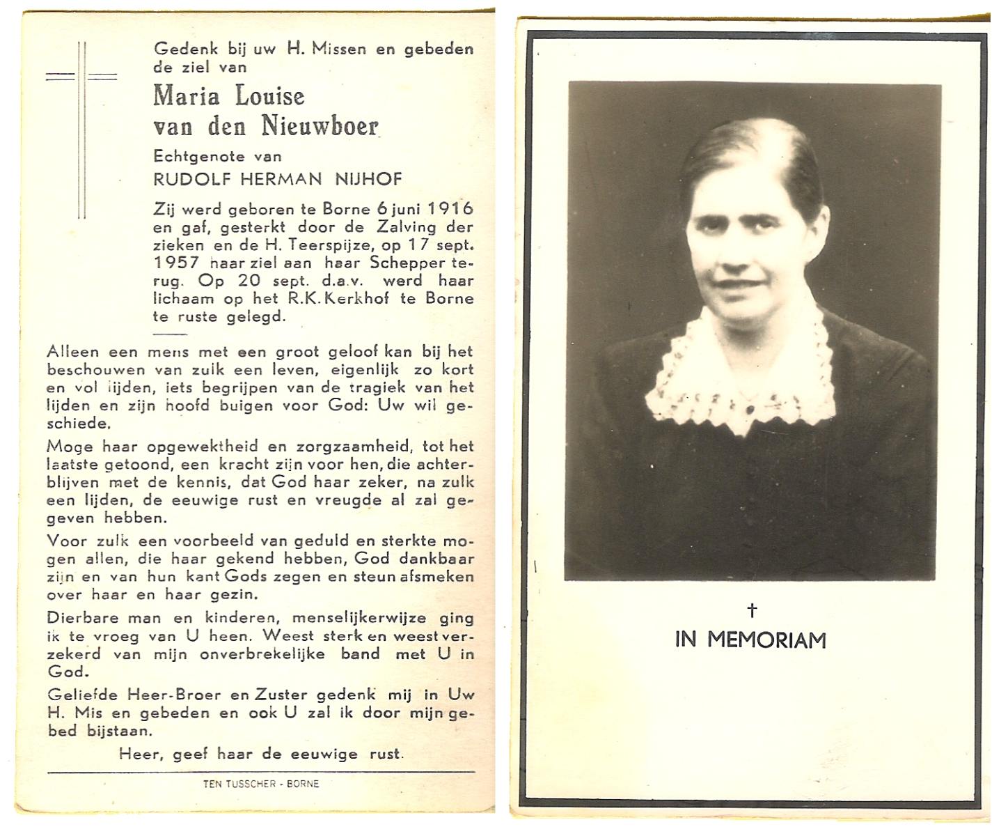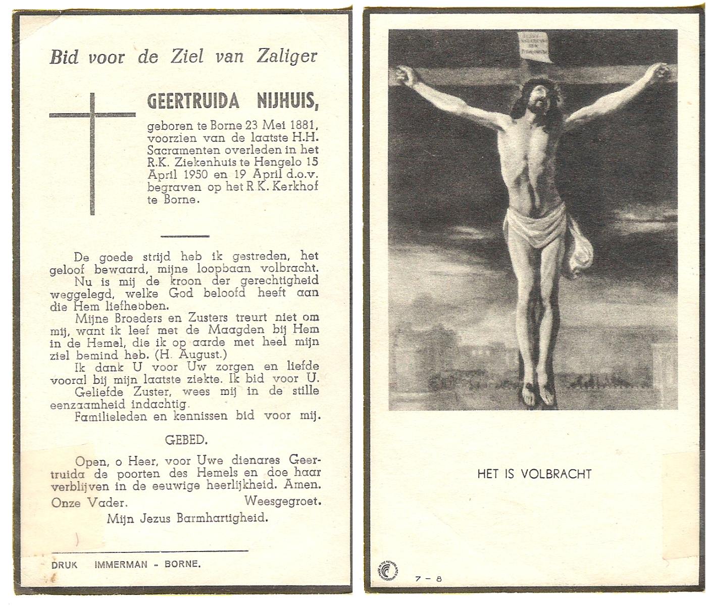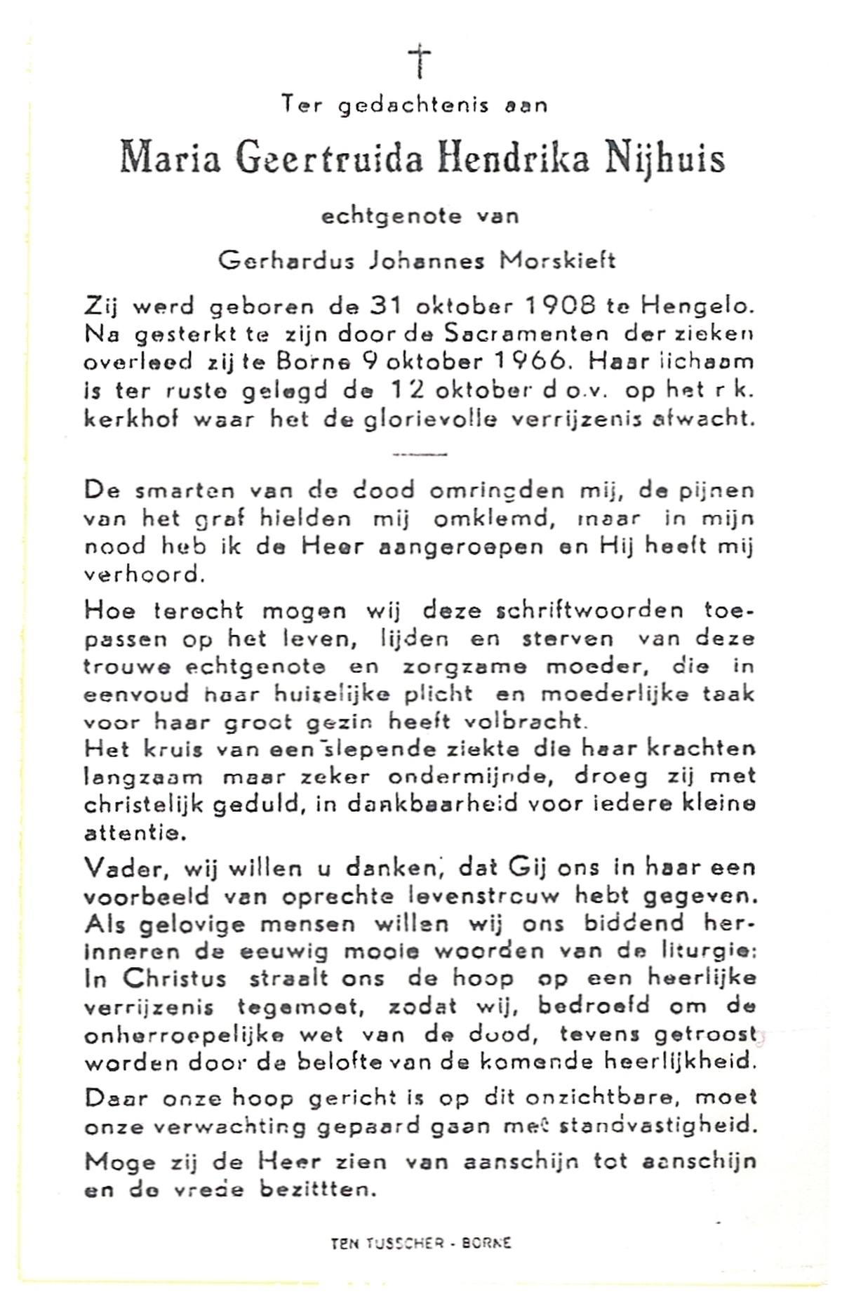 NIJHUIS, Maria Geertruida Hendrika, geboren op 31-10-1908 te Hengelo (O), overleden op 9-10-1966 te Borne op 57-jarige leeftijd, begraven op 12-10-1966 te Borne.