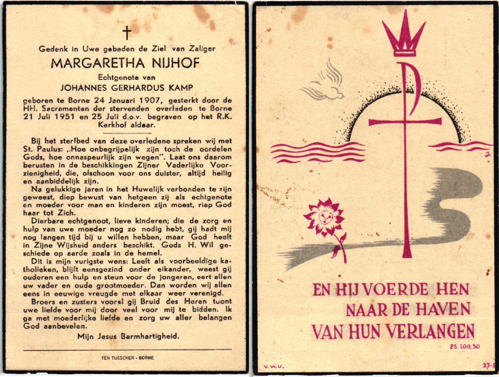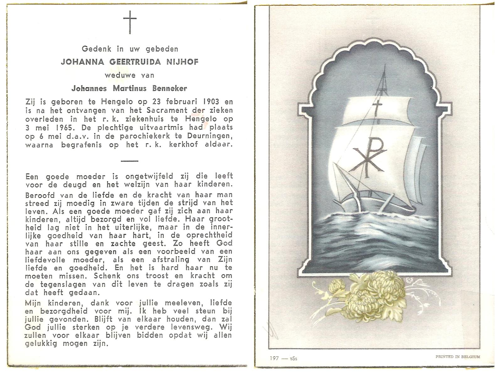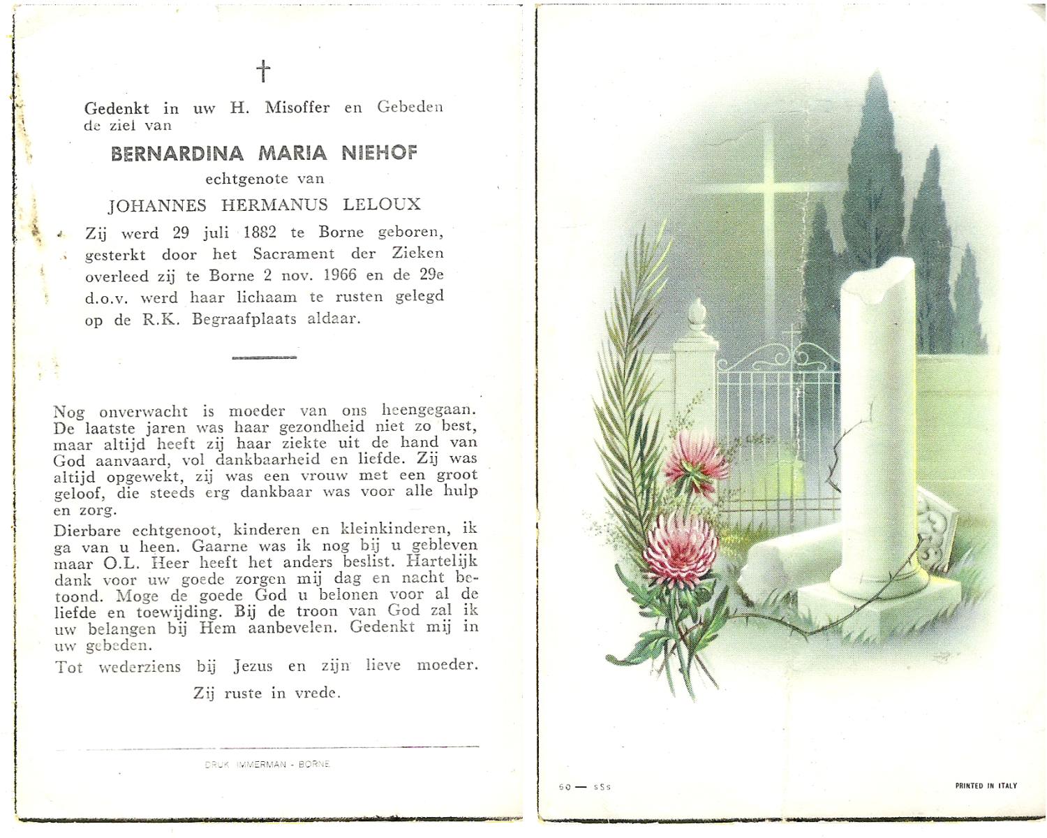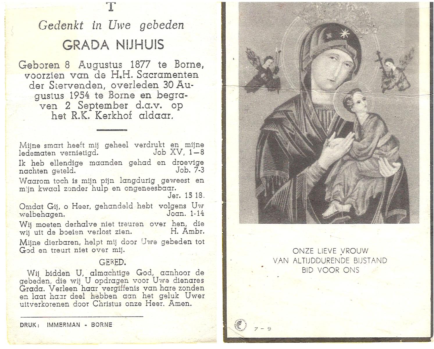 NIJHUIS, Maria Geertruida Hendrika, geboren op 31-10-1908 te Hengelo (O), overleden op 9-10-1966 te Borne op 57-jarige leeftijd, begraven op 12-10-1966 te Borne.