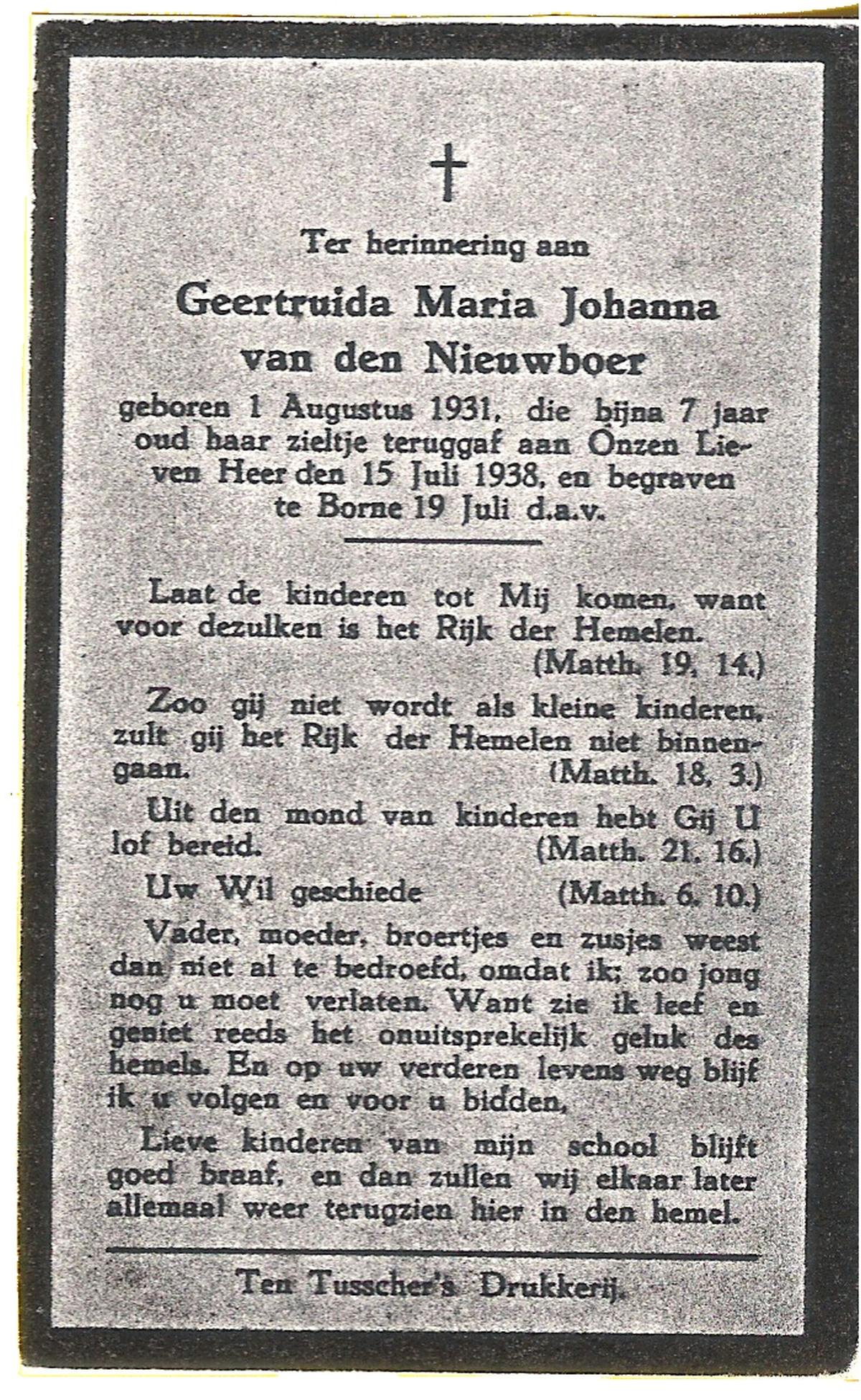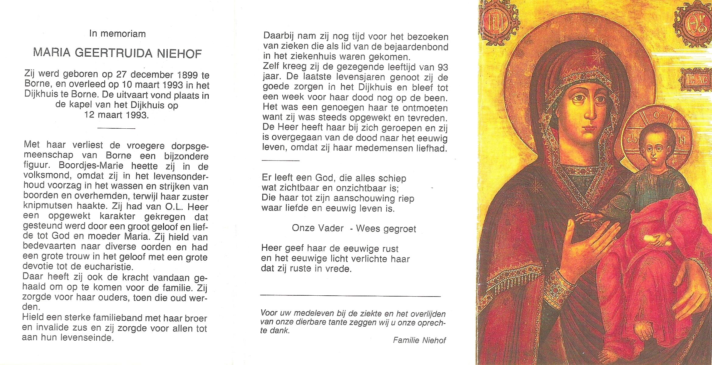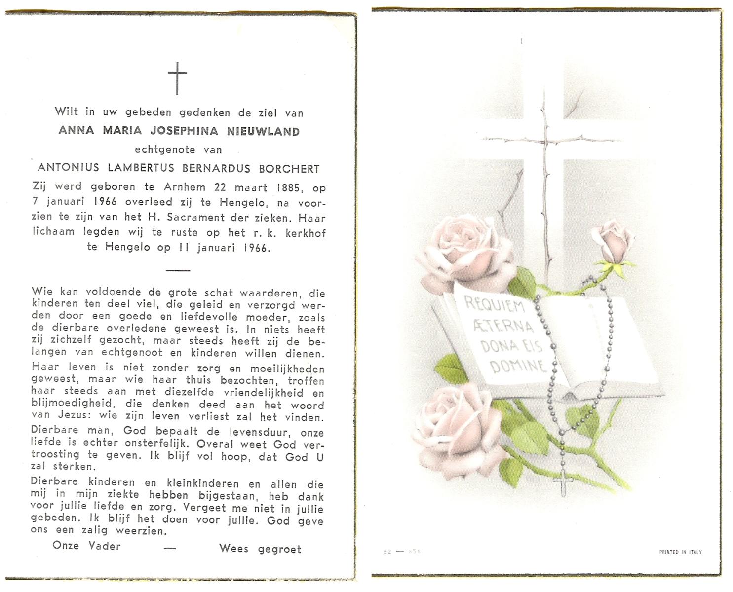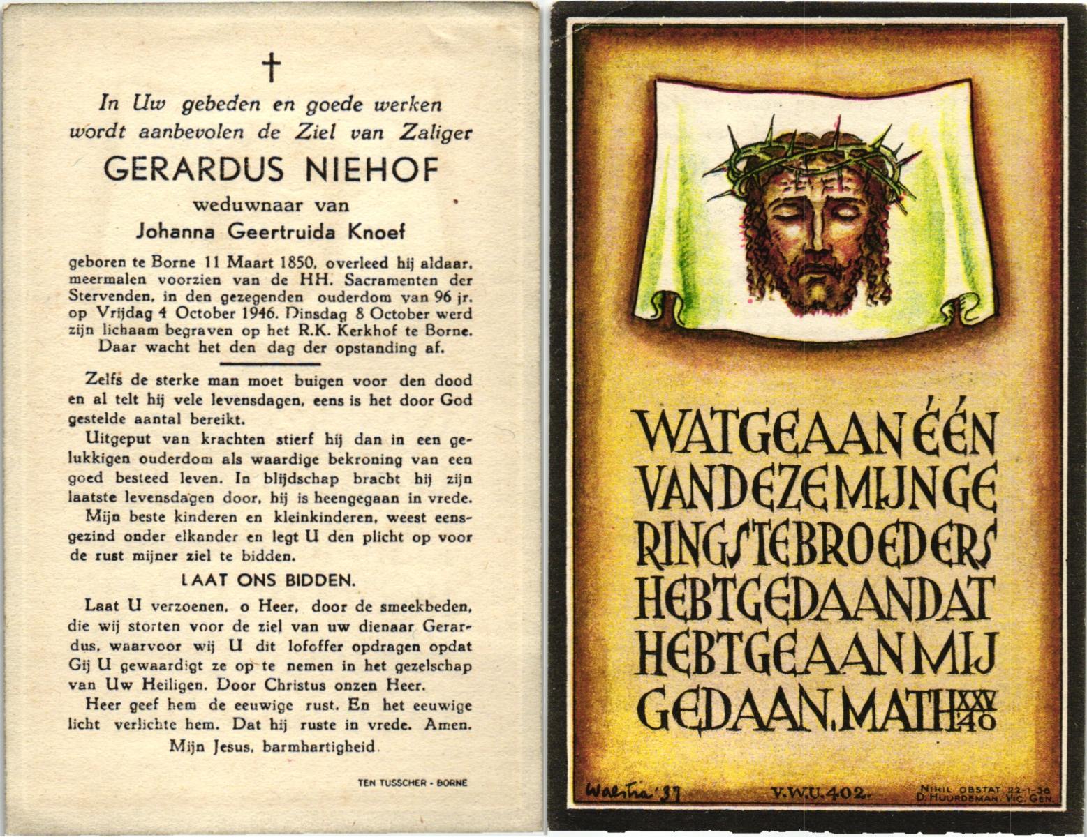 NIJHUIS, Maria Geertruida Hendrika, geboren op 31-10-1908 te Hengelo (O), overleden op 9-10-1966 te Borne op 57-jarige leeftijd, begraven op 12-10-1966 te Borne.