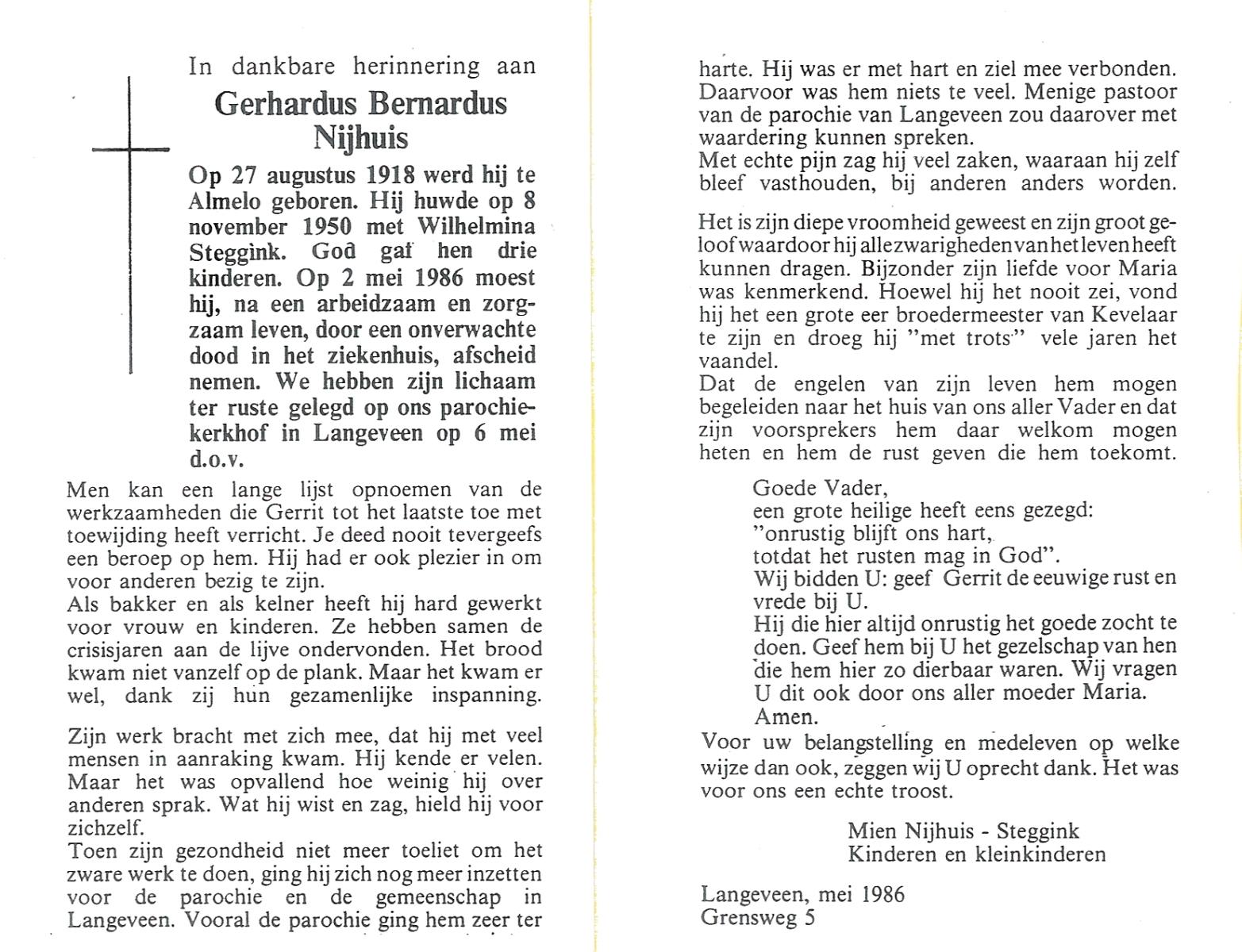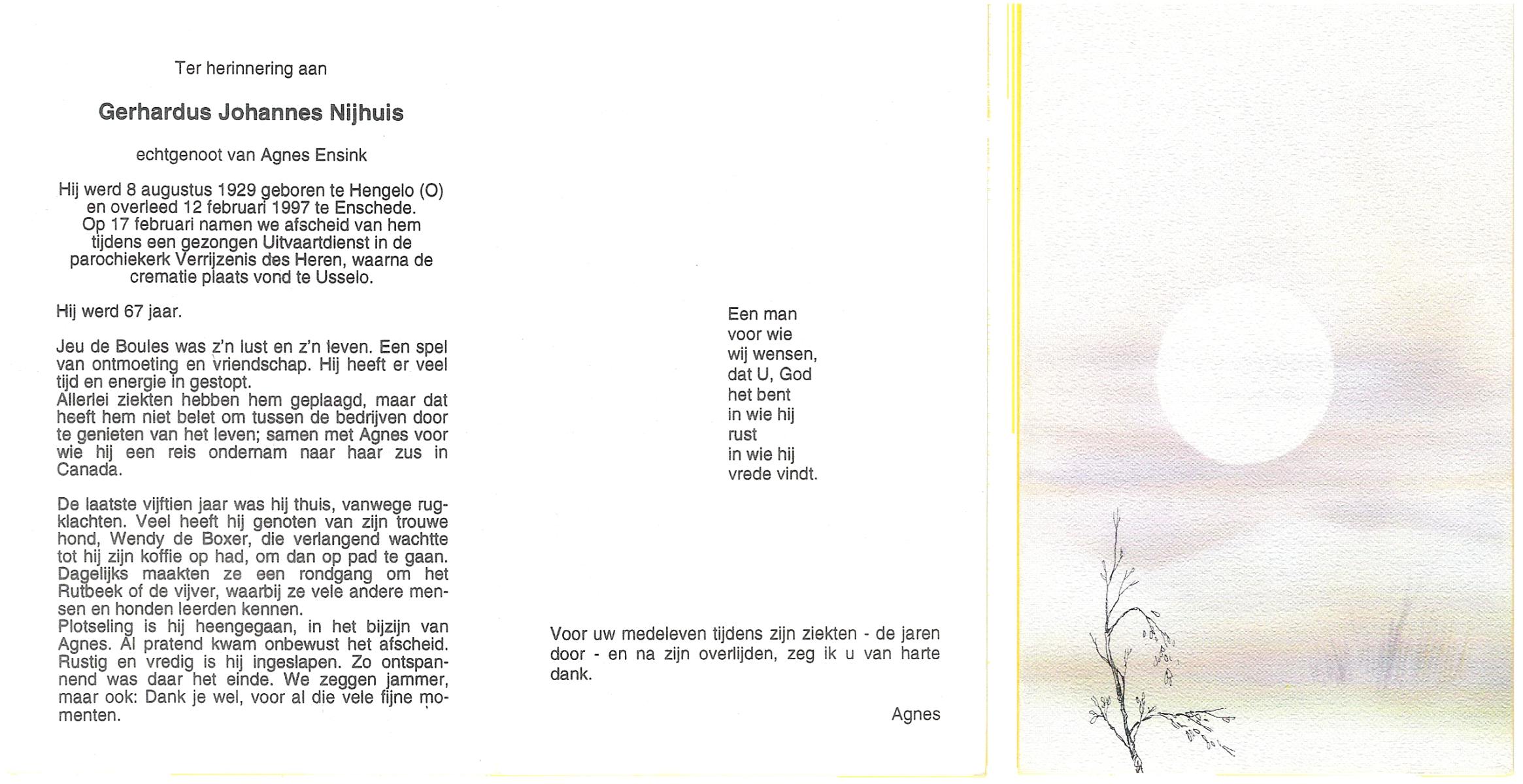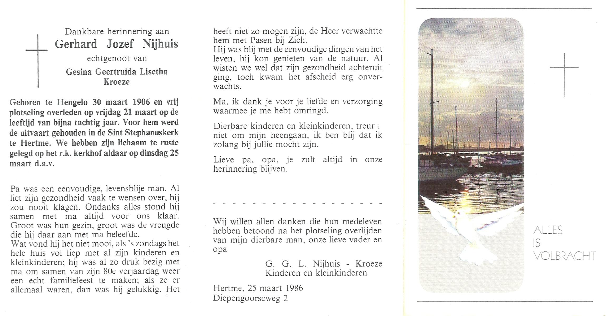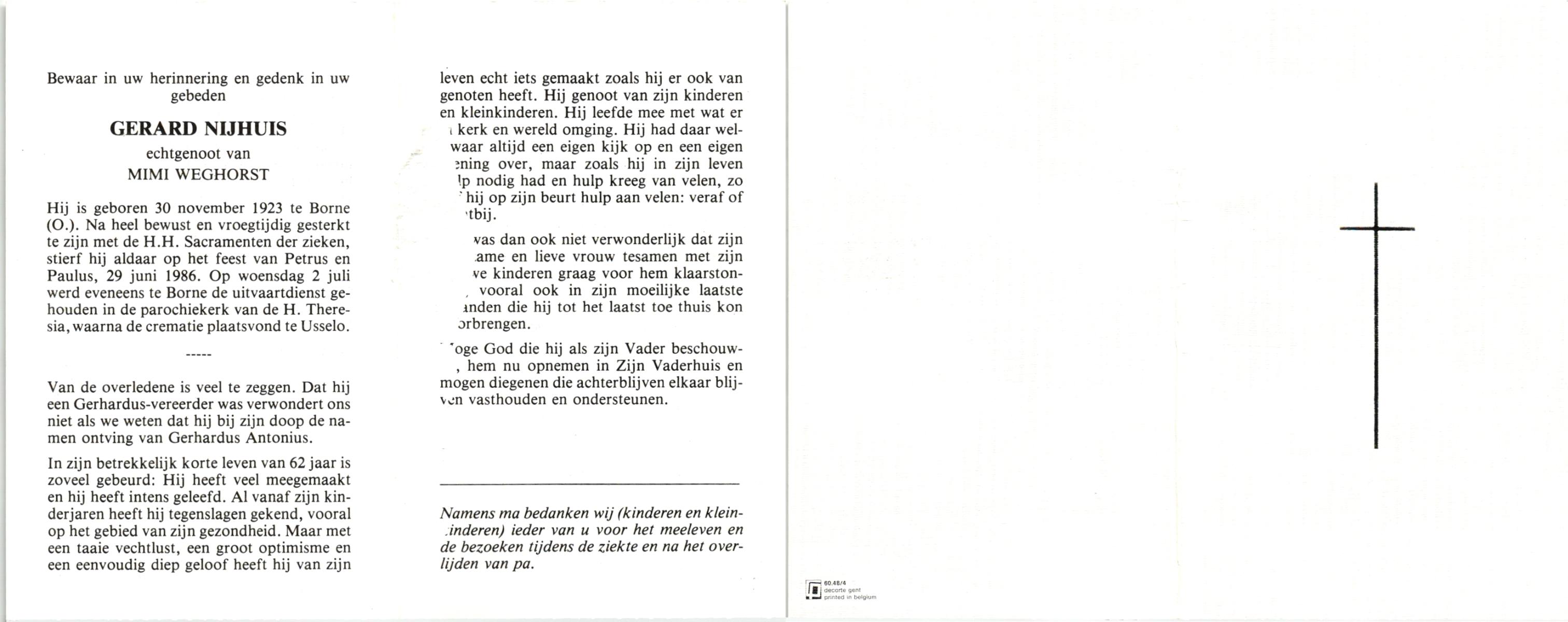 NIJHUIS, , Gerard, geboren op 30-11-1923 te Borne, overleden op 29-6-1986 te Borne op 62-jarige leeftijd, gecremeerd op 2-7-1986 te Usselo.