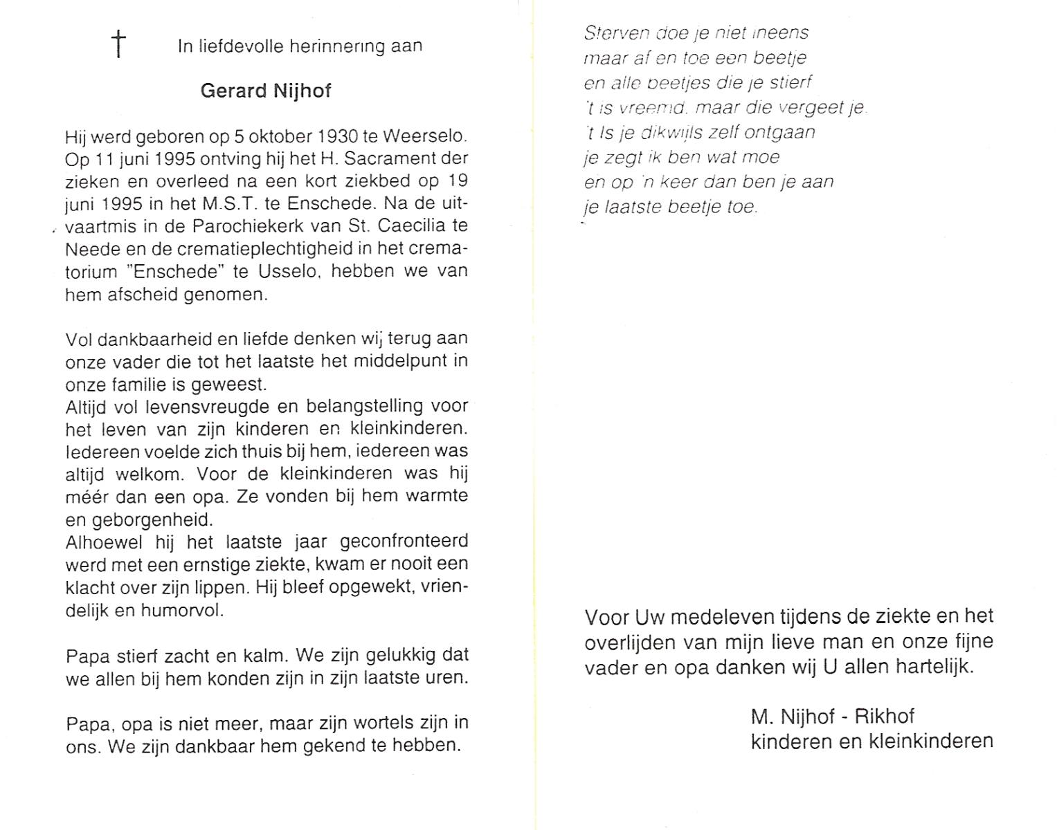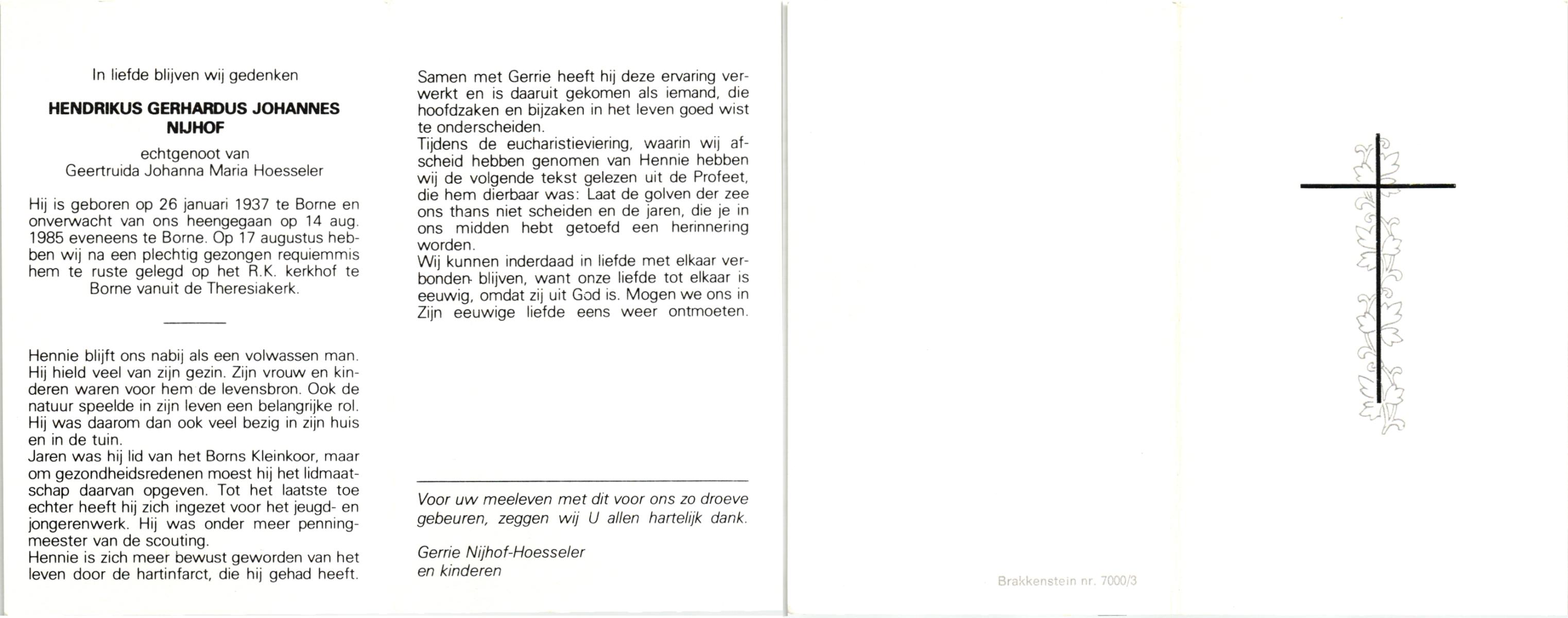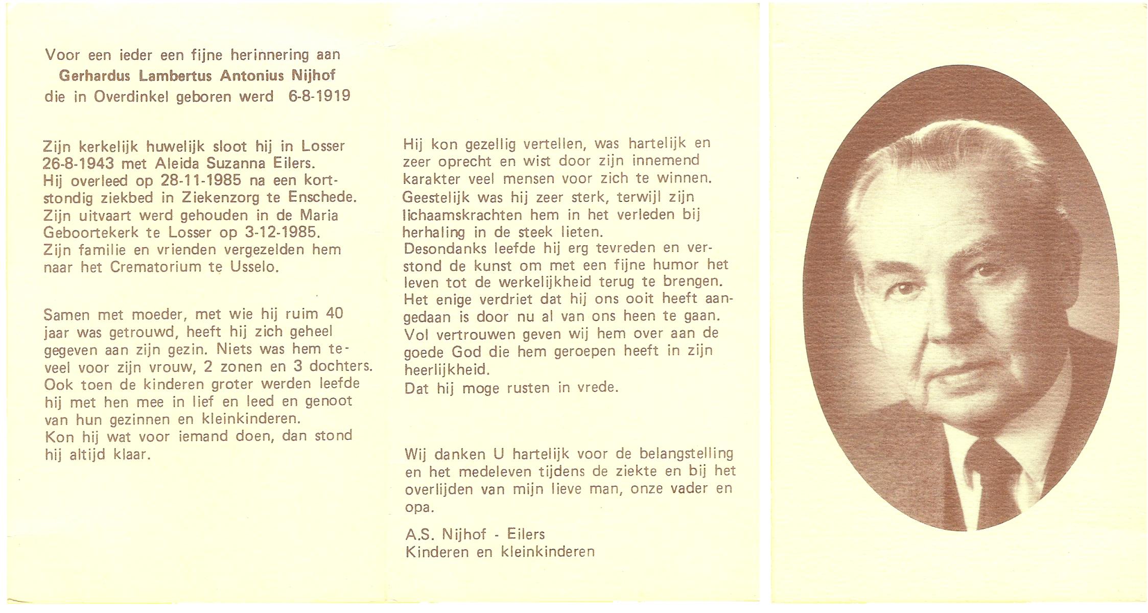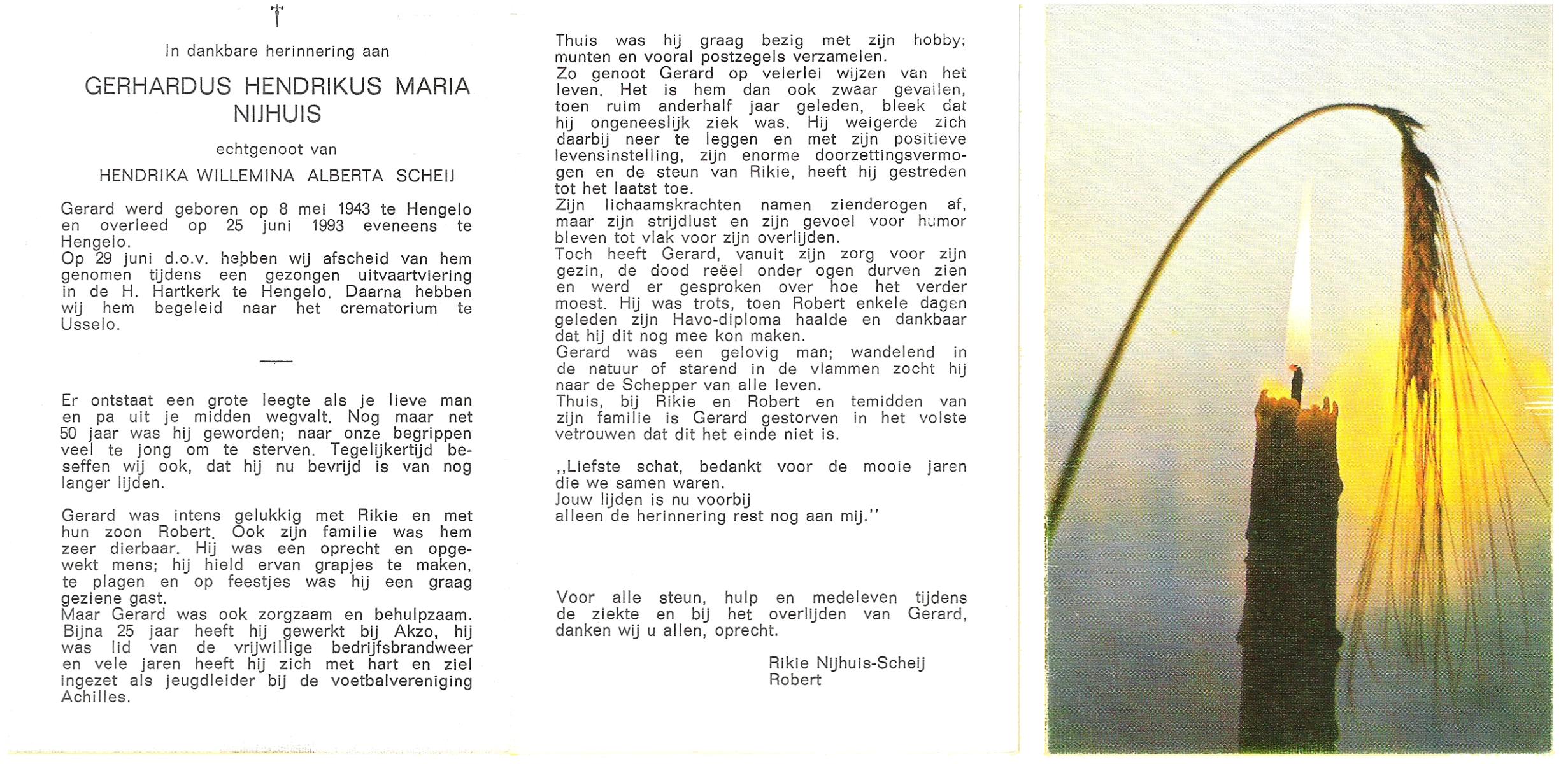 NIJHUIS, , Gerard, geboren op 30-11-1923 te Borne, overleden op 29-6-1986 te Borne op 62-jarige leeftijd, gecremeerd op 2-7-1986 te Usselo.