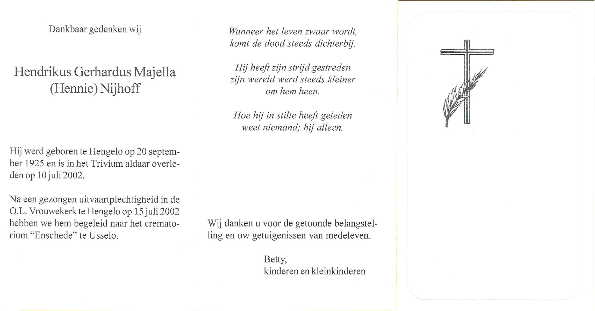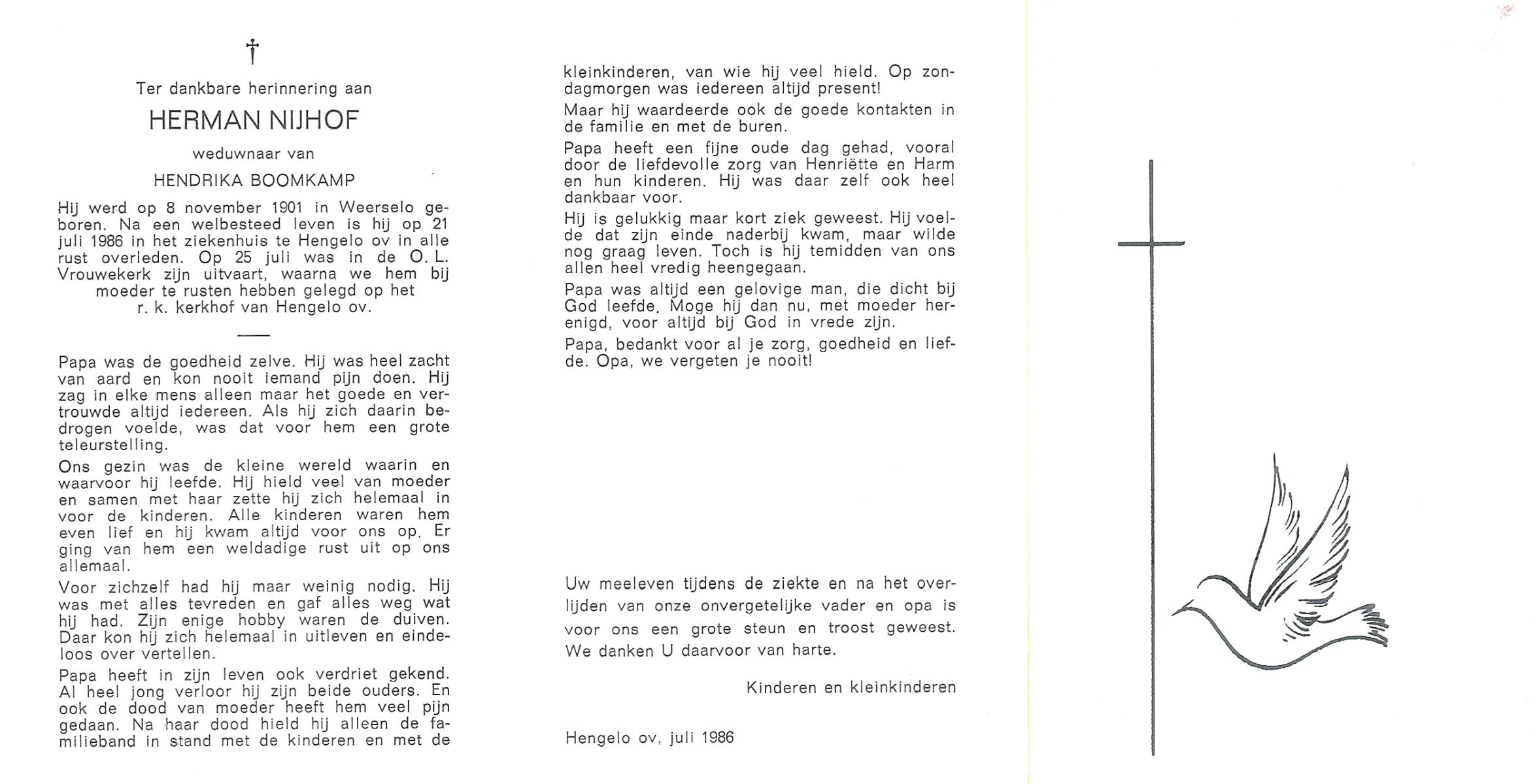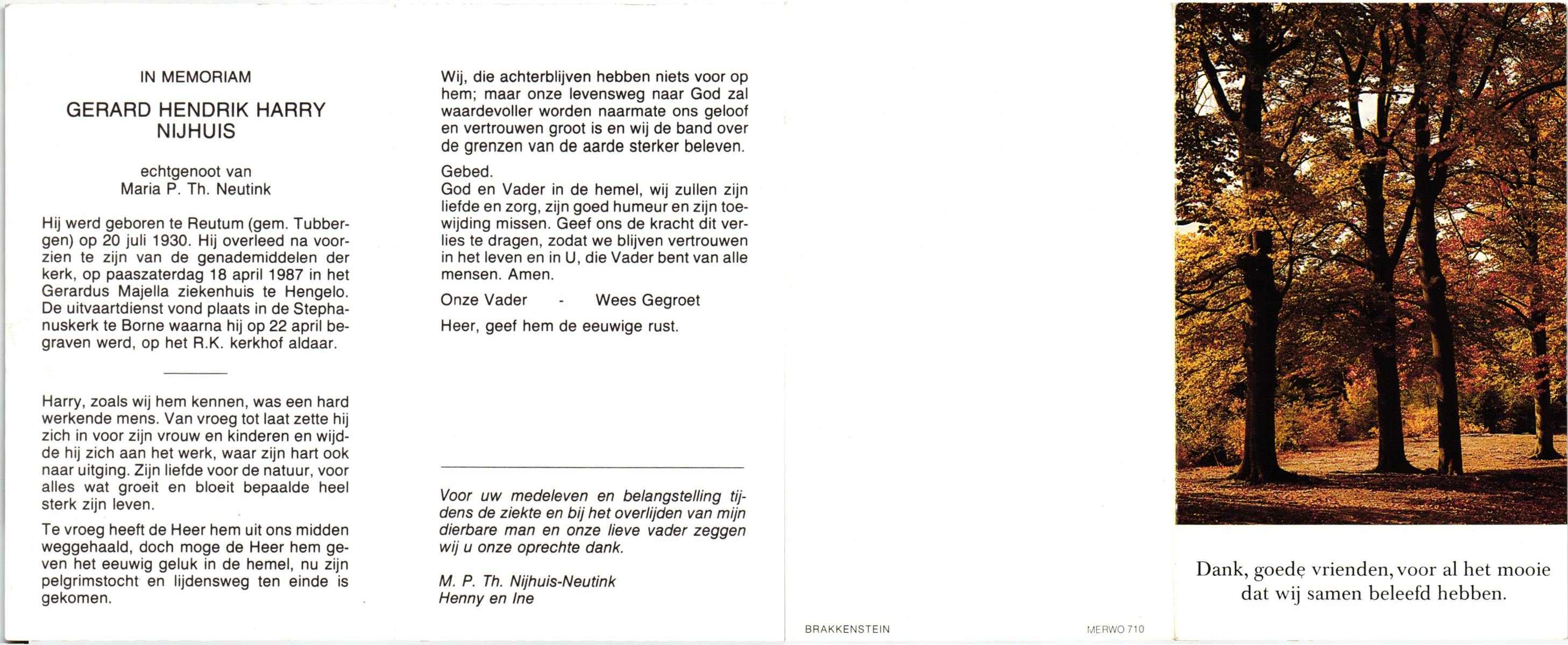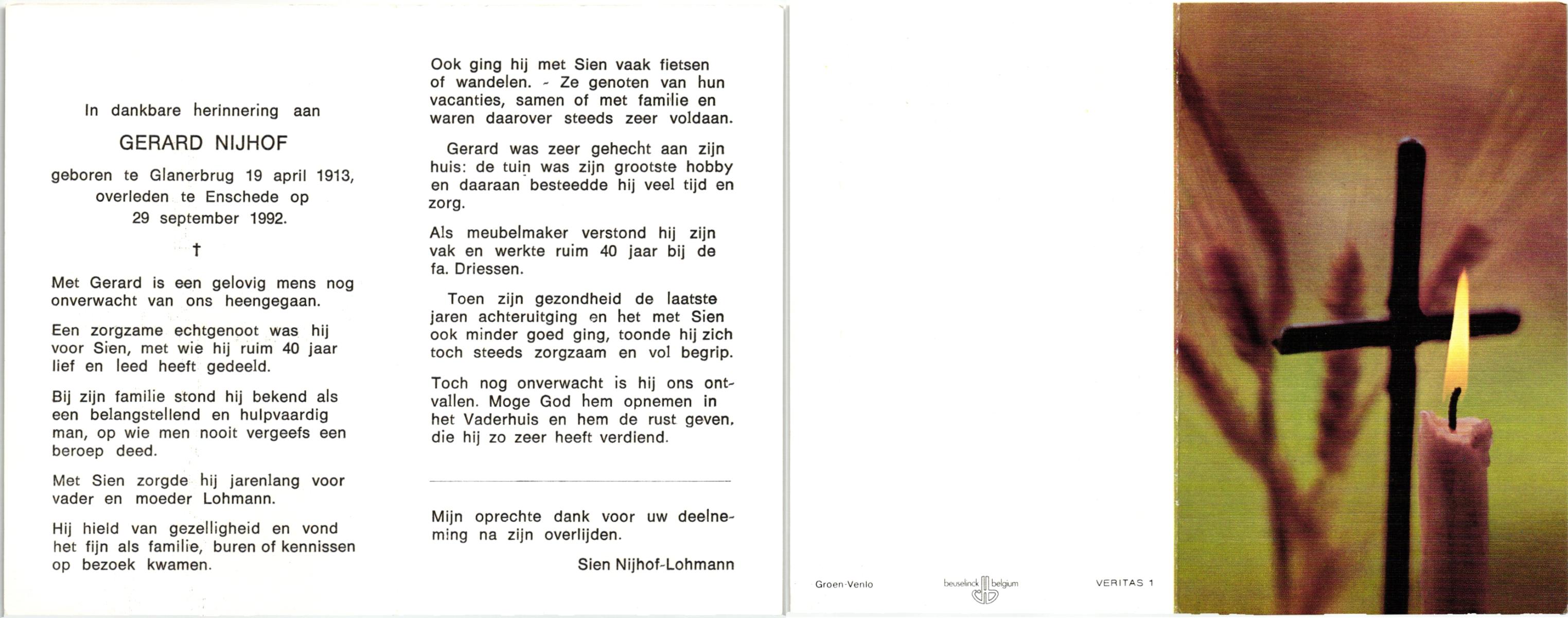 NIJHUIS, , Gerard, geboren op 30-11-1923 te Borne, overleden op 29-6-1986 te Borne op 62-jarige leeftijd, gecremeerd op 2-7-1986 te Usselo.