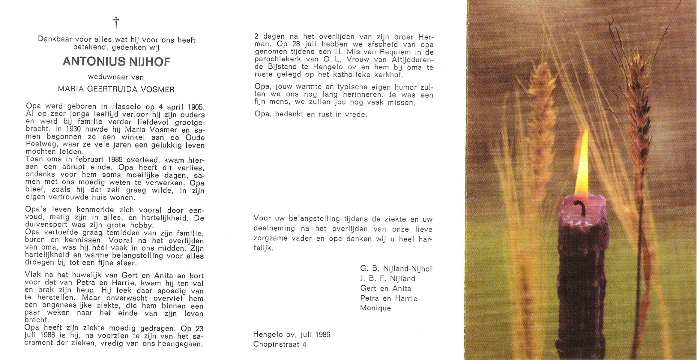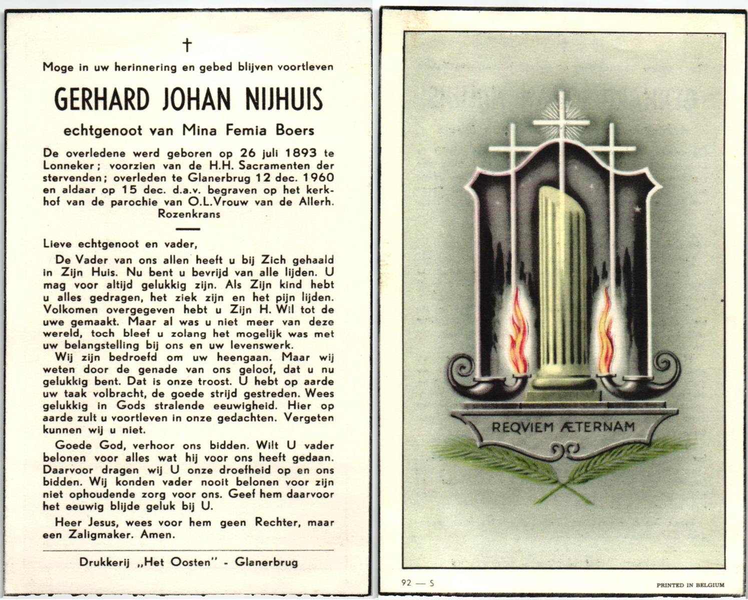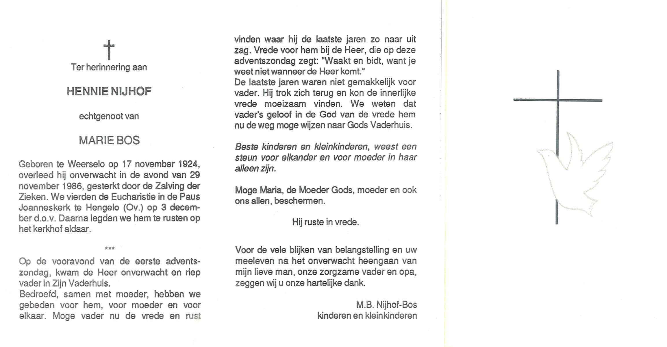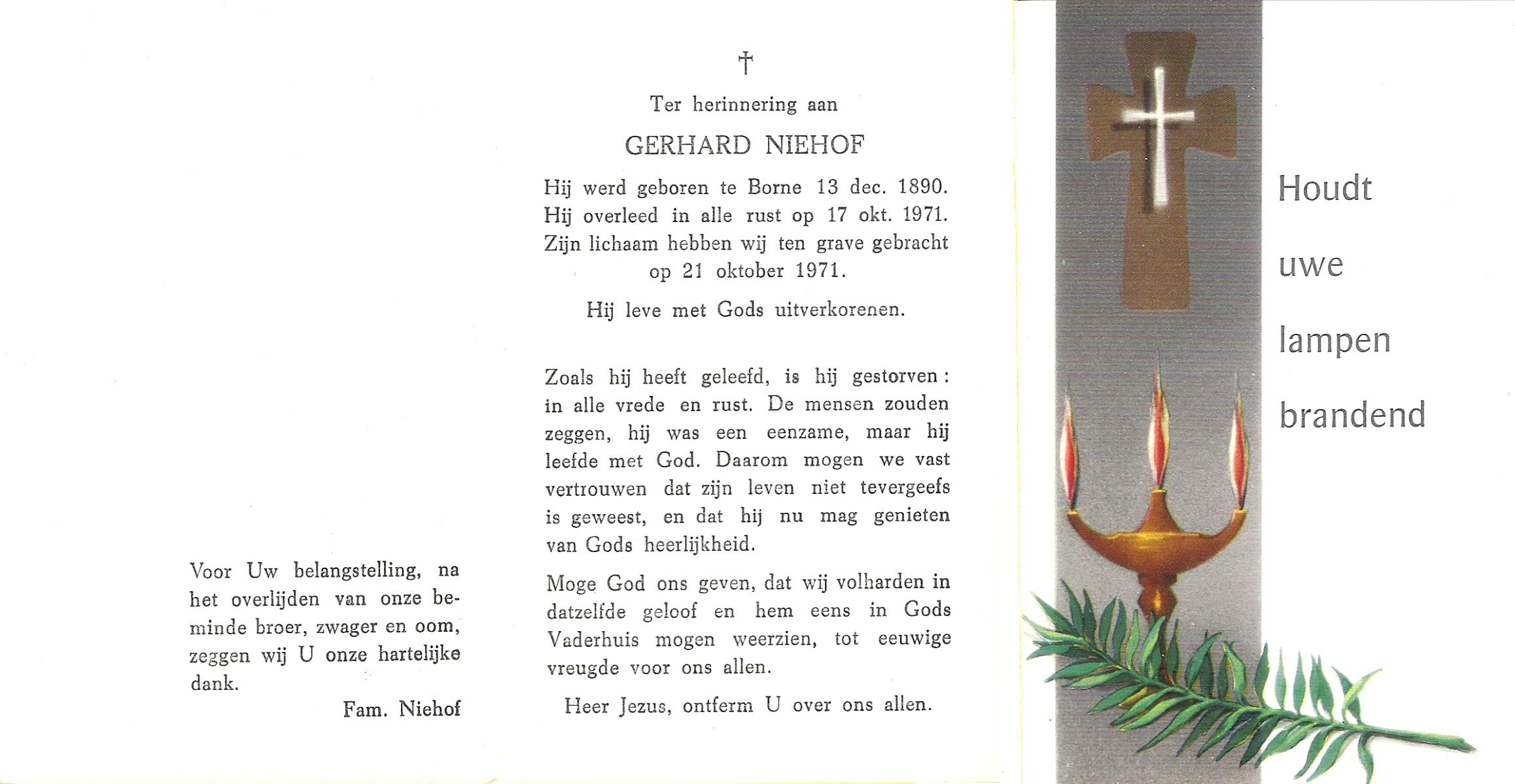 NIJHUIS, , Gerard, geboren op 30-11-1923 te Borne, overleden op 29-6-1986 te Borne op 62-jarige leeftijd, gecremeerd op 2-7-1986 te Usselo.